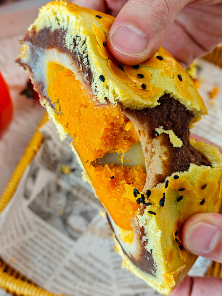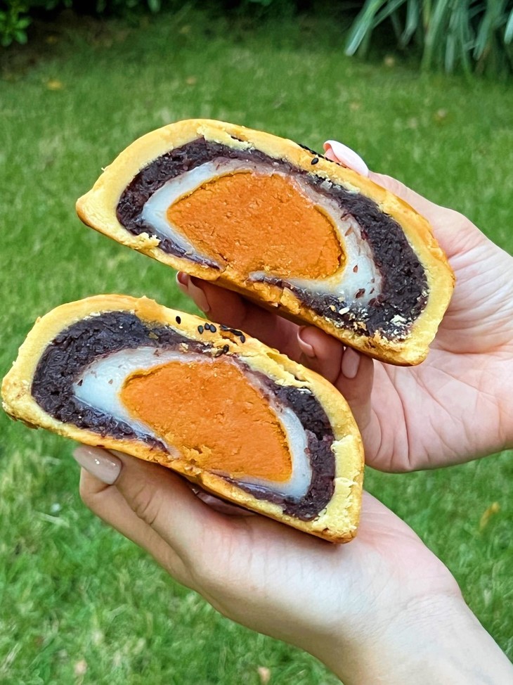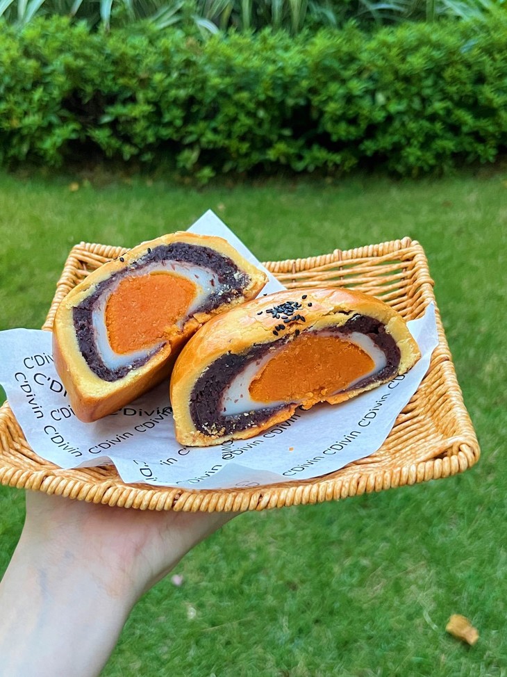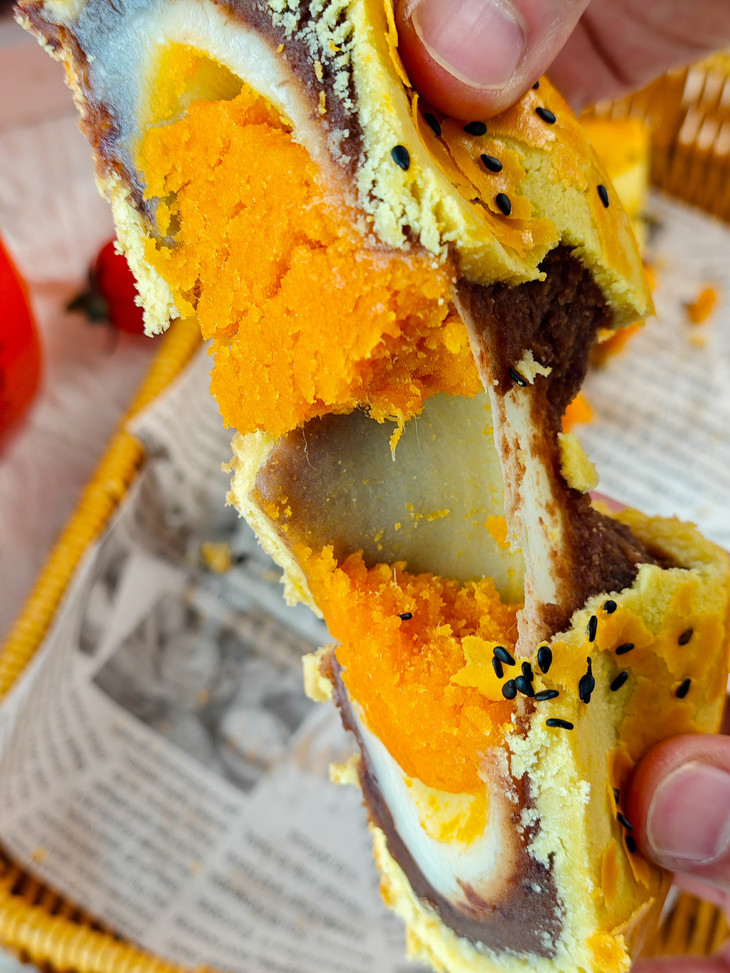 😋 料多到犯规!一口下去全是馅儿! “会拉丝!” 糯叽叽的雪媚娘,拉得老长了,就爱这个感觉! “咸蛋黄冒油!” 用的是整颗整颗的咸蛋黄,沙沙的、香香的、还流油,馋死谁了! “皮酥掉渣!” 外层酥皮刷刷掉渣,奶香味十足,吃到最后连手指头都得嘬干净!