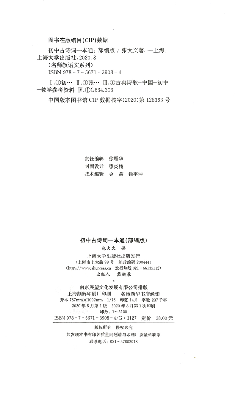 名师教语文系列 初中古诗词一本通 部编版 特级教师带你走进古诗词的天地 配套部编版新教材 张大文著 上海大学出版社