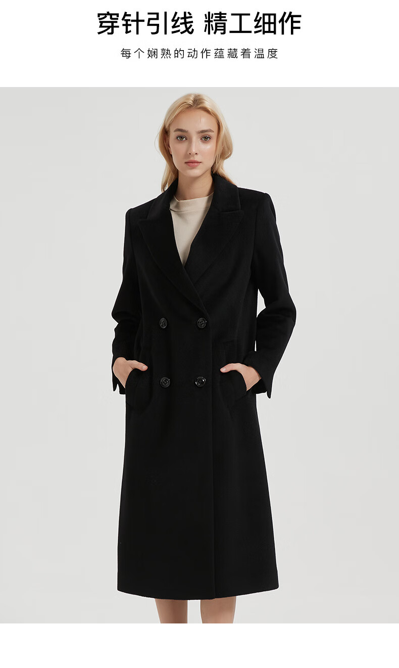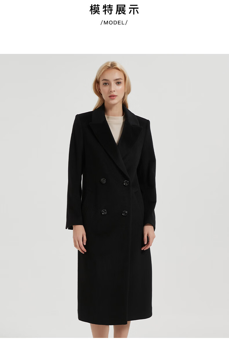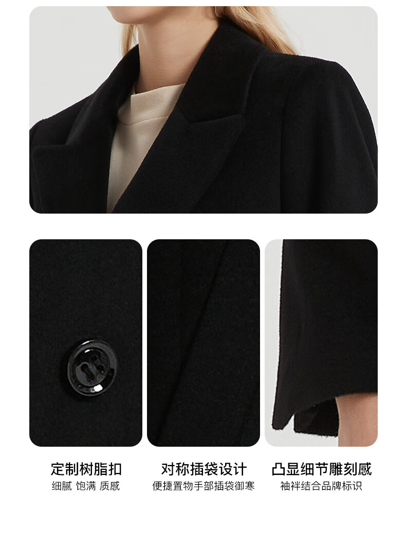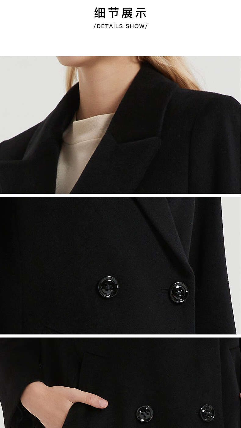 皮尔卡丹女装毛呢外套简约知性修身黑色通勤双排扣长款C44CL74B0