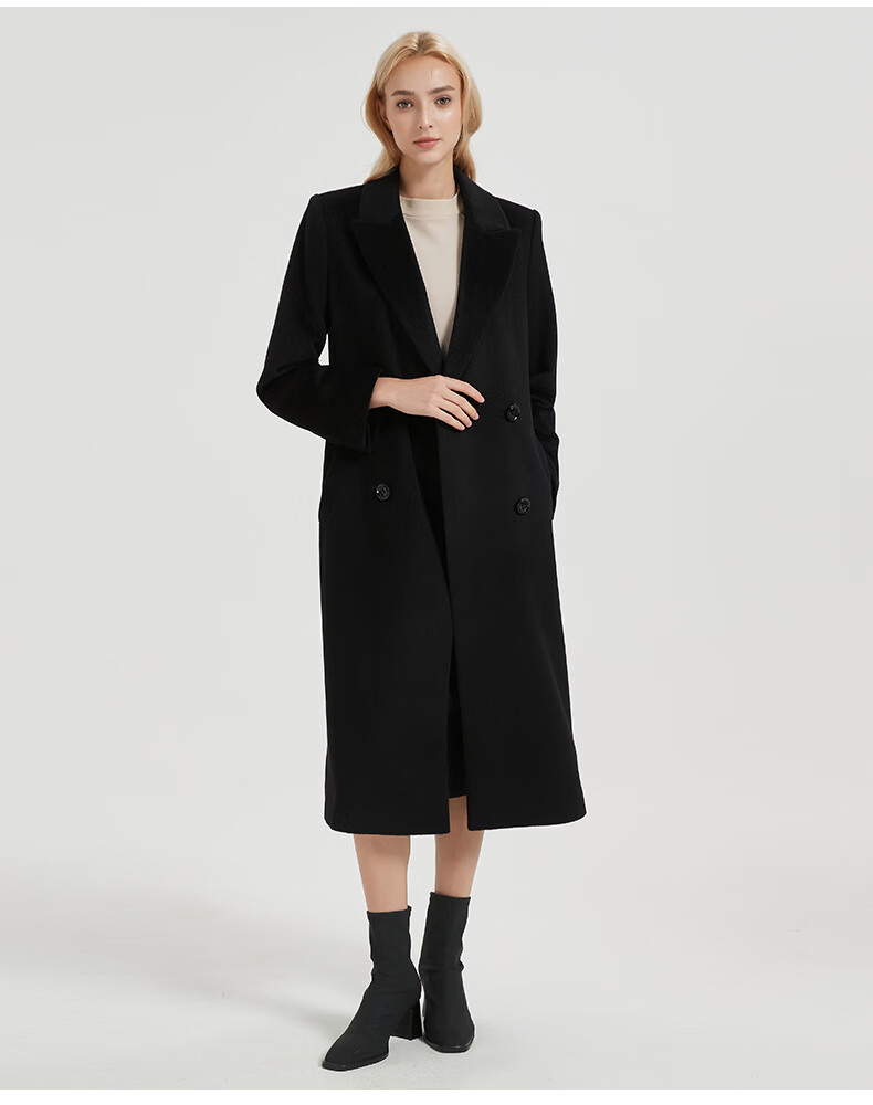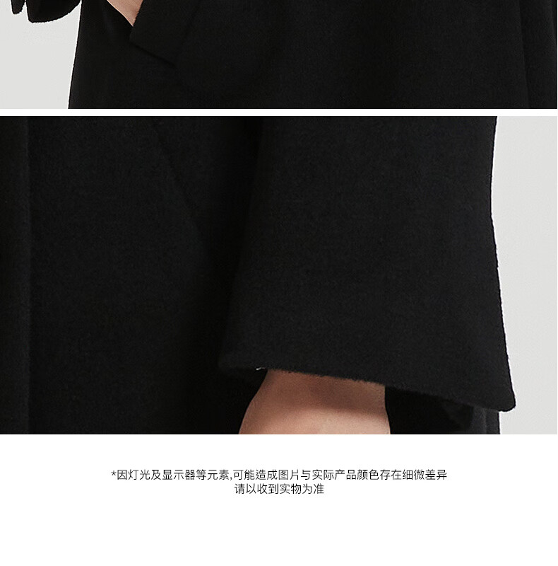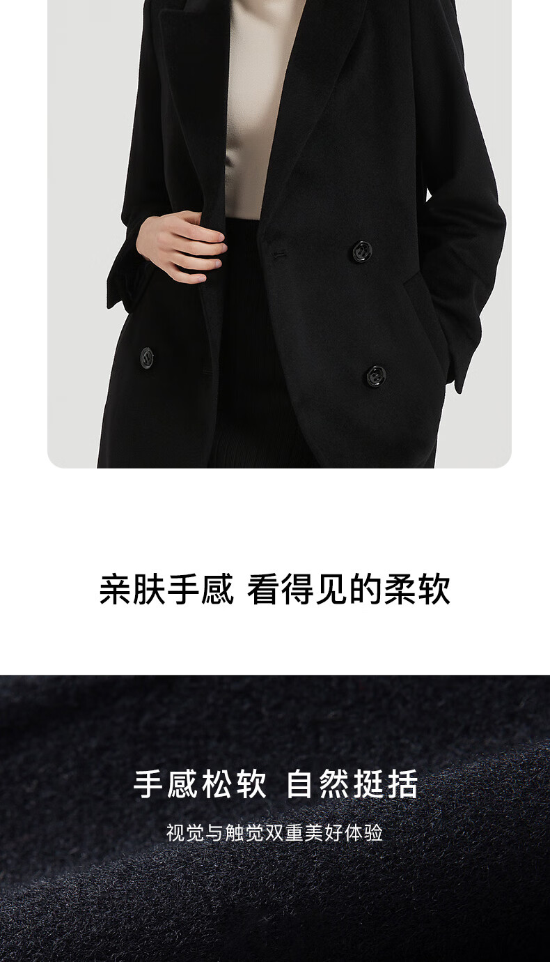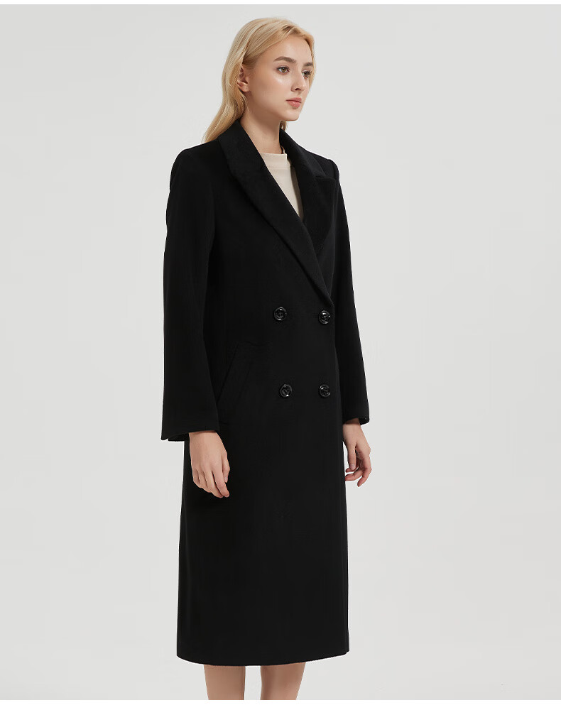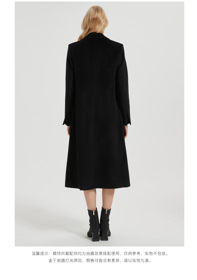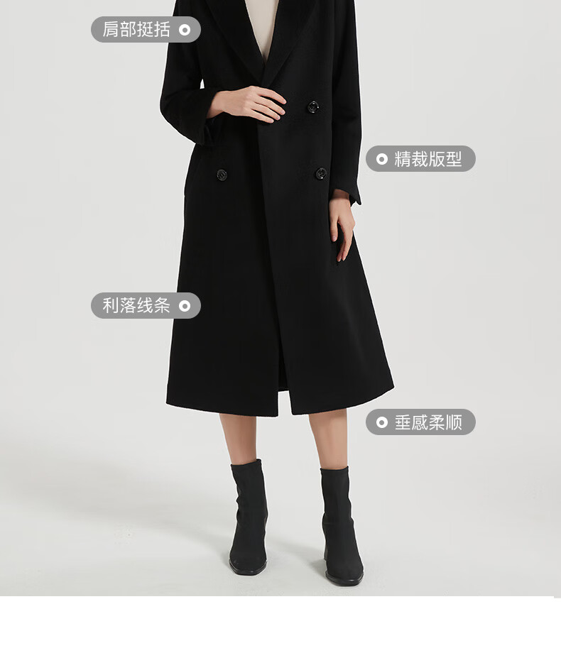 皮尔卡丹女装毛呢外套简约知性修身黑色通勤双排扣长款C44CL74B0