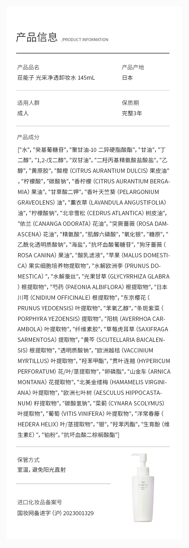 【临期!效期至26年1月】SONOKO 荘能子 光采净透卸妆水 145mL 4571509980651