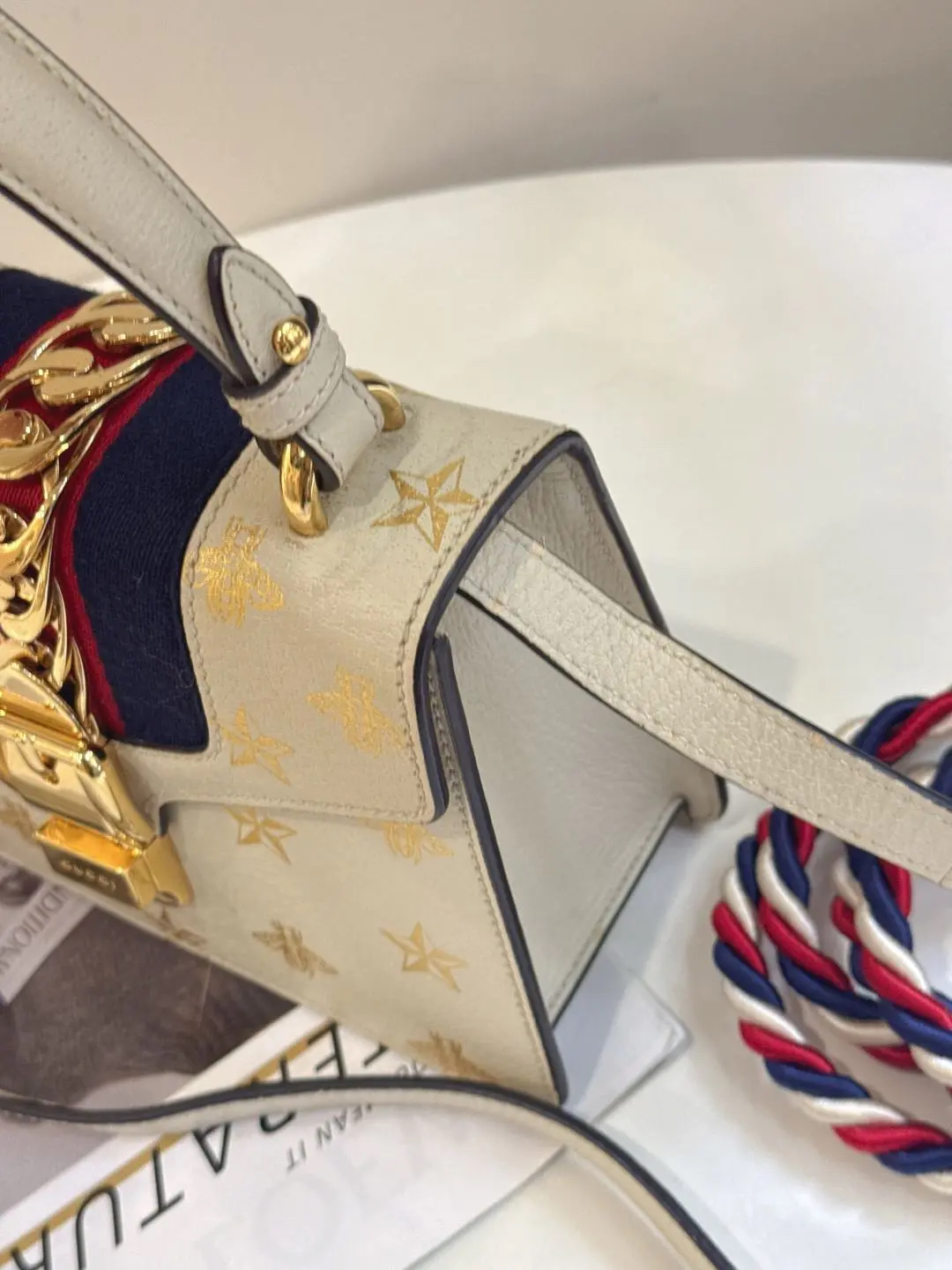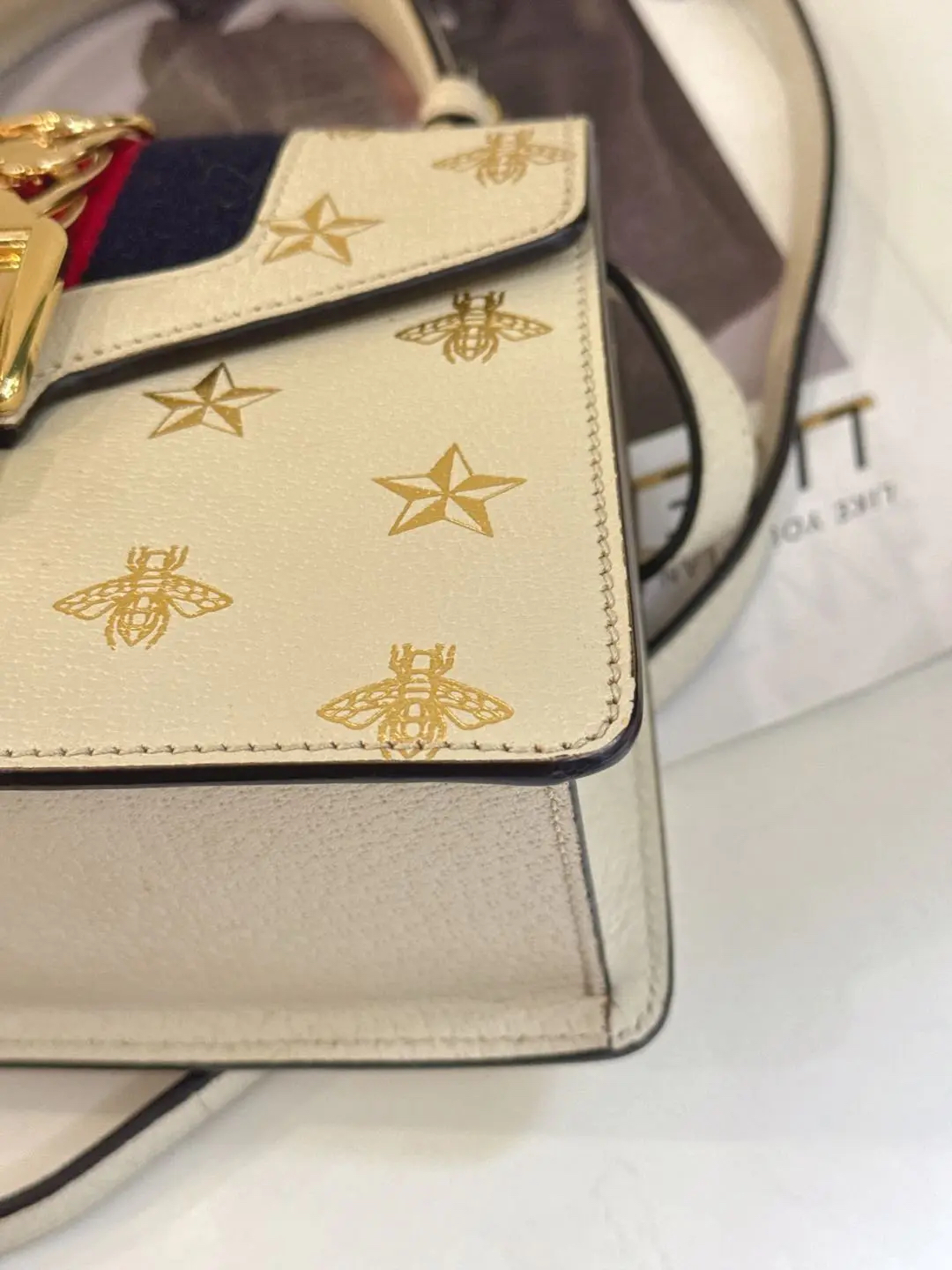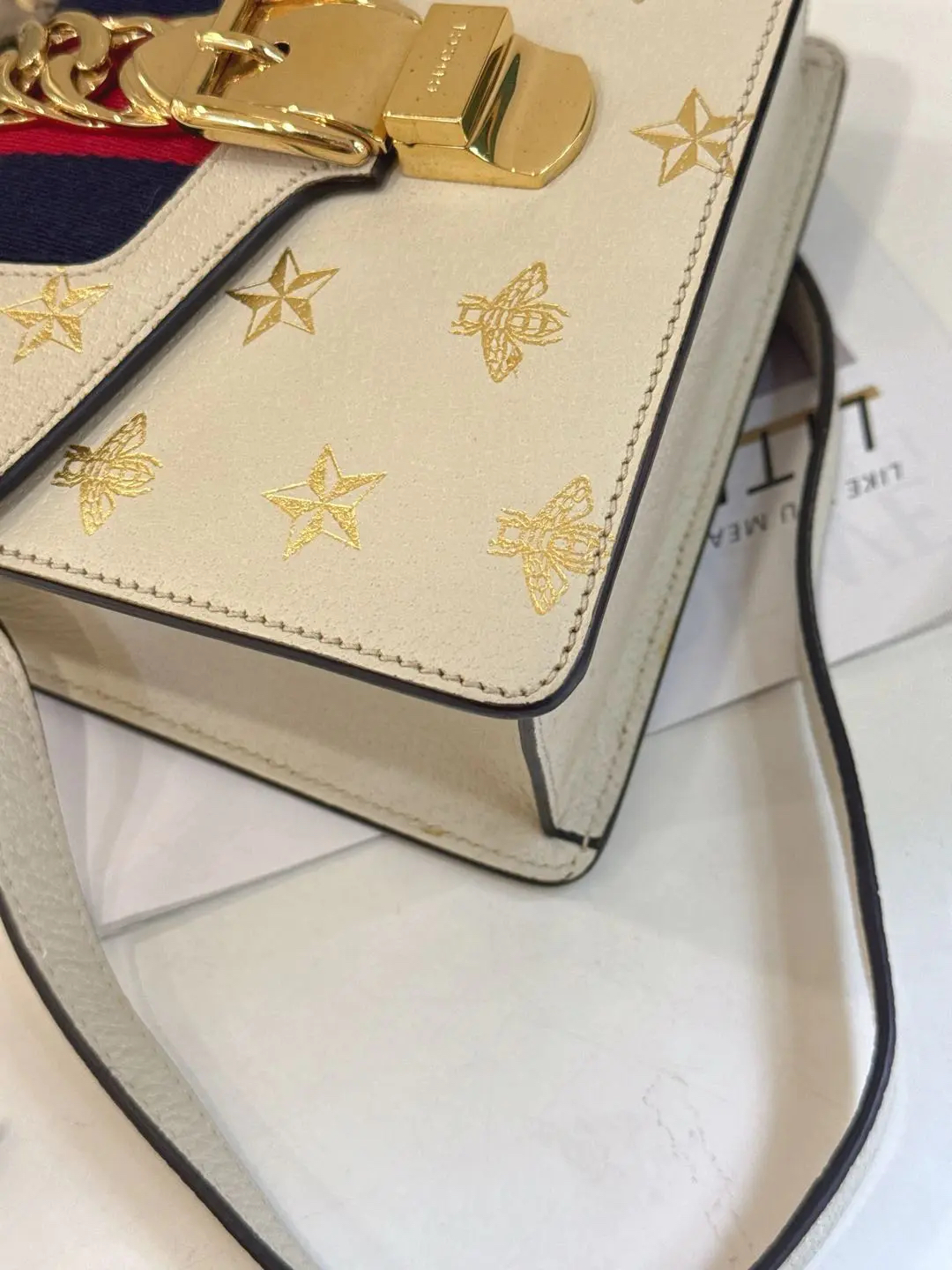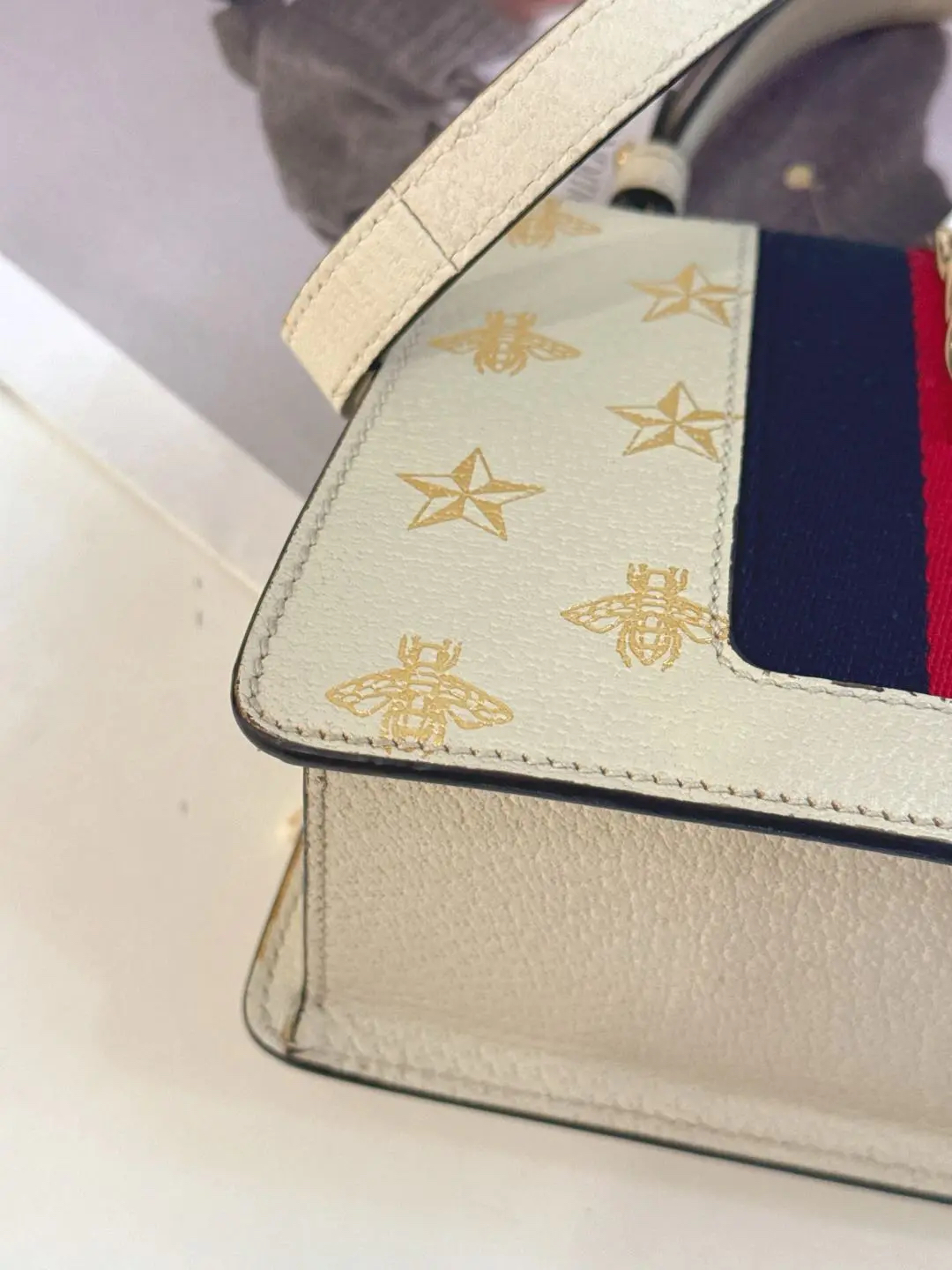 【商品详情】正品二手 GUCCI 塞尔维亚 小号 白色 蜜蜂印花 限量版 box牛皮 斜挎包👜97新 20*14 配件:票 肩带*2 手提带 防尘袋。活泼年轻且百搭😆