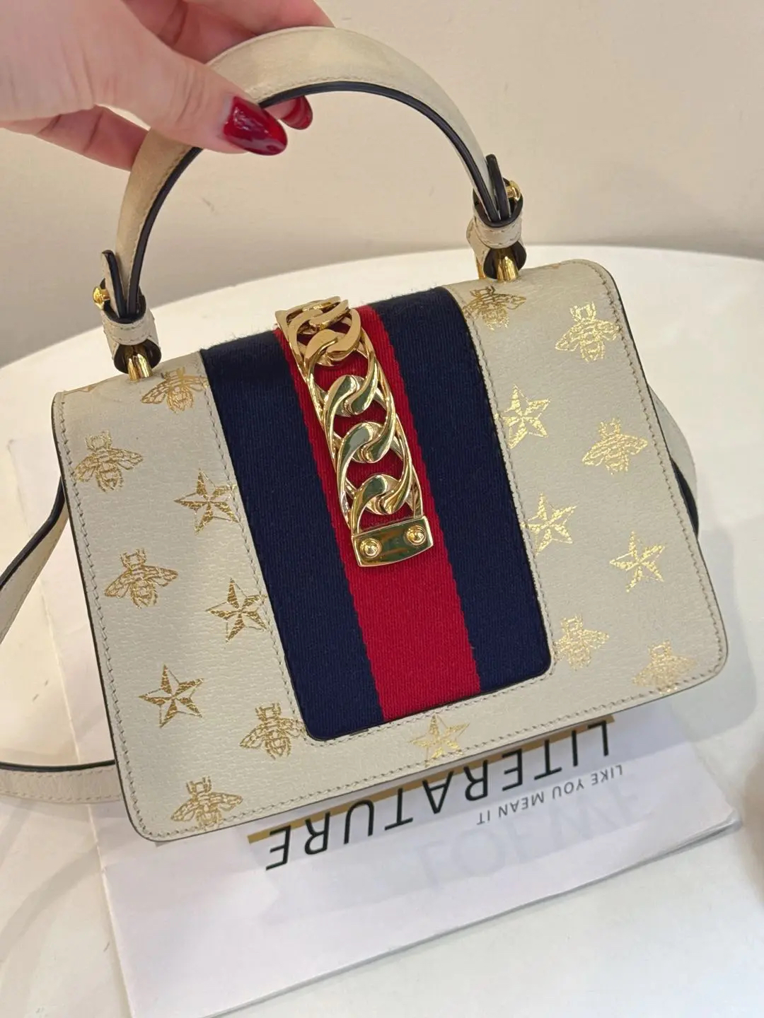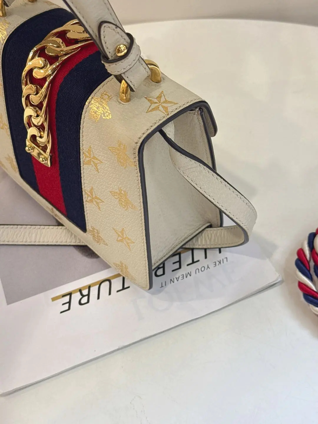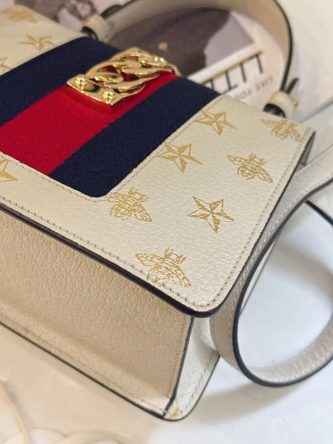 【商品详情】正品二手 GUCCI 塞尔维亚 小号 白色 蜜蜂印花 限量版 box牛皮 斜挎包👜97新 20*14 配件:票 肩带*2 手提带 防尘袋。活泼年轻且百搭😆