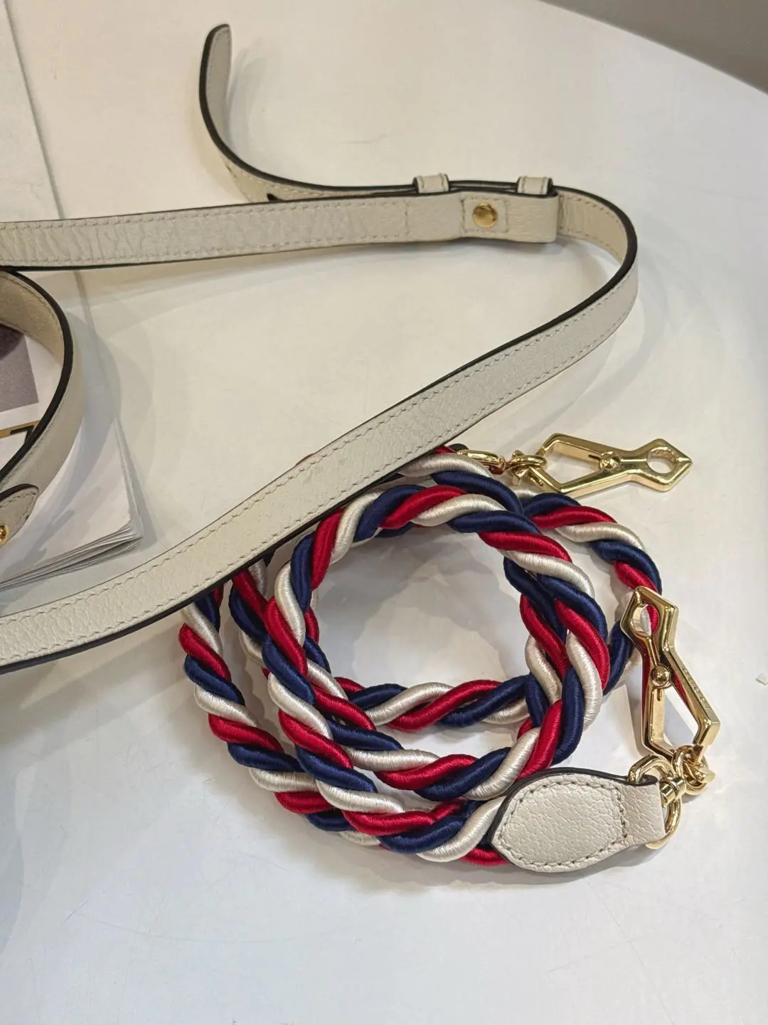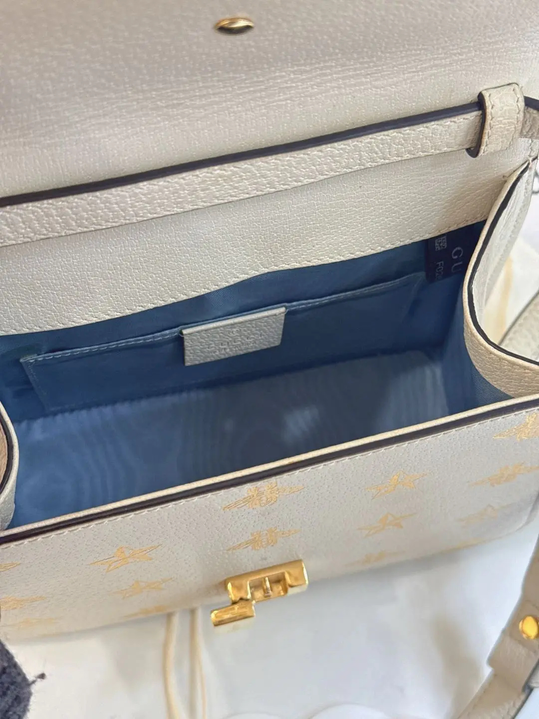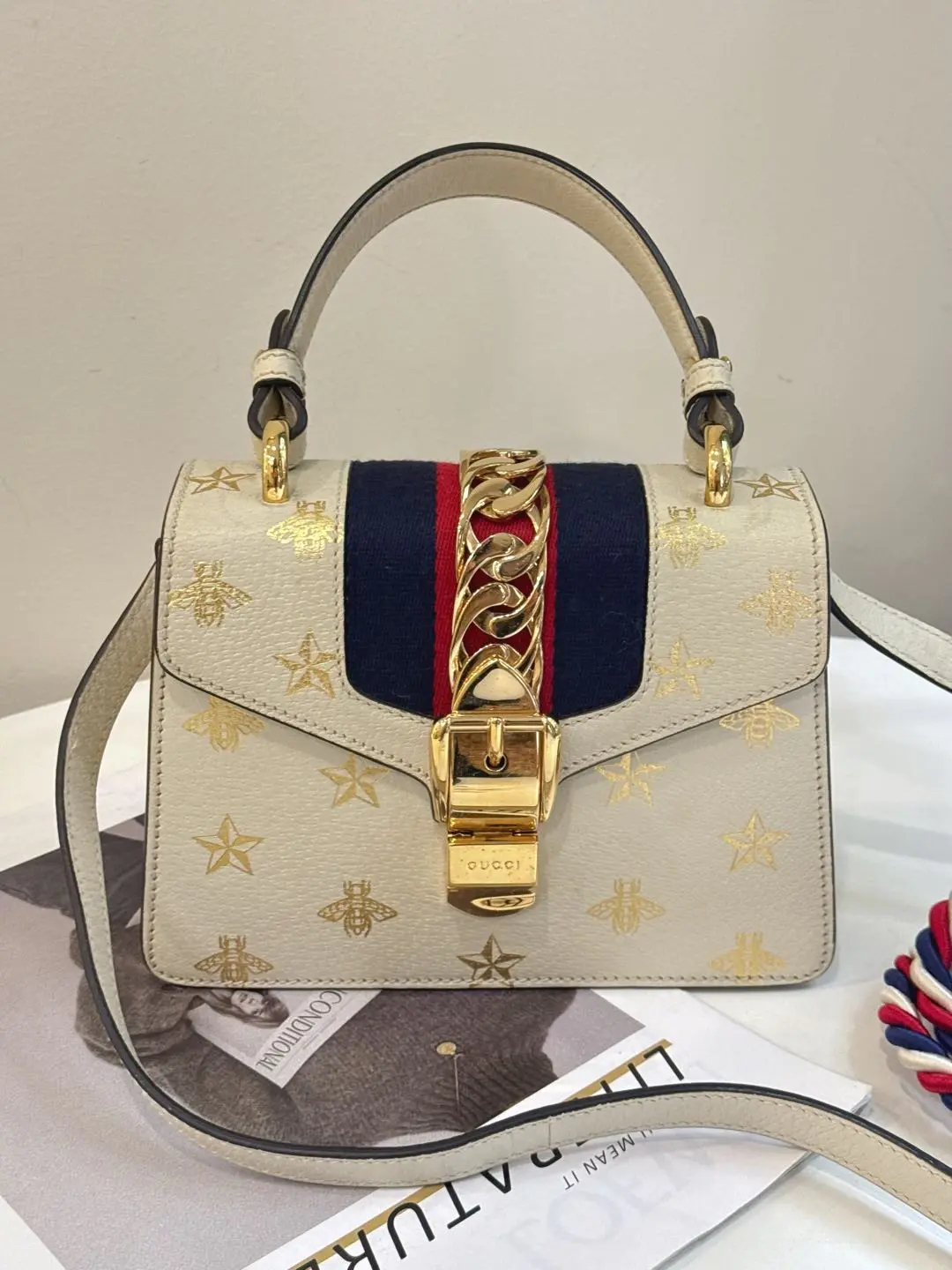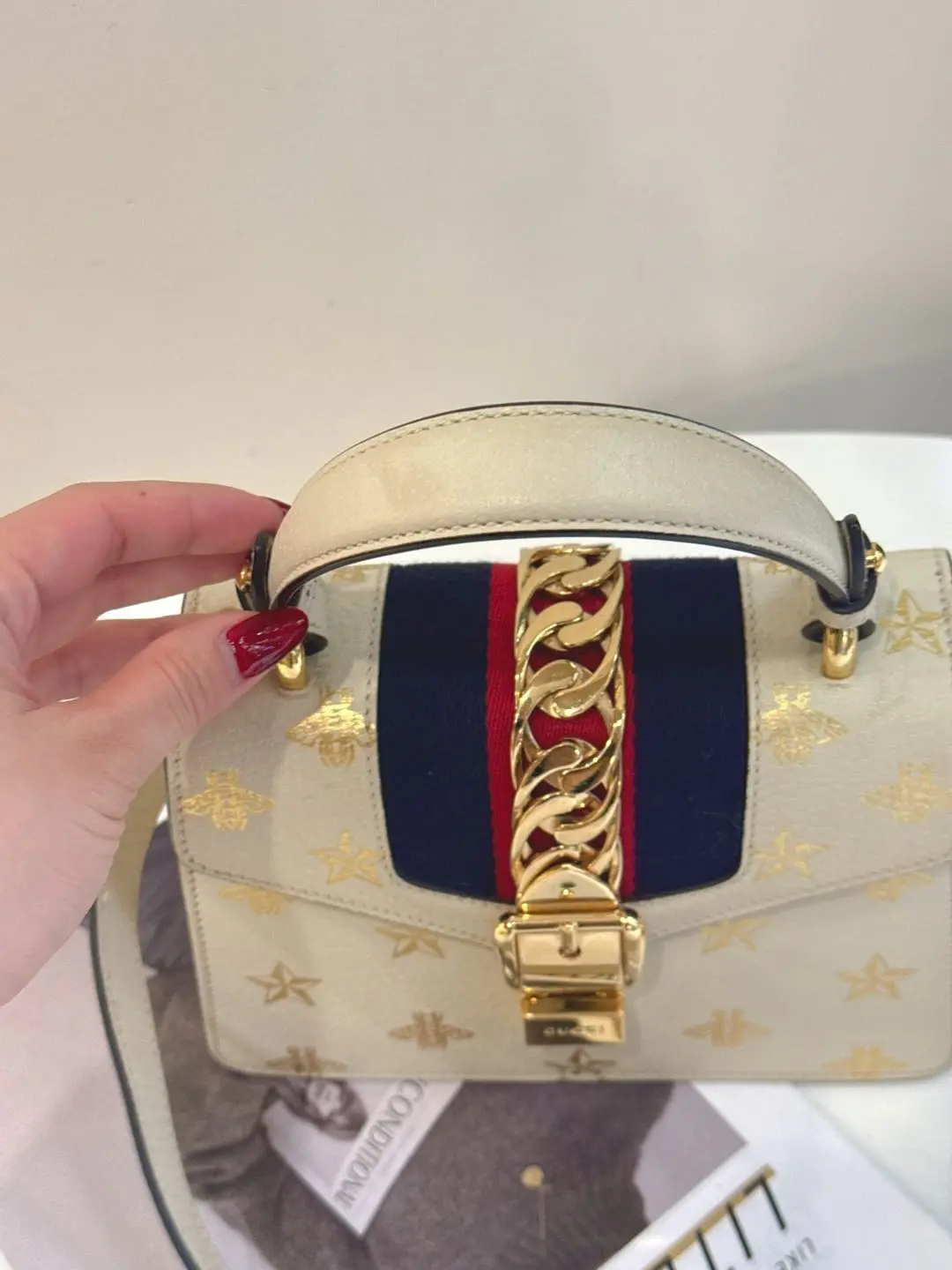 【商品详情】正品二手 GUCCI 塞尔维亚 小号 白色 蜜蜂印花 限量版 box牛皮 斜挎包👜97新 20*14 配件:票 肩带*2 手提带 防尘袋。活泼年轻且百搭😆