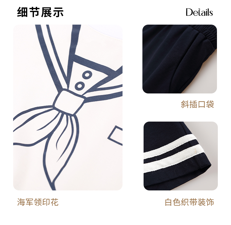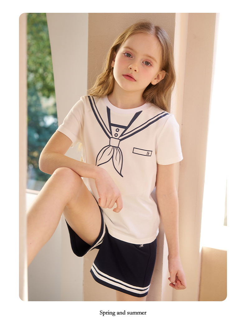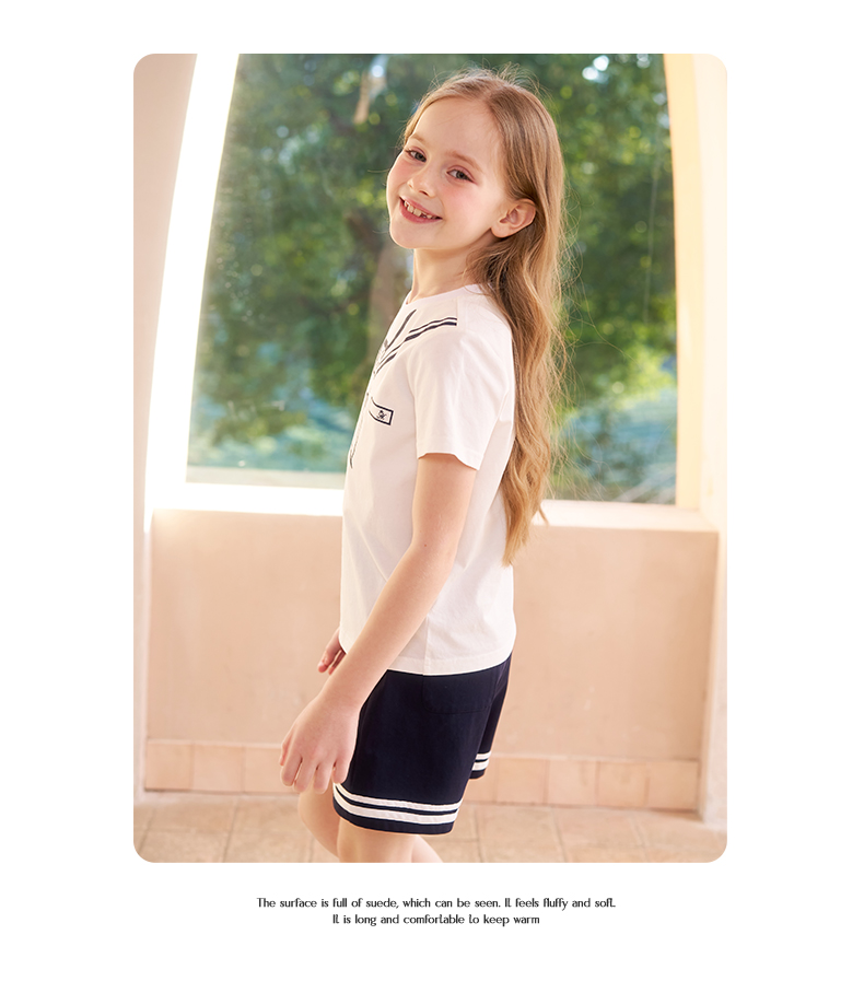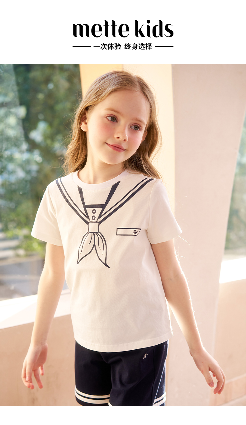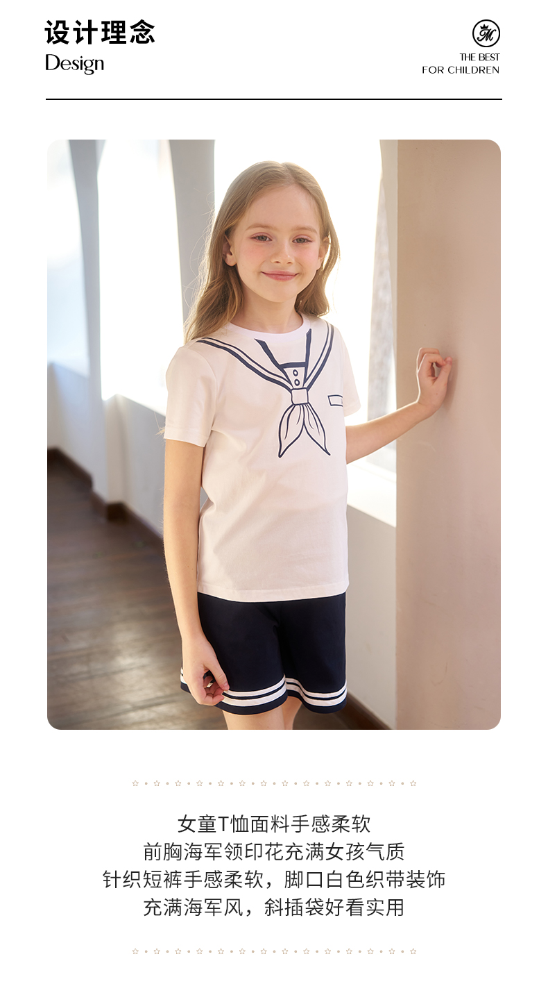 mettekids女童套装夏季海军风短袖t恤儿童短裤中大童洋气凉感童装