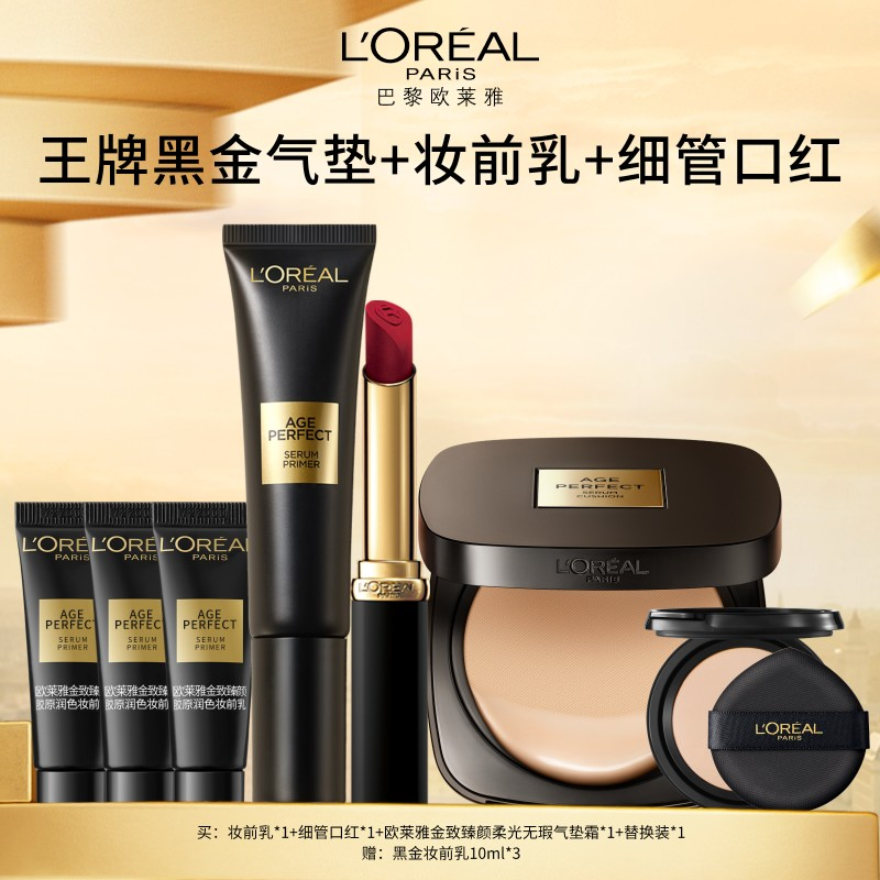 【欧莱雅】黑金气垫+黑金替换芯+黑金妆前乳+细管口红