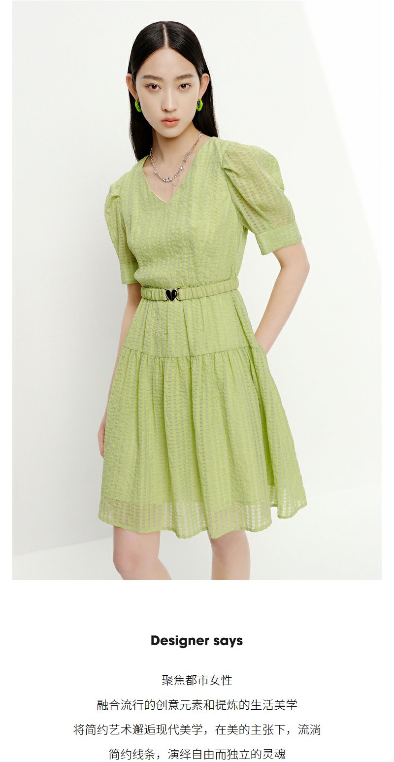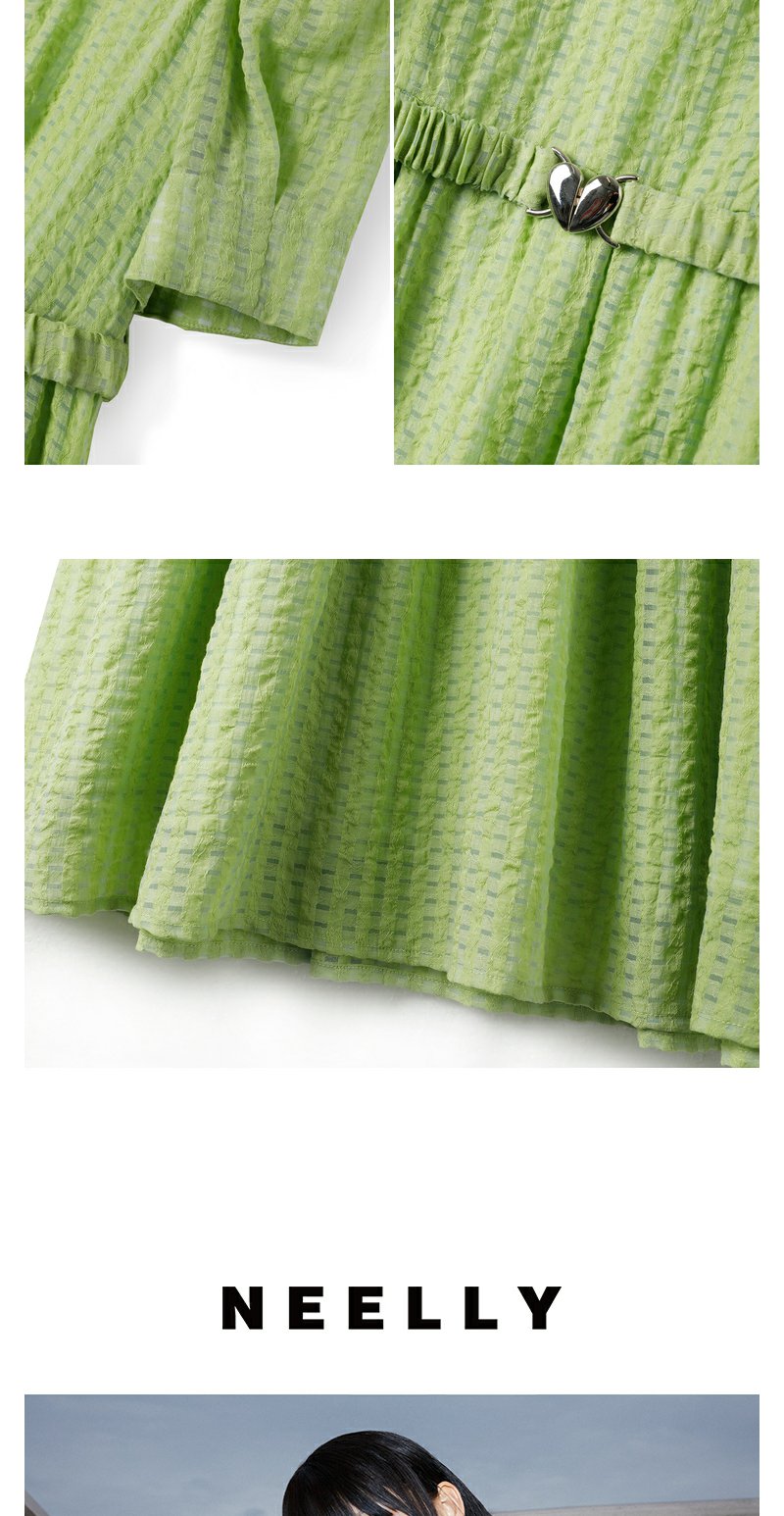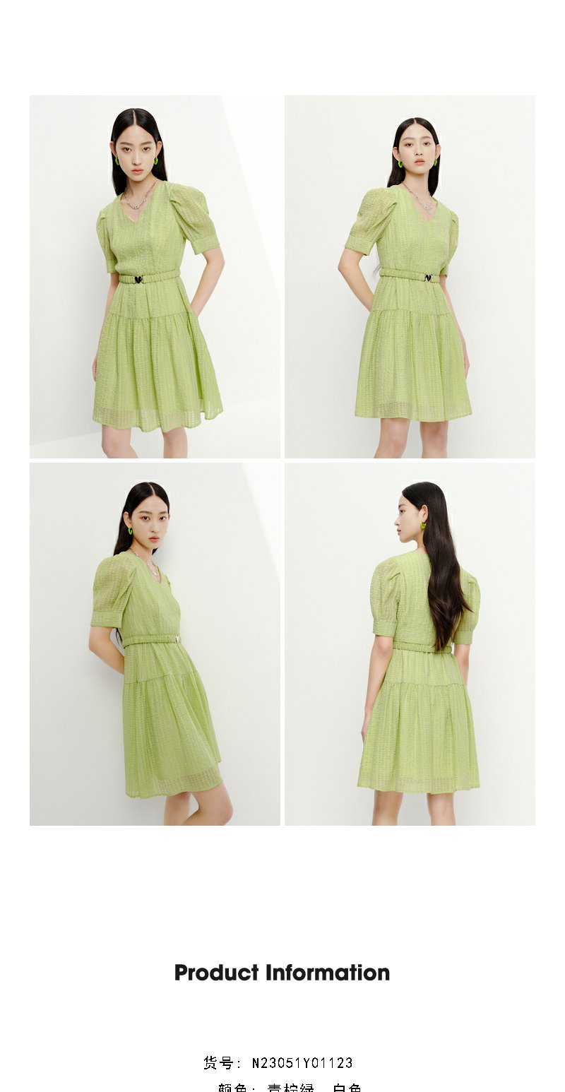 NEELLY纳俪商场同款V领连衣裙女中长款泡泡袖收腰系带A字裙轻薄夏N23051Y01123