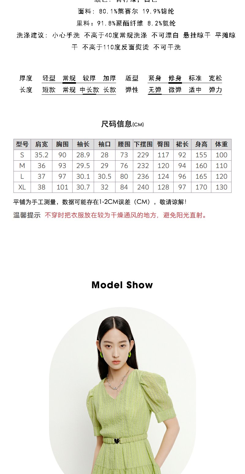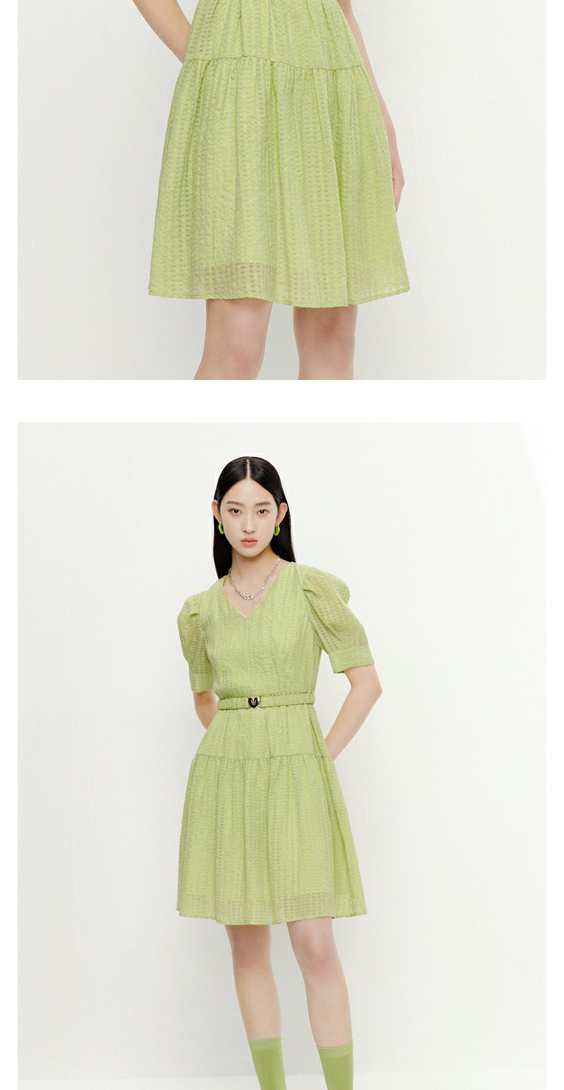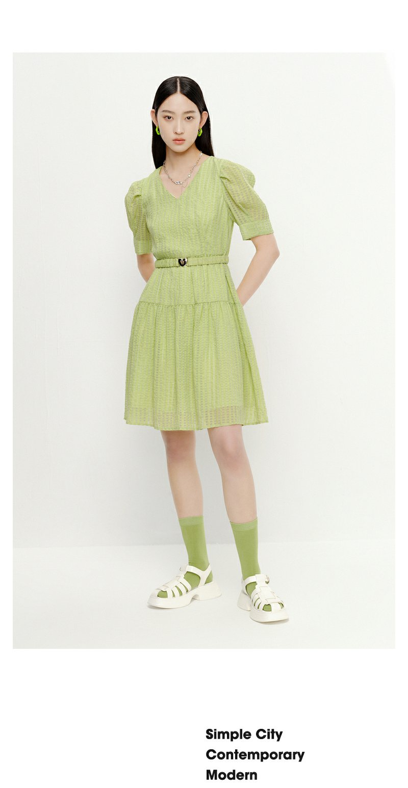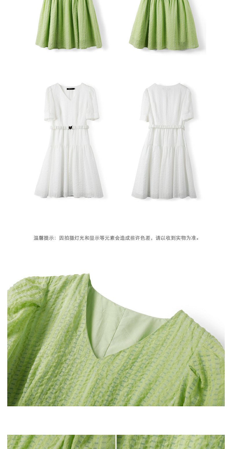 NEELLY纳俪商场同款V领连衣裙女中长款泡泡袖收腰系带A字裙轻薄夏N23051Y01123