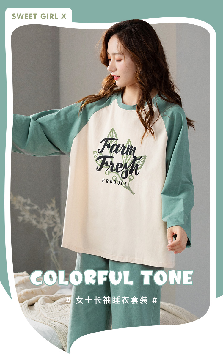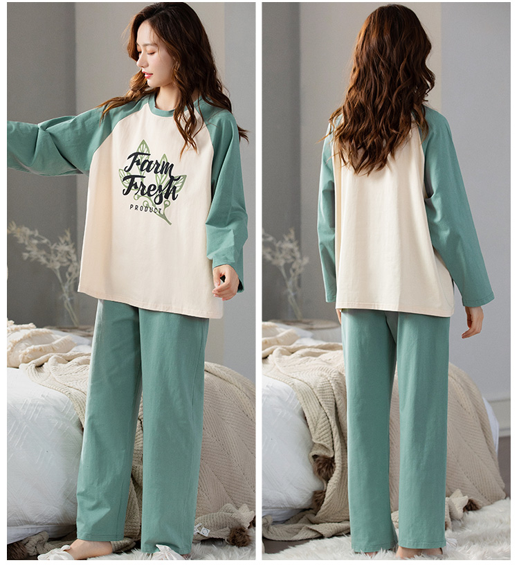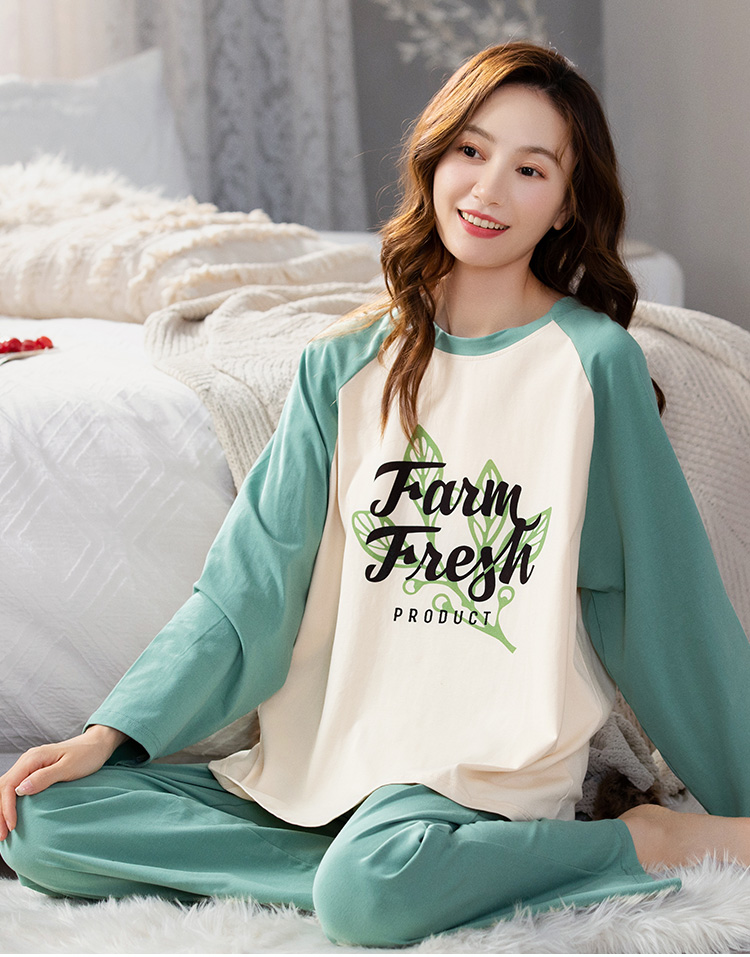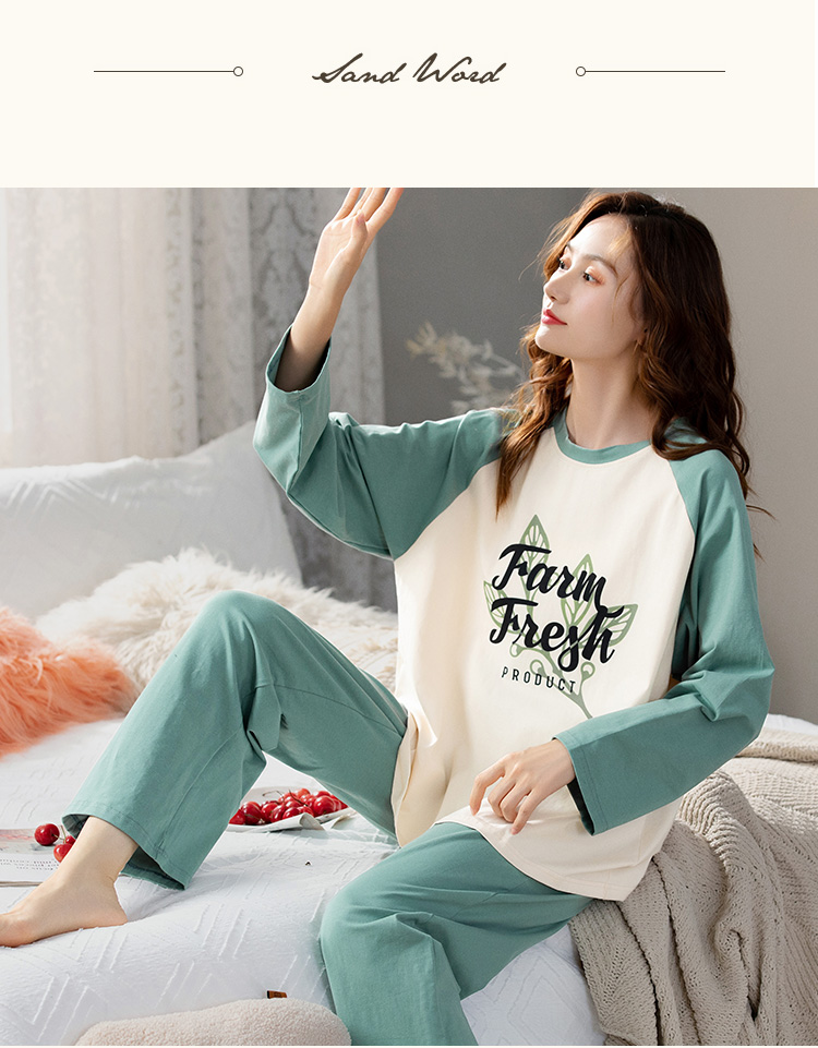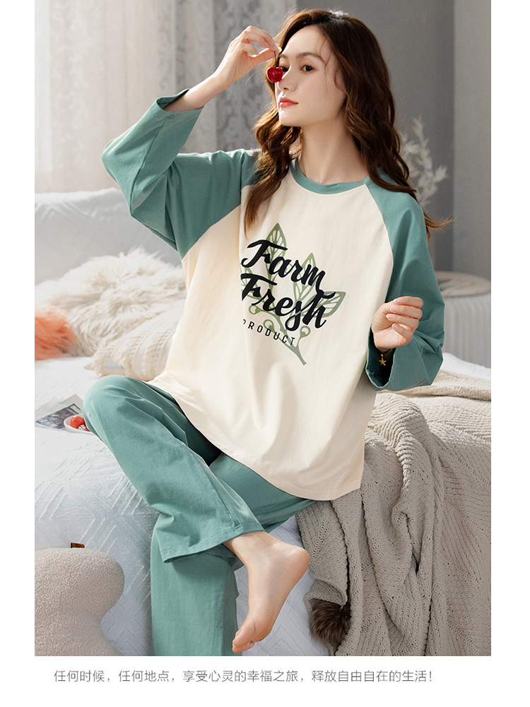 洁丽雅内衣全棉字母圆领长袖长裤睡衣女士家居服套装