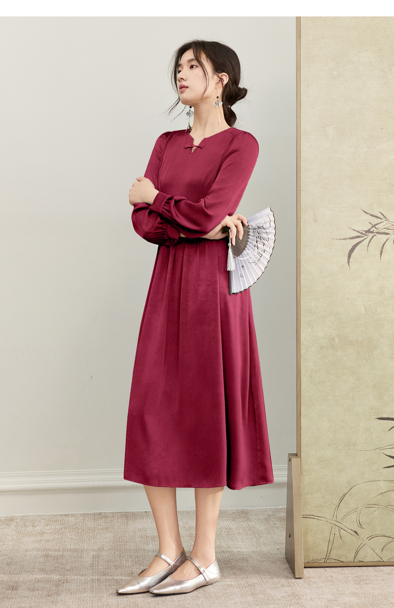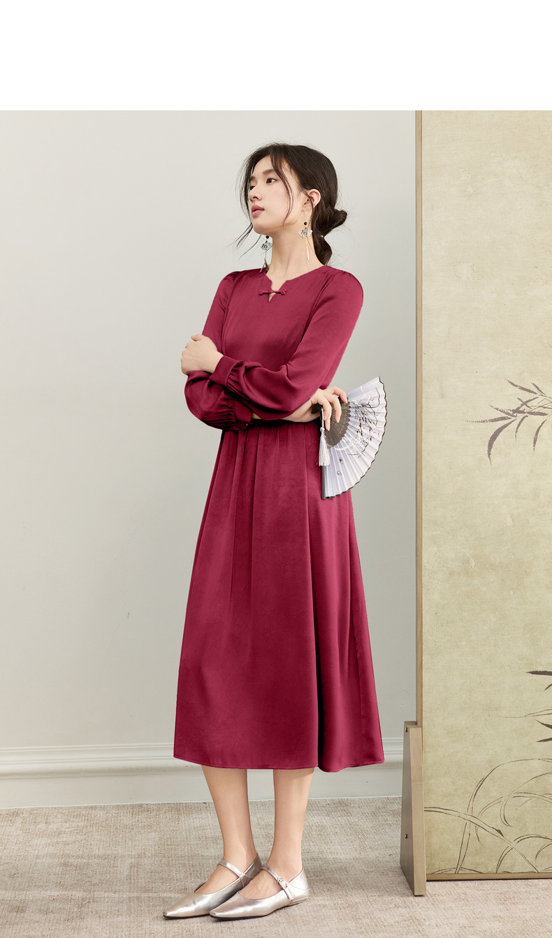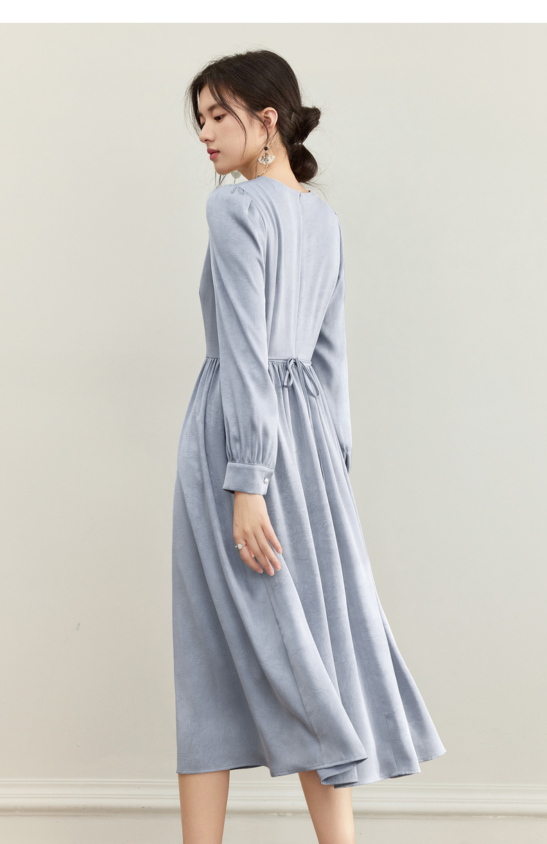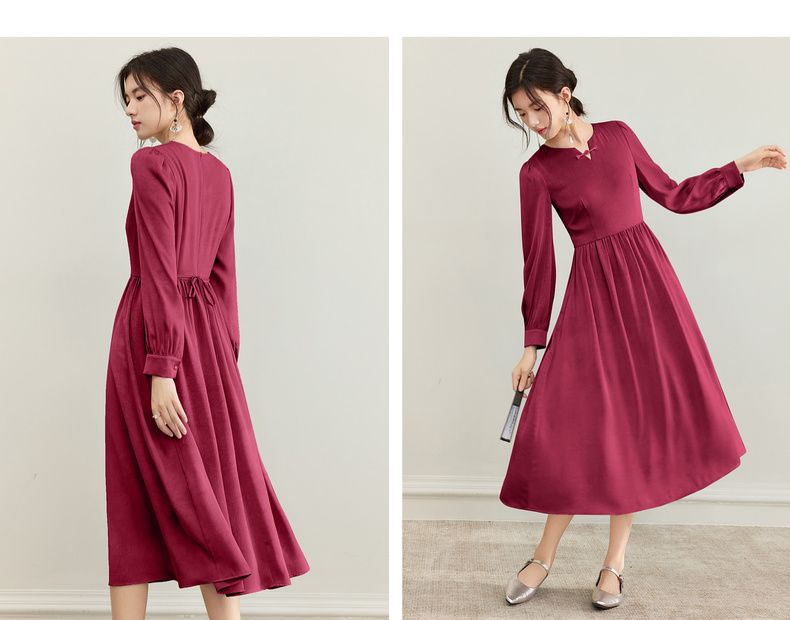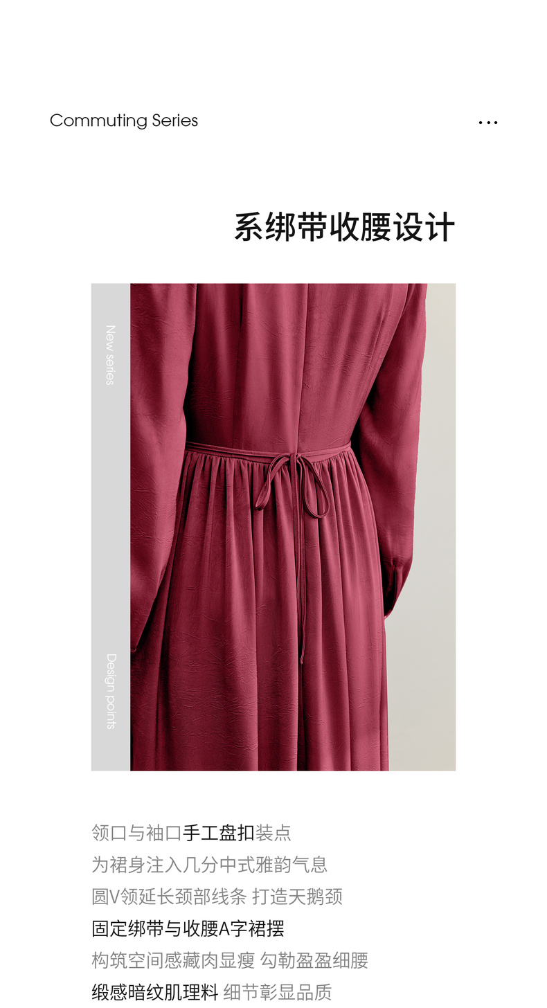 【内购】【藏肉显瘦】优雅通勤圆V领盘扣系绑带收腰哑光肌理缎感连衣裙-153LI2638