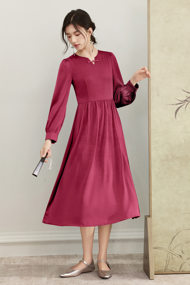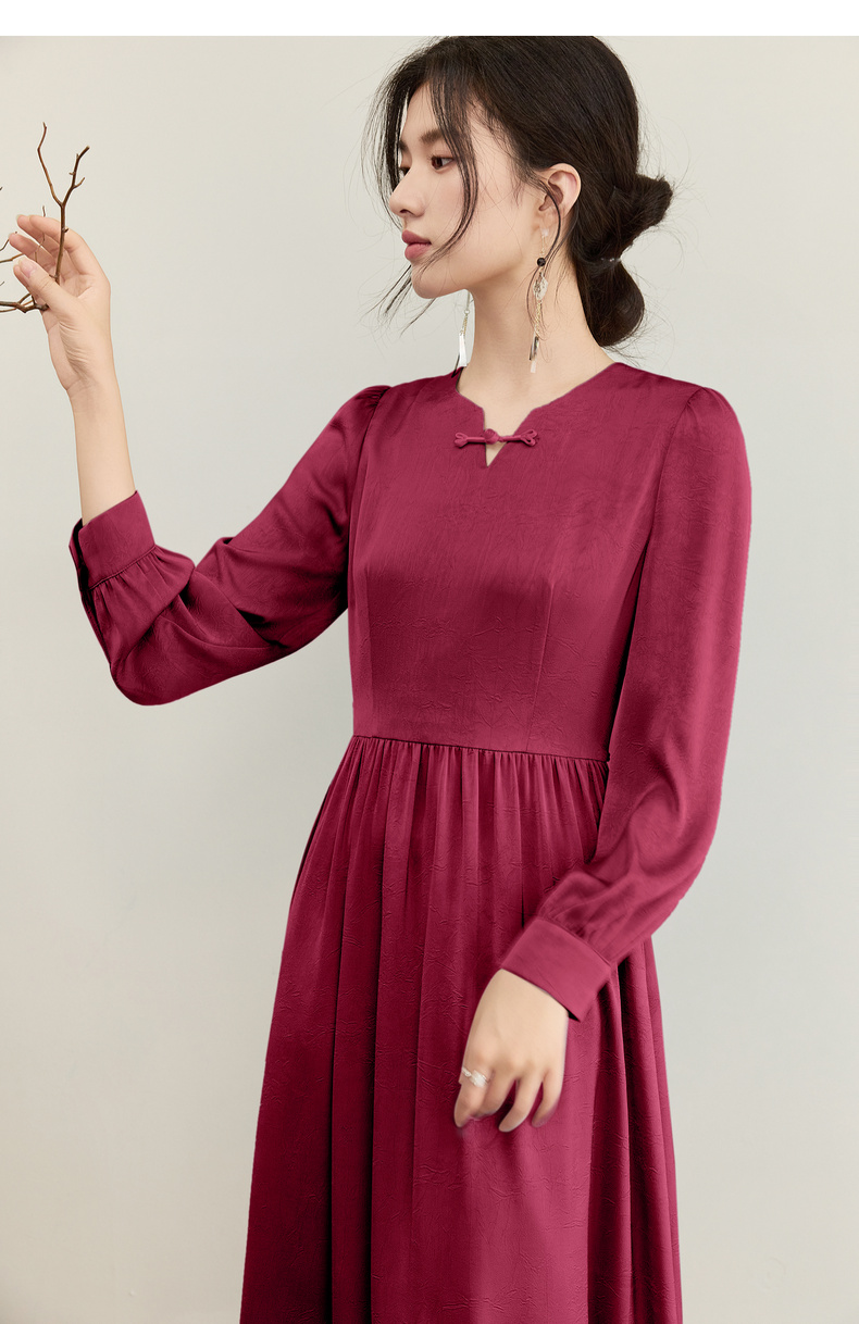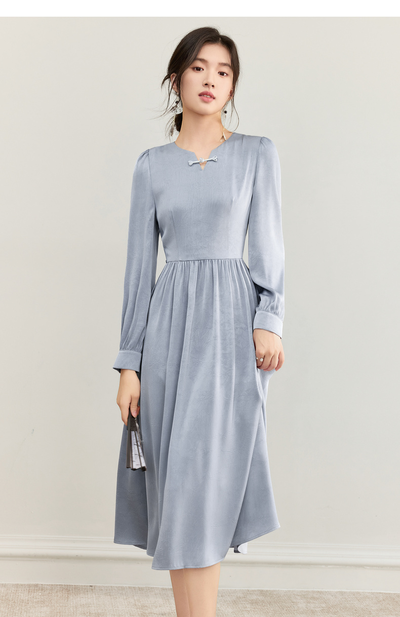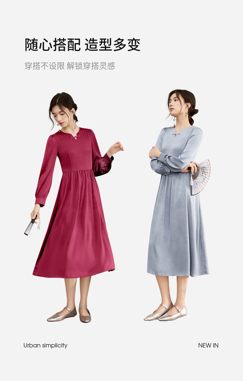 【内购】【藏肉显瘦】优雅通勤圆V领盘扣系绑带收腰哑光肌理缎感连衣裙-153LI2638
