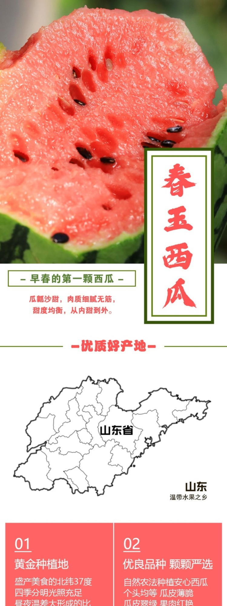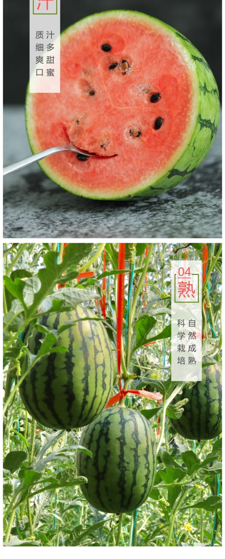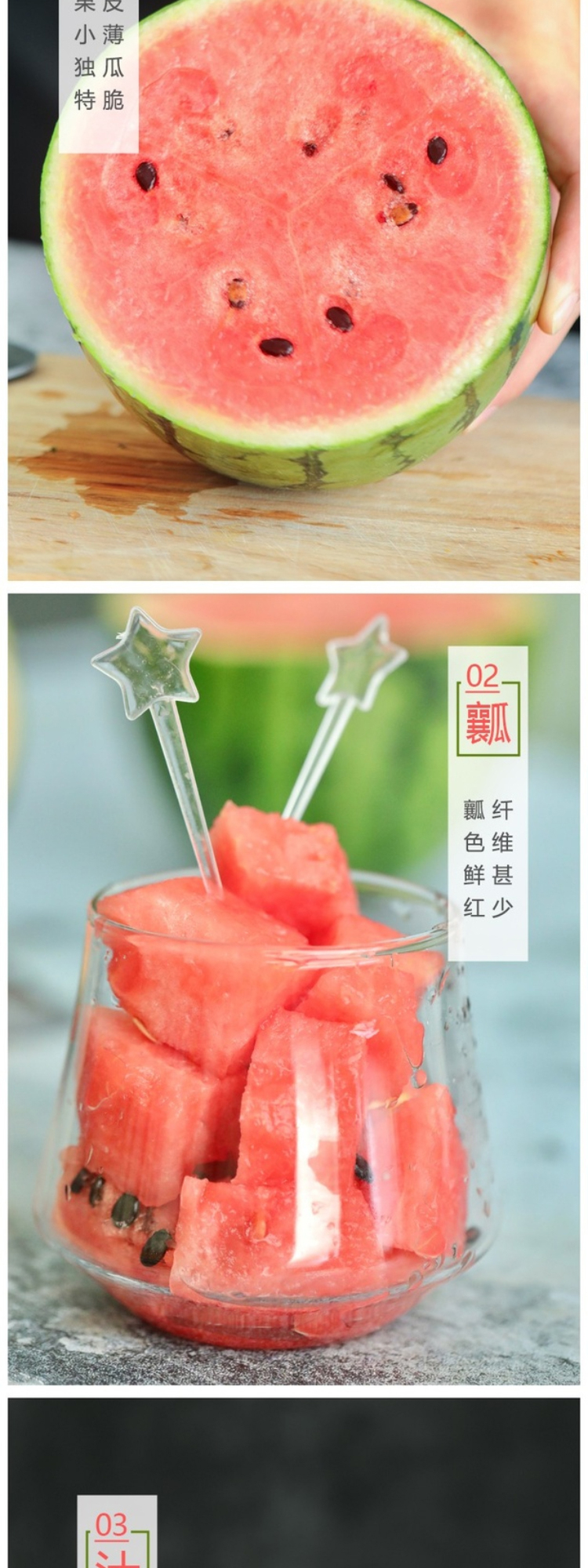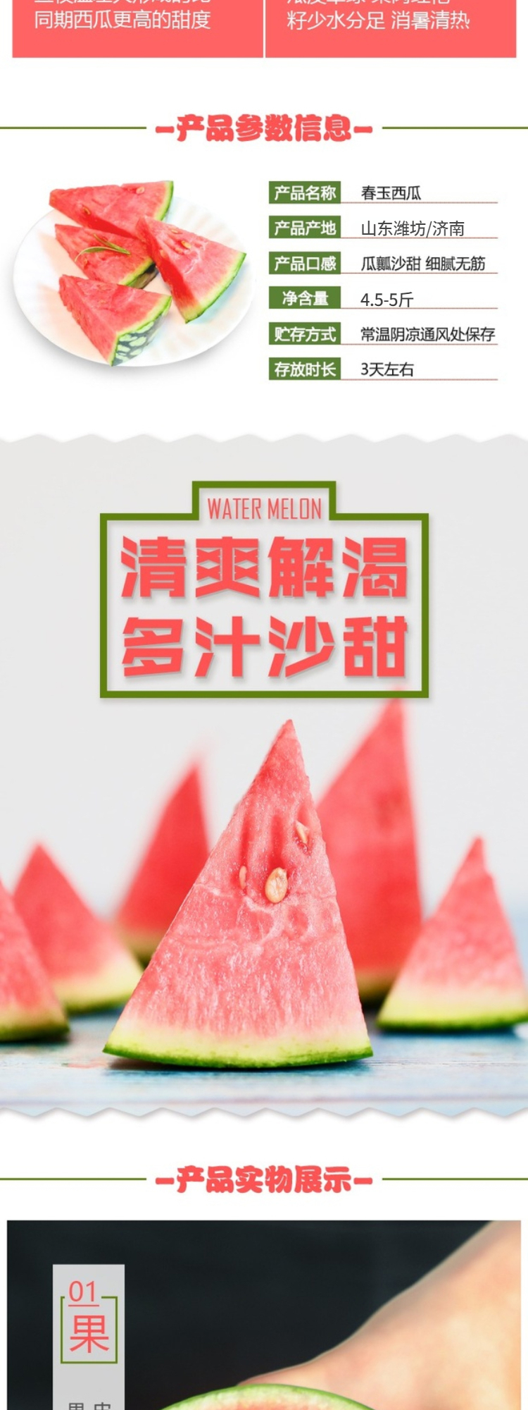【产品卖点】香气纯正,瓜皮翠绿,果肉红艳,皮薄且脆,可以徒手剥皮,水分足,无渣无纤维,甘甜如冰糖,昼夜温差大,比同期西瓜更高的甜度,甜度均衡,吃到瓜皮部分也是甜的,不使用任何农药化肥,自然农法种植安心西瓜,精致个头,不会太大一次吃不完,消暑清热,补充水分和维生素。