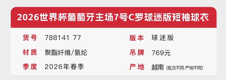小李子彪马2026世界杯葡萄牙7号C罗主场球迷版短袖球衣788141 77