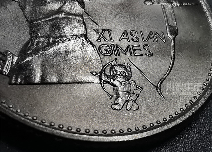 背面图景:依次分别为:(1)射箭运动员形象,运动会吉祥物———熊猫盼盼和1元的面值;(2)舞剑运动员形象,运动会吉祥物———熊猫盼盼和1元的面值。