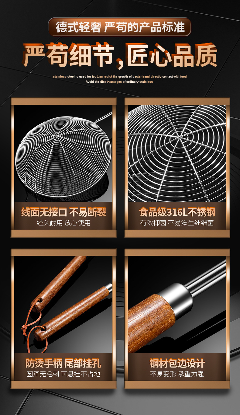 【跨境出口德国316不锈钢大漏勺】316不锈钢线漏厨房加大沥水勺多用途带滤网笊篱加长防烫柄大漏勺