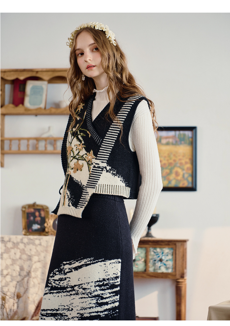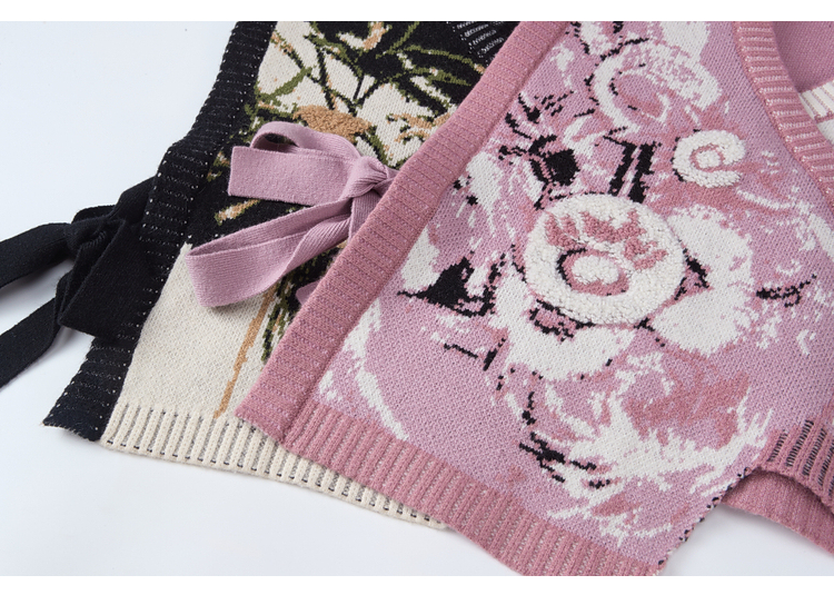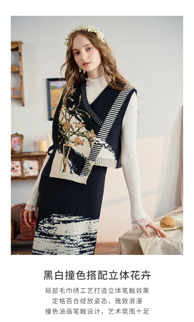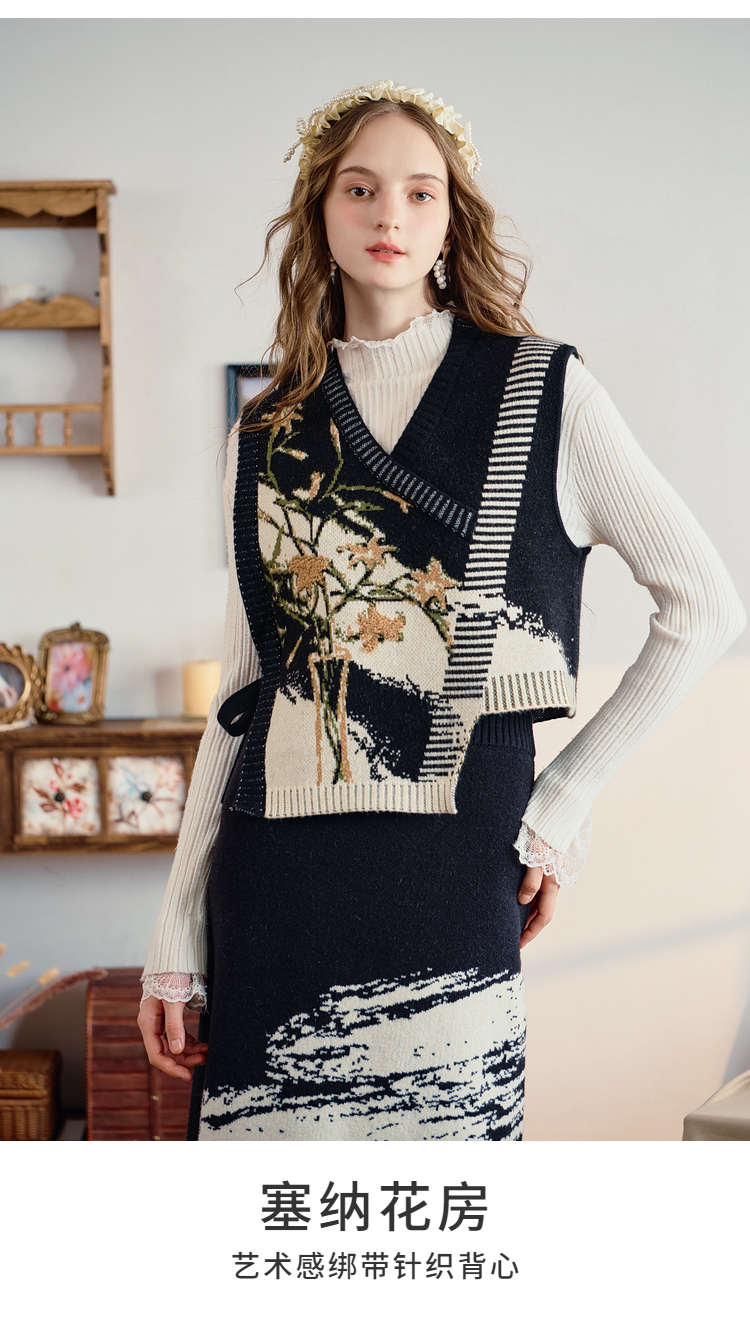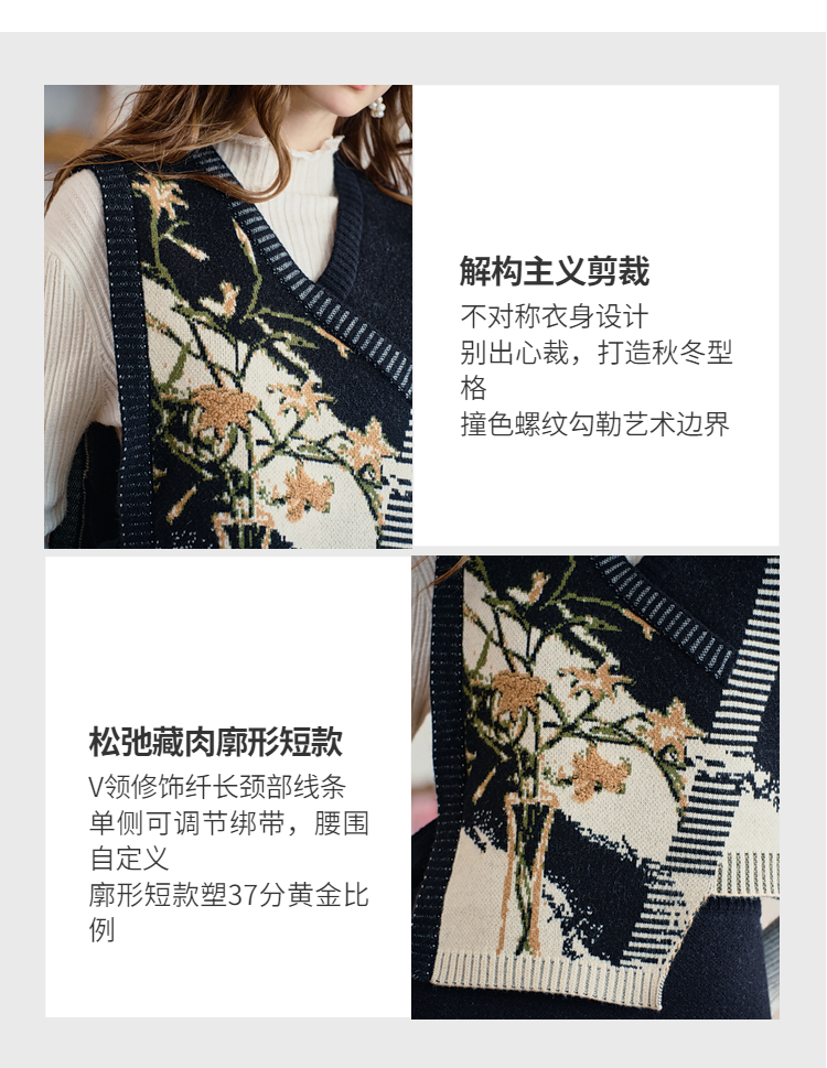 两三事梵高文艺塞纳花房2025冬新款毛巾绣绑带花色毛织马甲女宽松