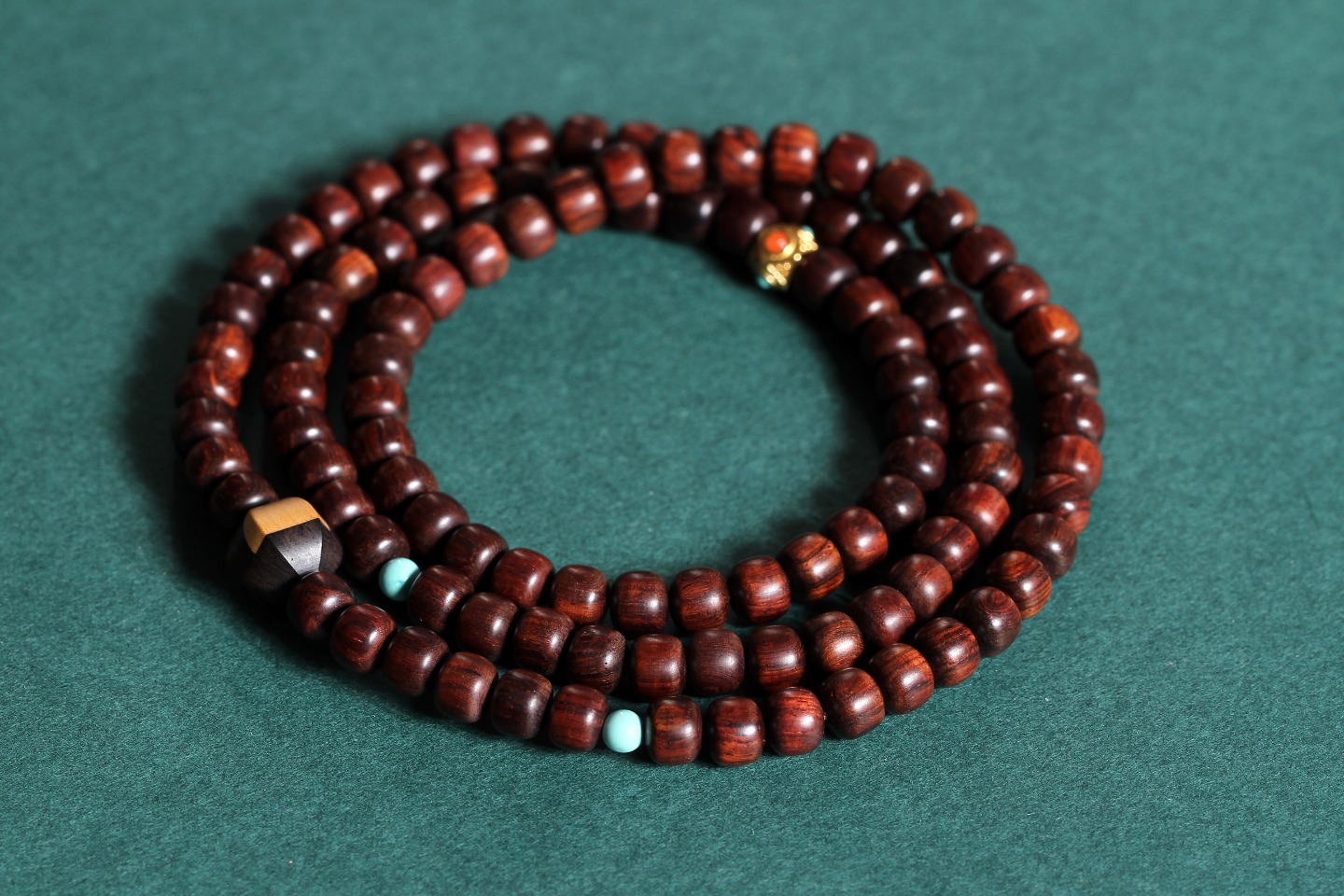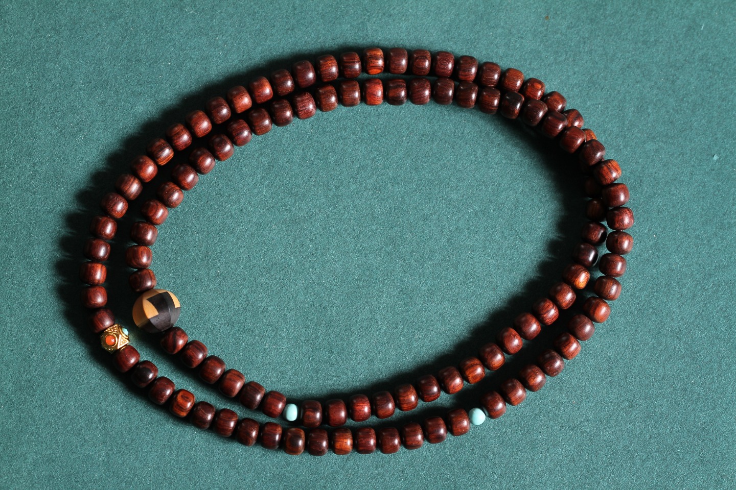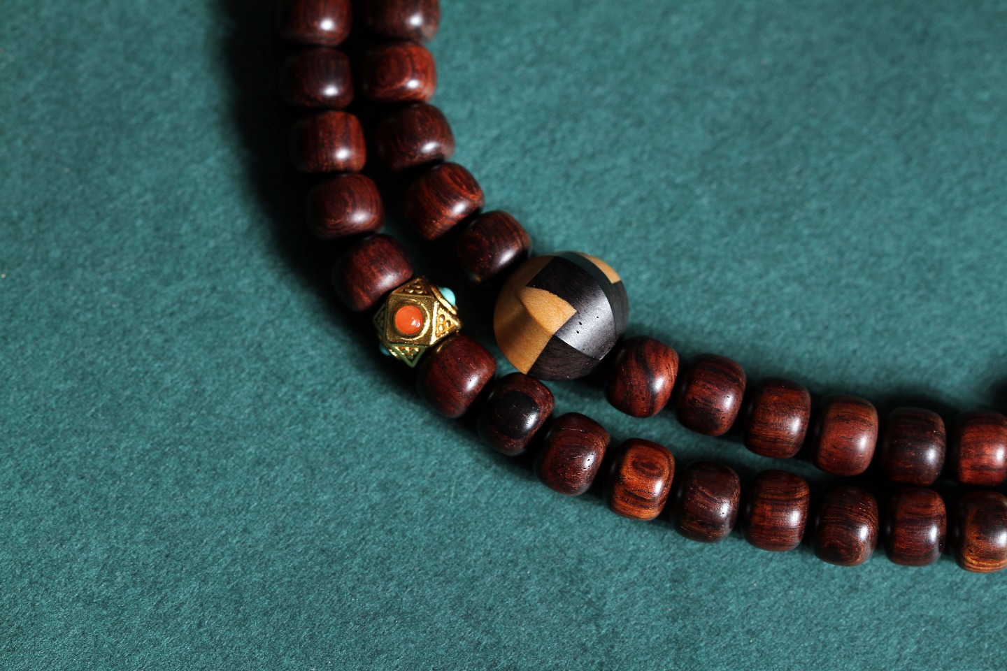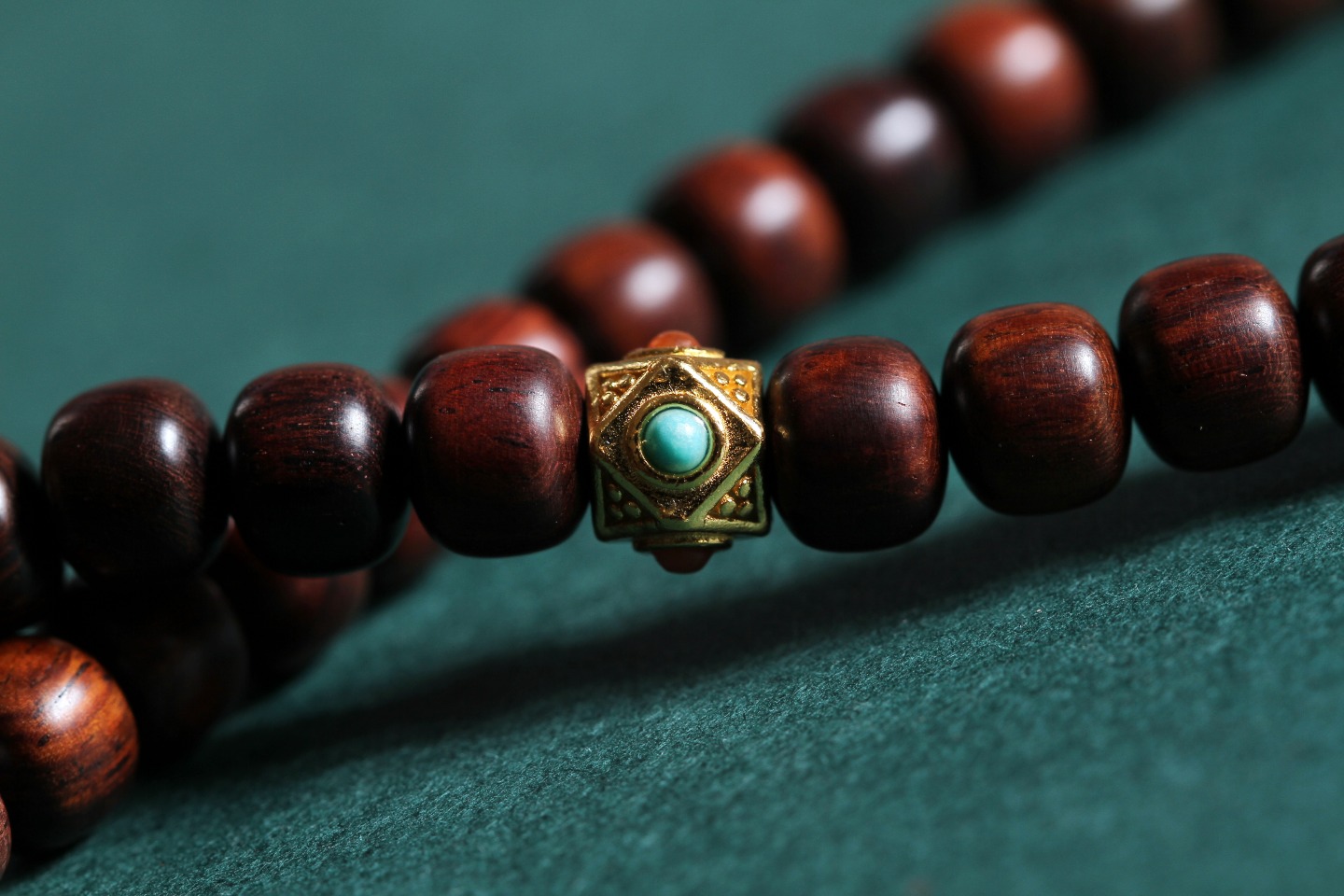 搭配:紫光檀双拼黄杨木瓜棱双色珠(银管)/24k金包银多面体绿松+南红隔珠/绿松