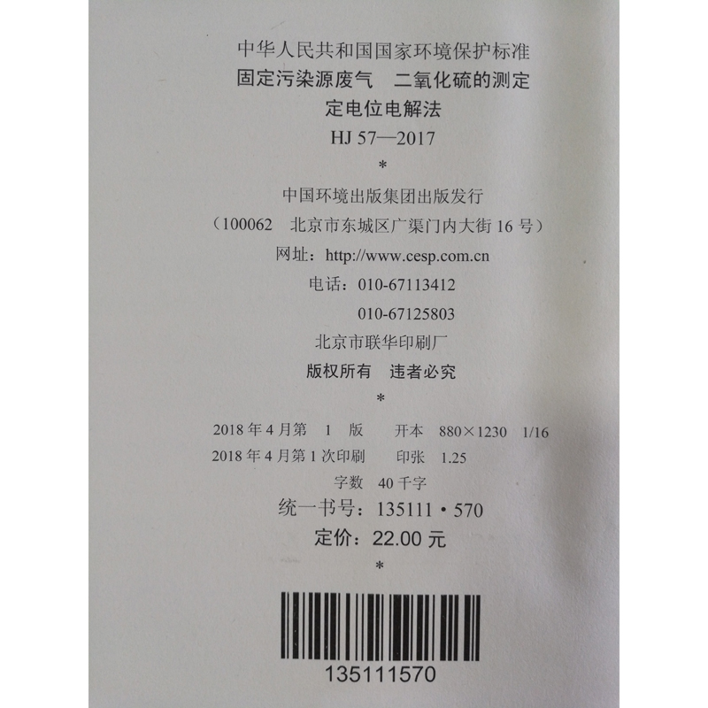 HJ 57—2017固定污染源废气 二氧化硫的测定定电位电解法 国家标准GB 环境保护 环境科学 135111570