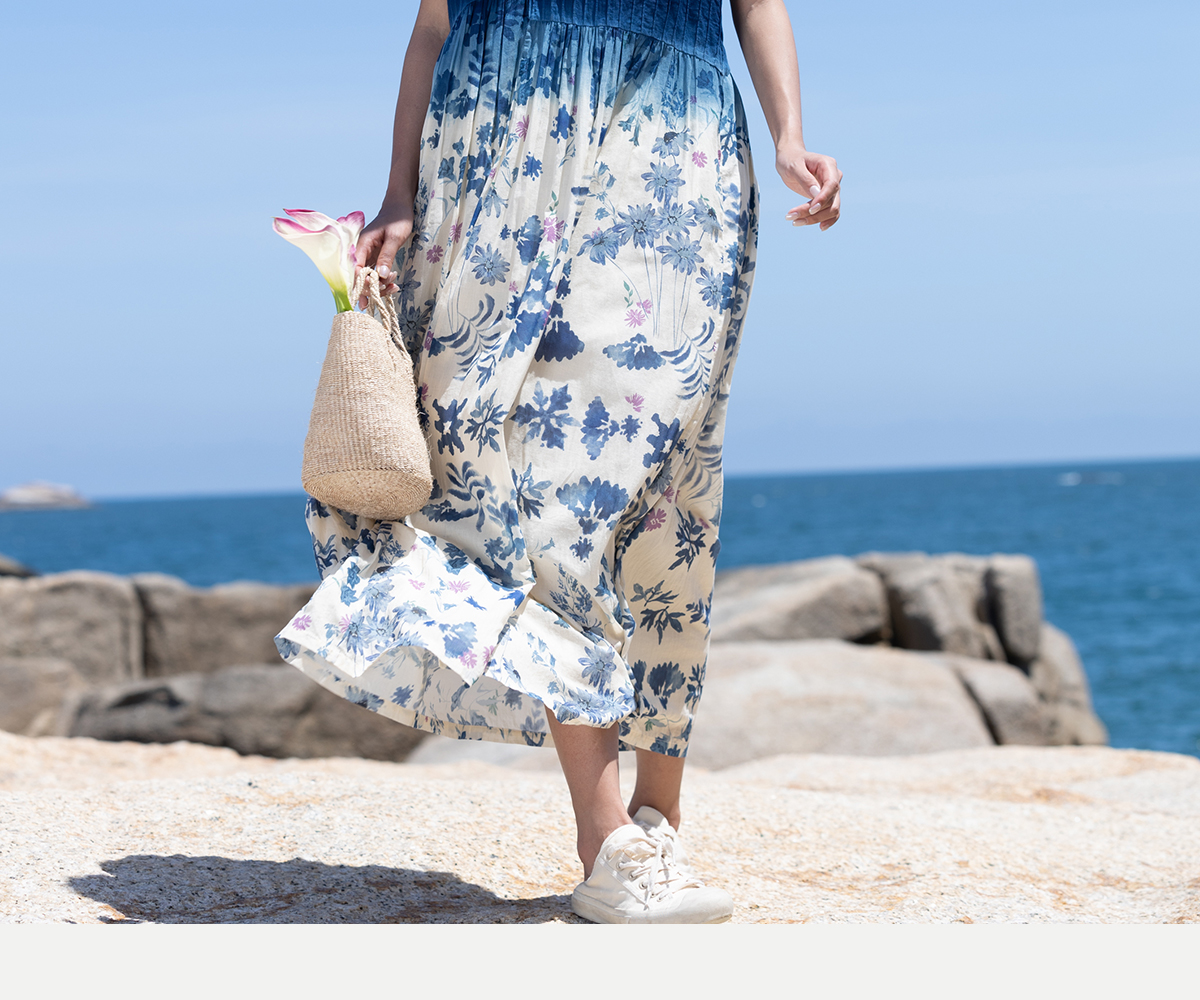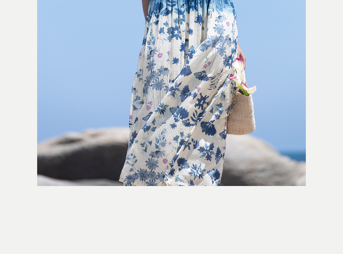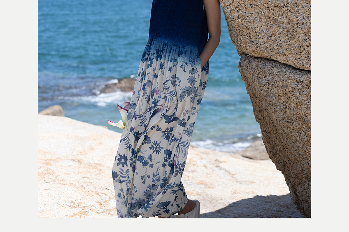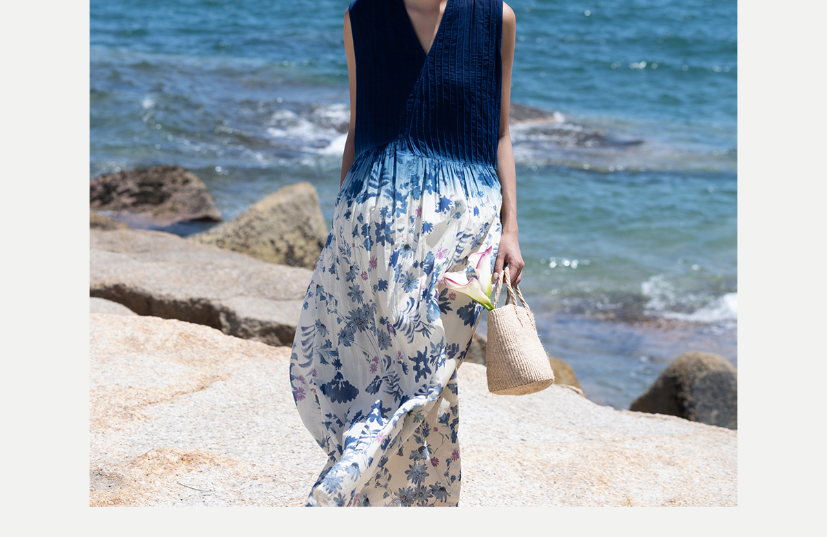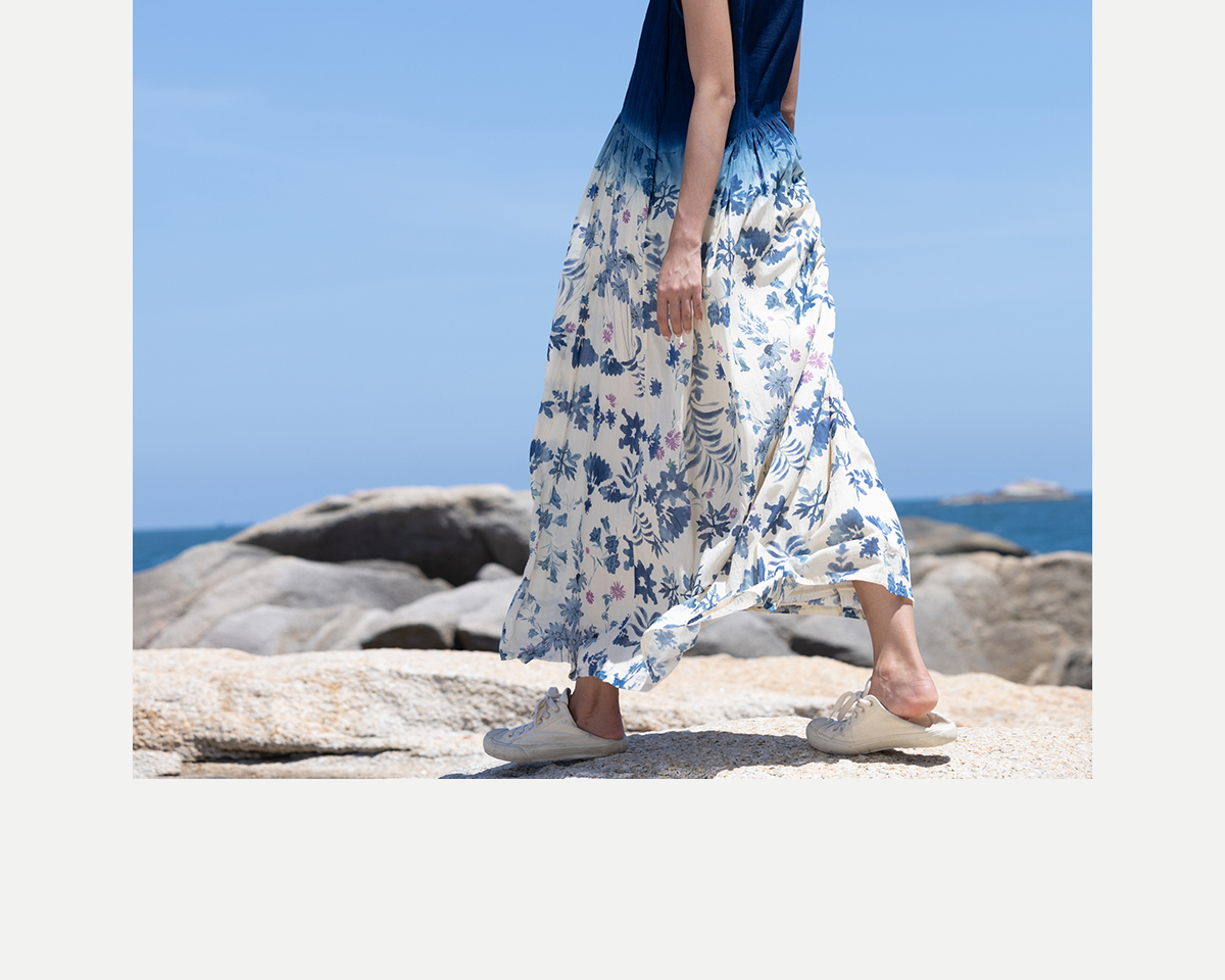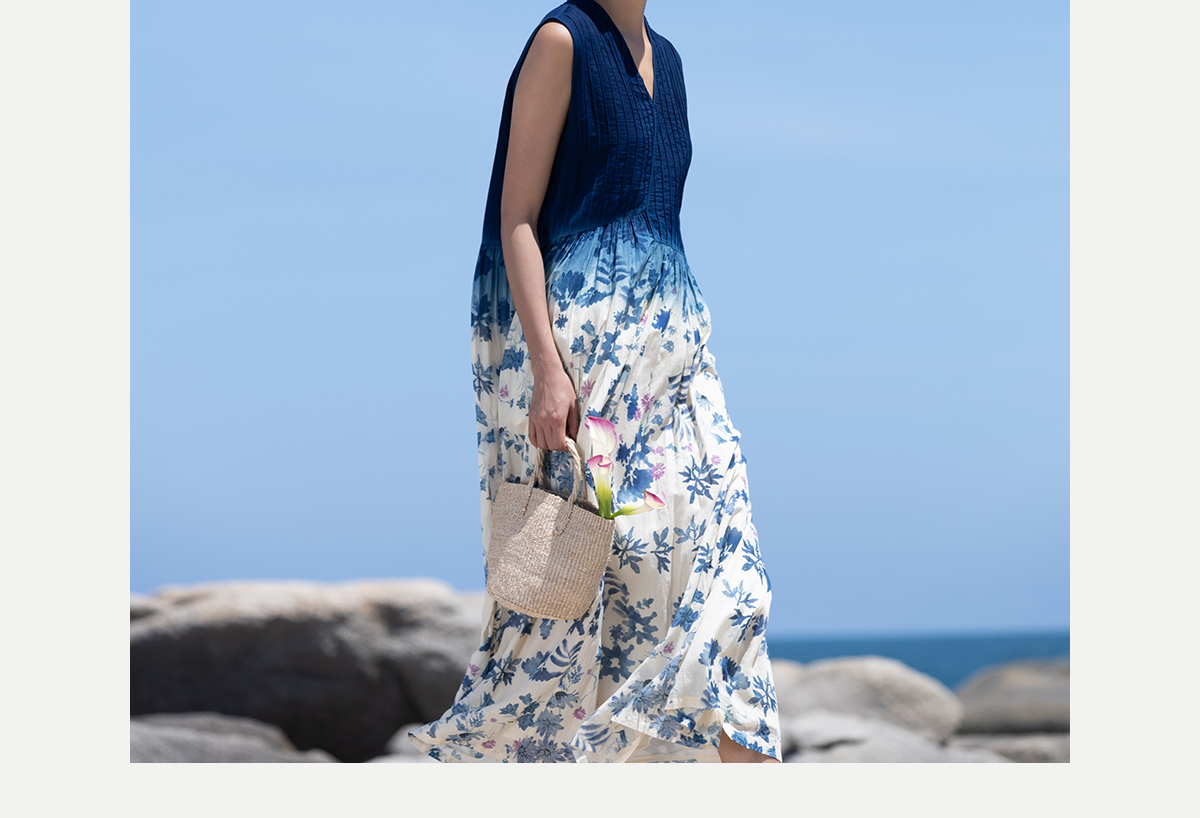 牧衣游 吊蓝染印花100支纯棉连衣裙新款无袖文艺宽松长裙 城烟雨