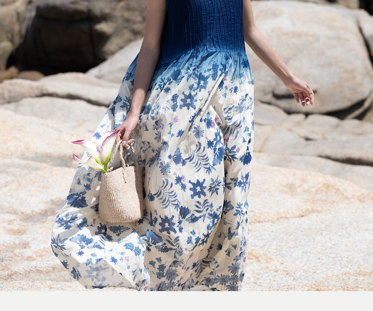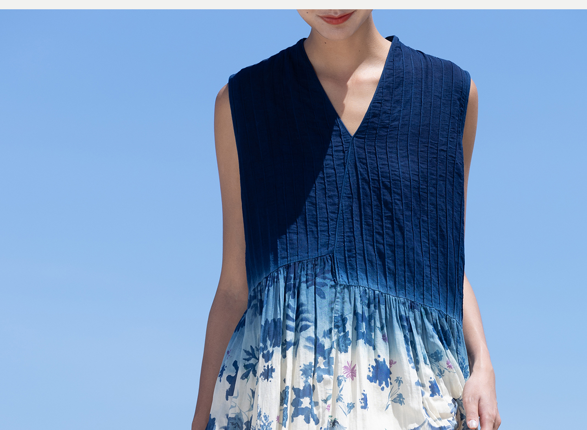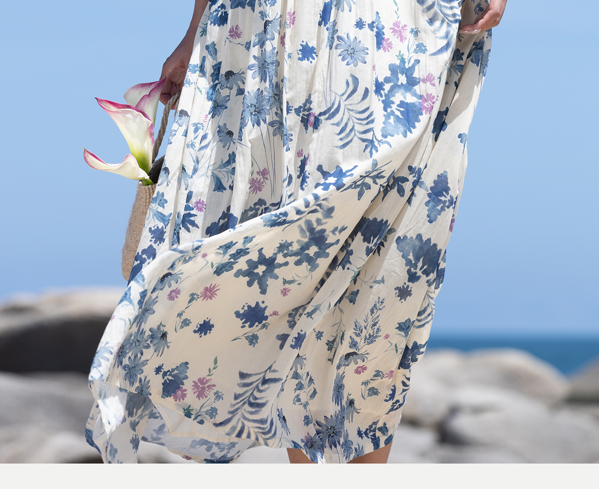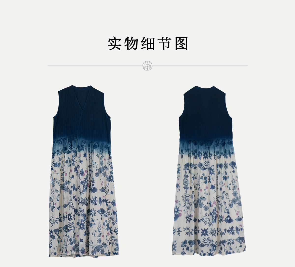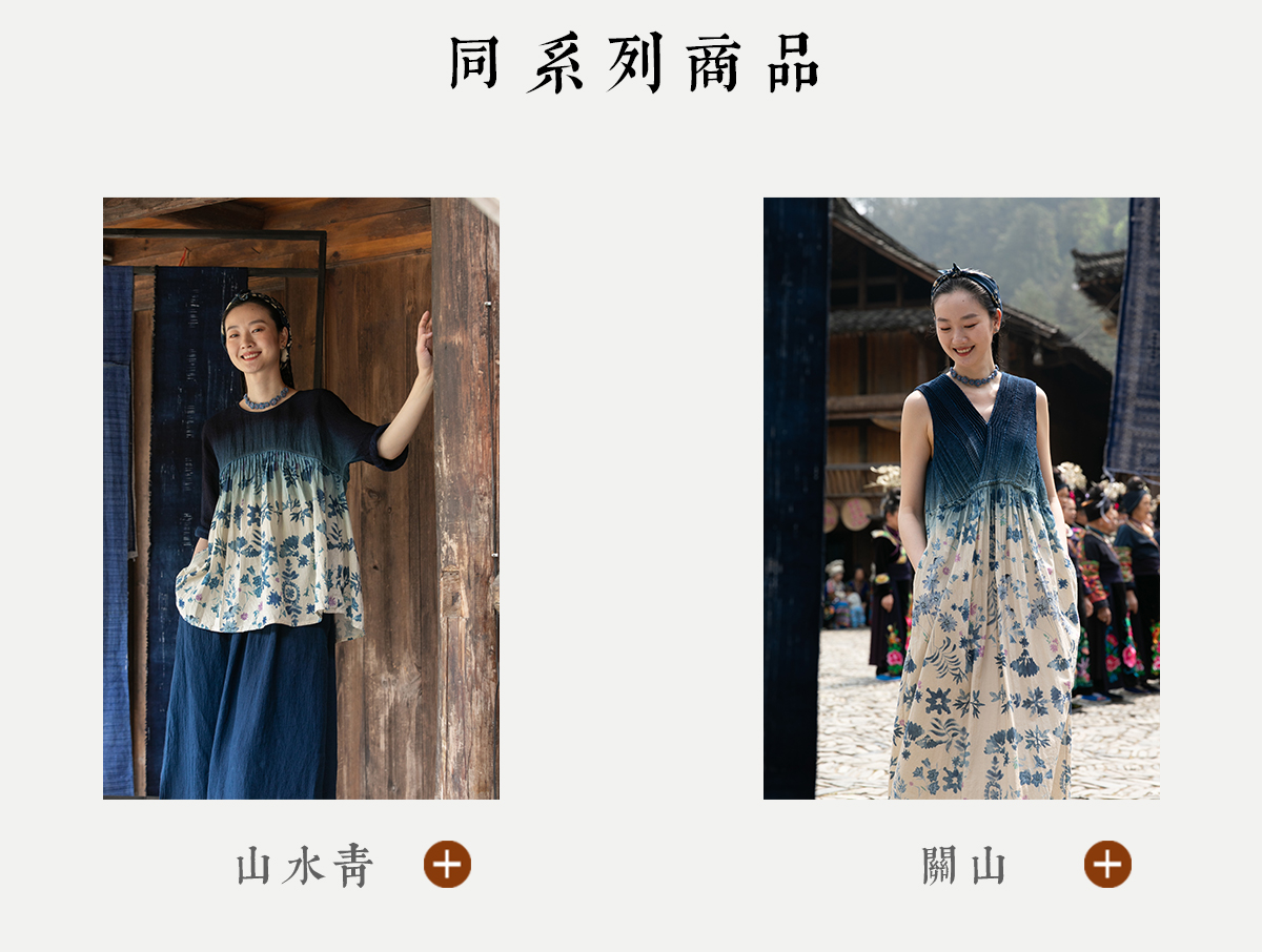 牧衣游 吊蓝染印花100支纯棉连衣裙新款无袖文艺宽松长裙 城烟雨