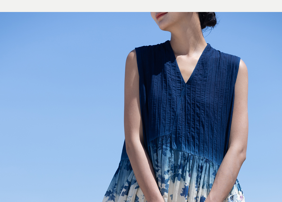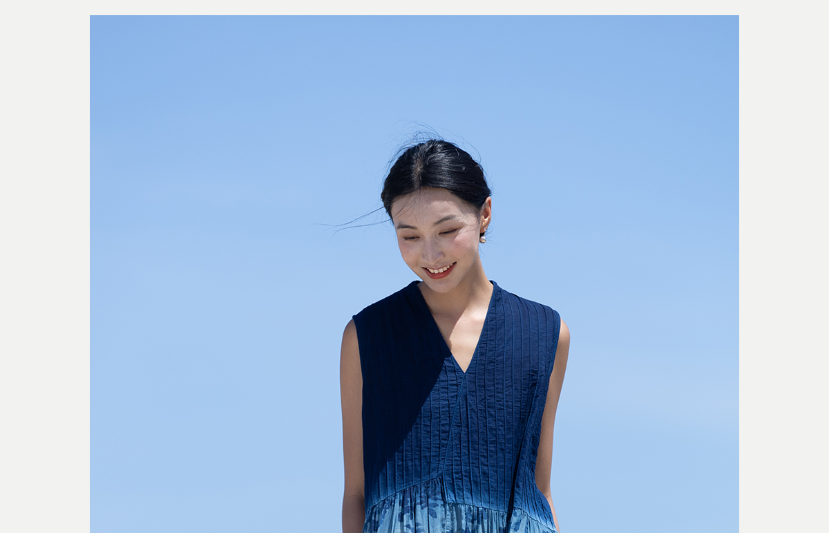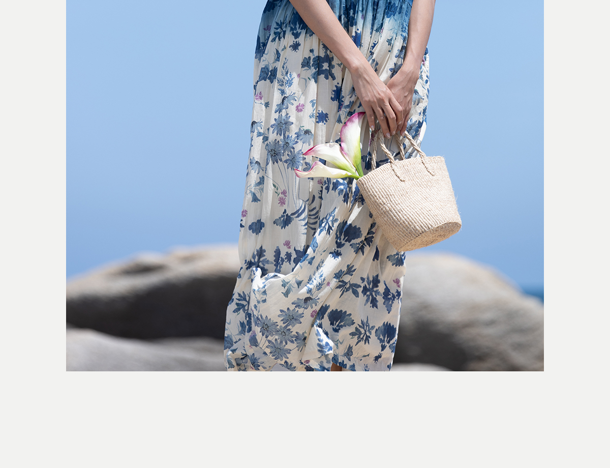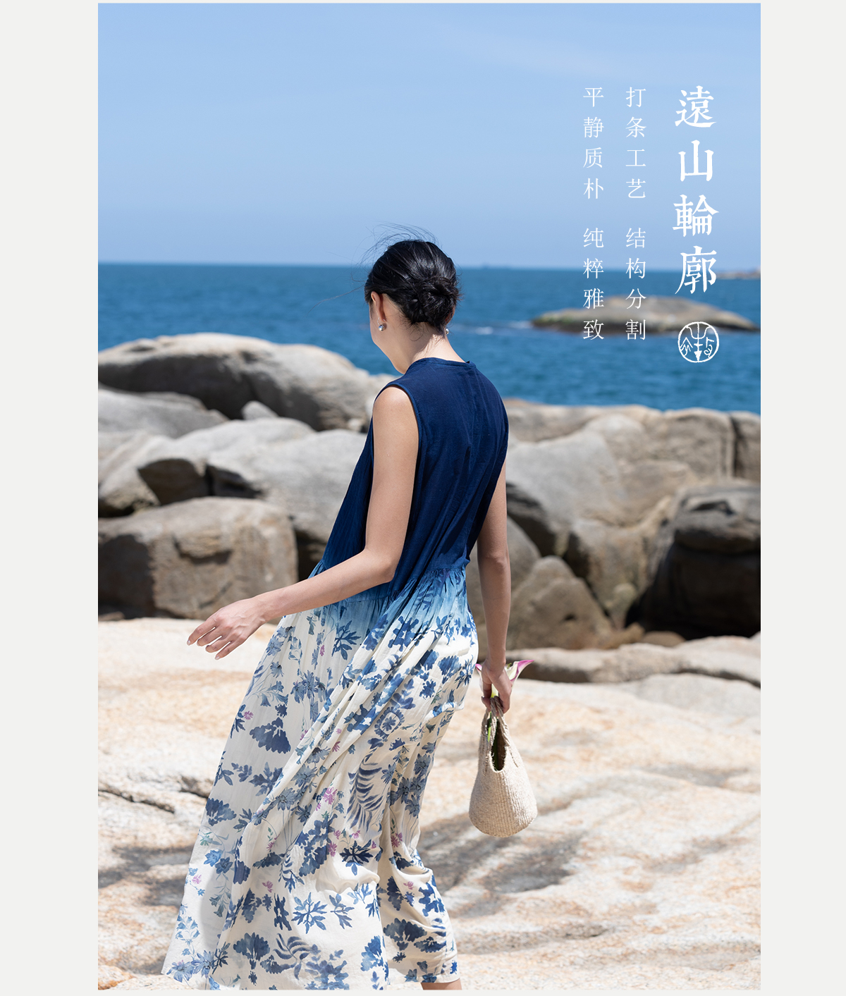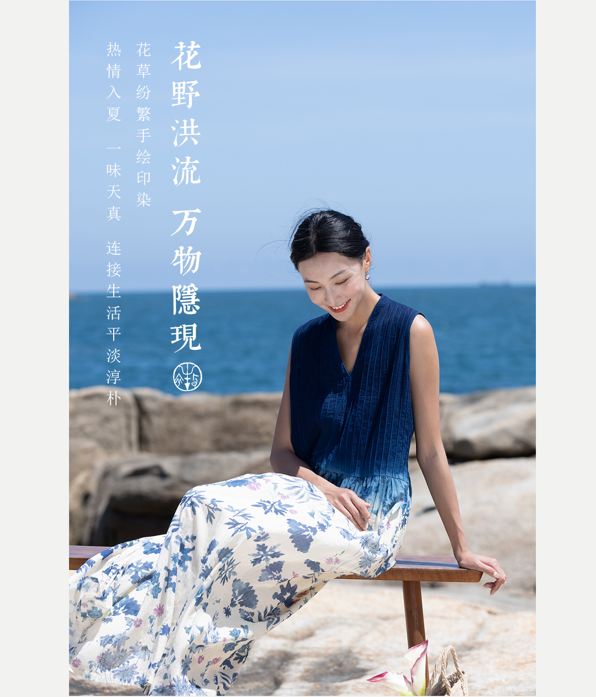 牧衣游 吊蓝染印花100支纯棉连衣裙新款无袖文艺宽松长裙 城烟雨