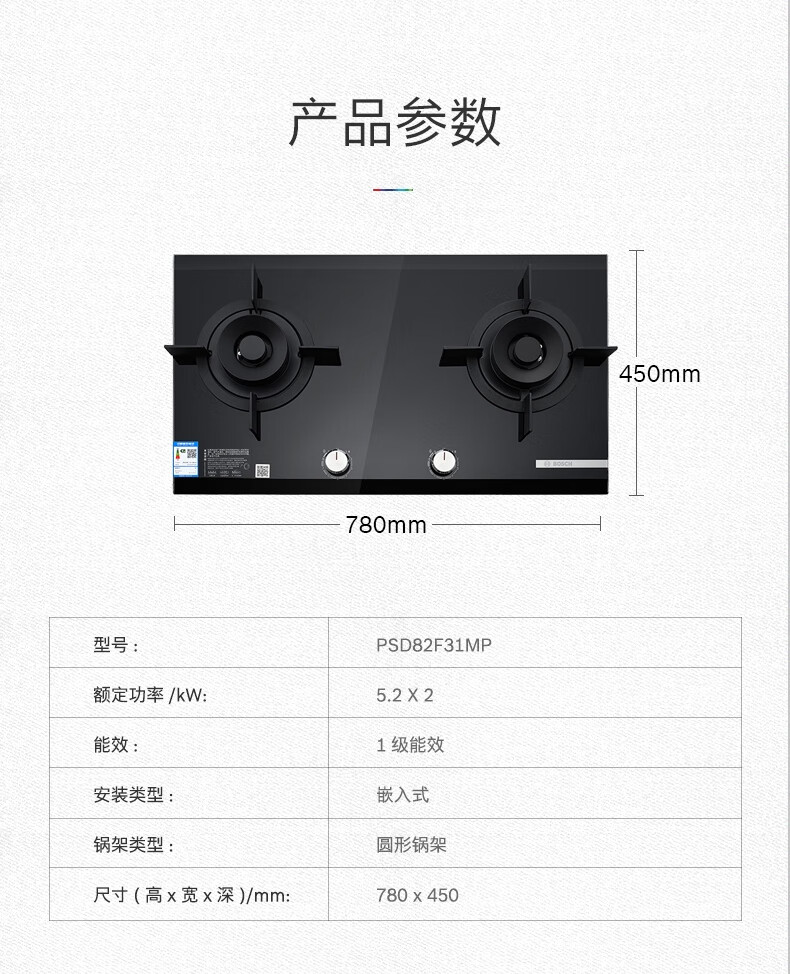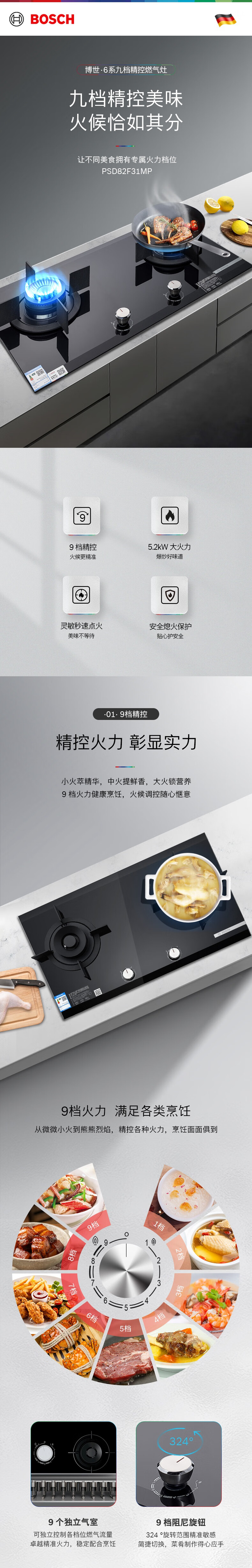 博世(BOSCH)5.2千瓦双眼嵌入式燃气大火力 9档精控天然气灶具 天然气(12T) PSD82F31MP
