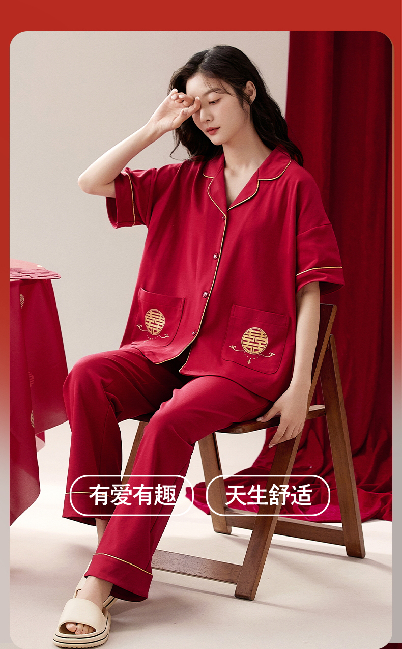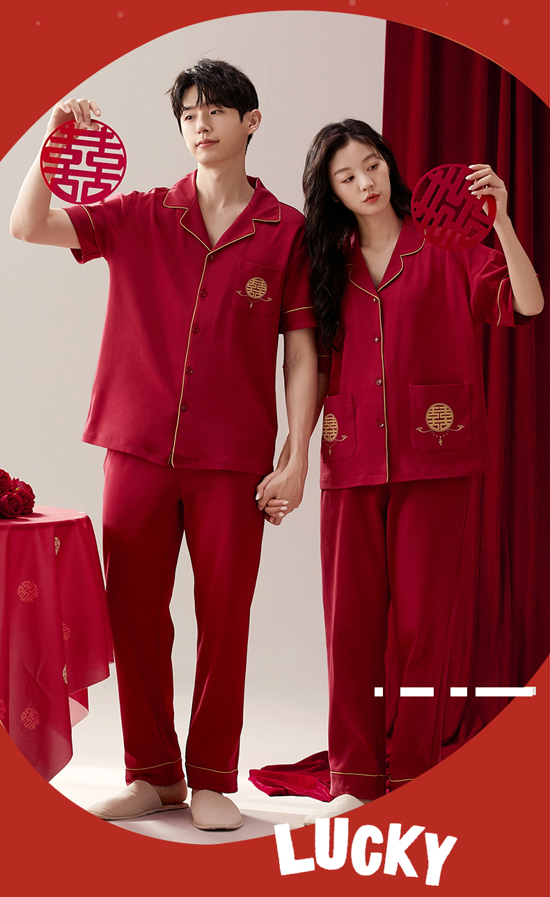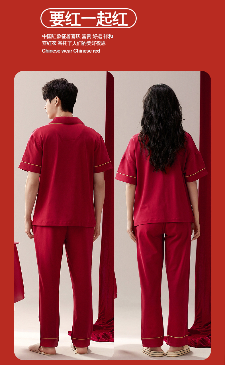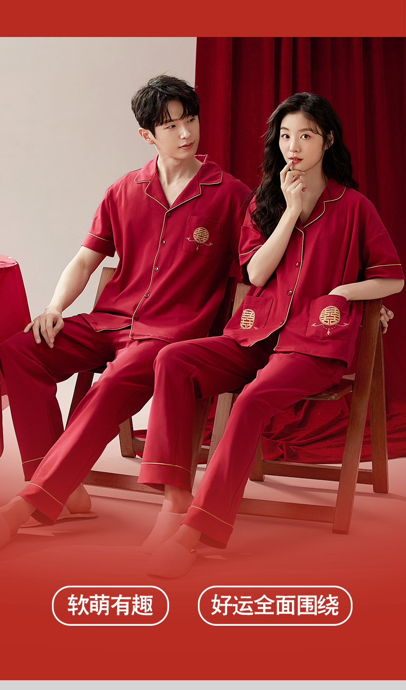 自然醒鸢鸾睡衣结婚新婚情侣套装夏季针织棉短袖长裤本命年红色男女士高级感家居服QH