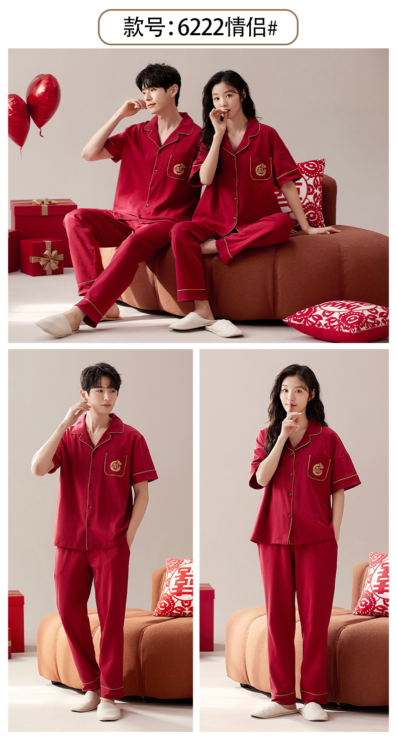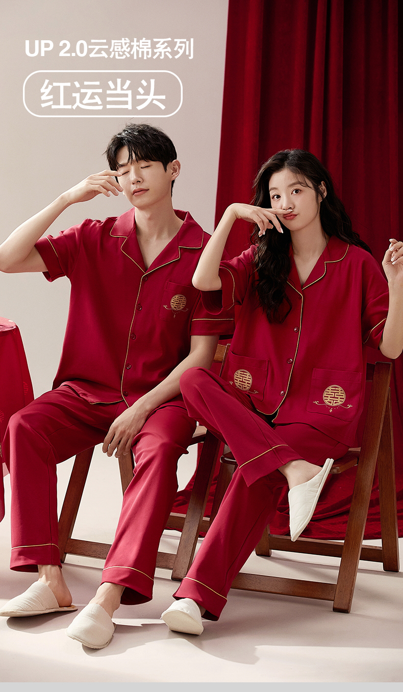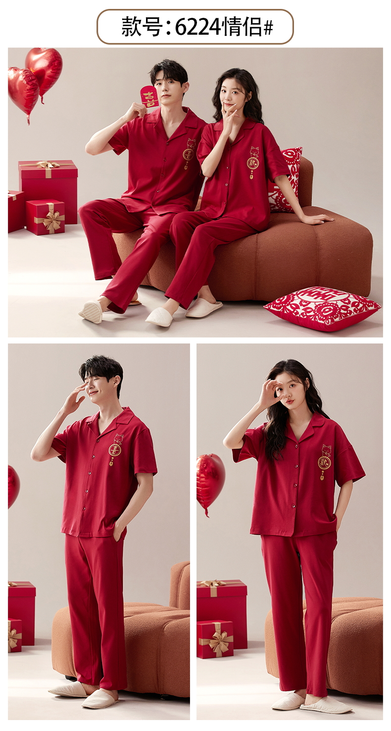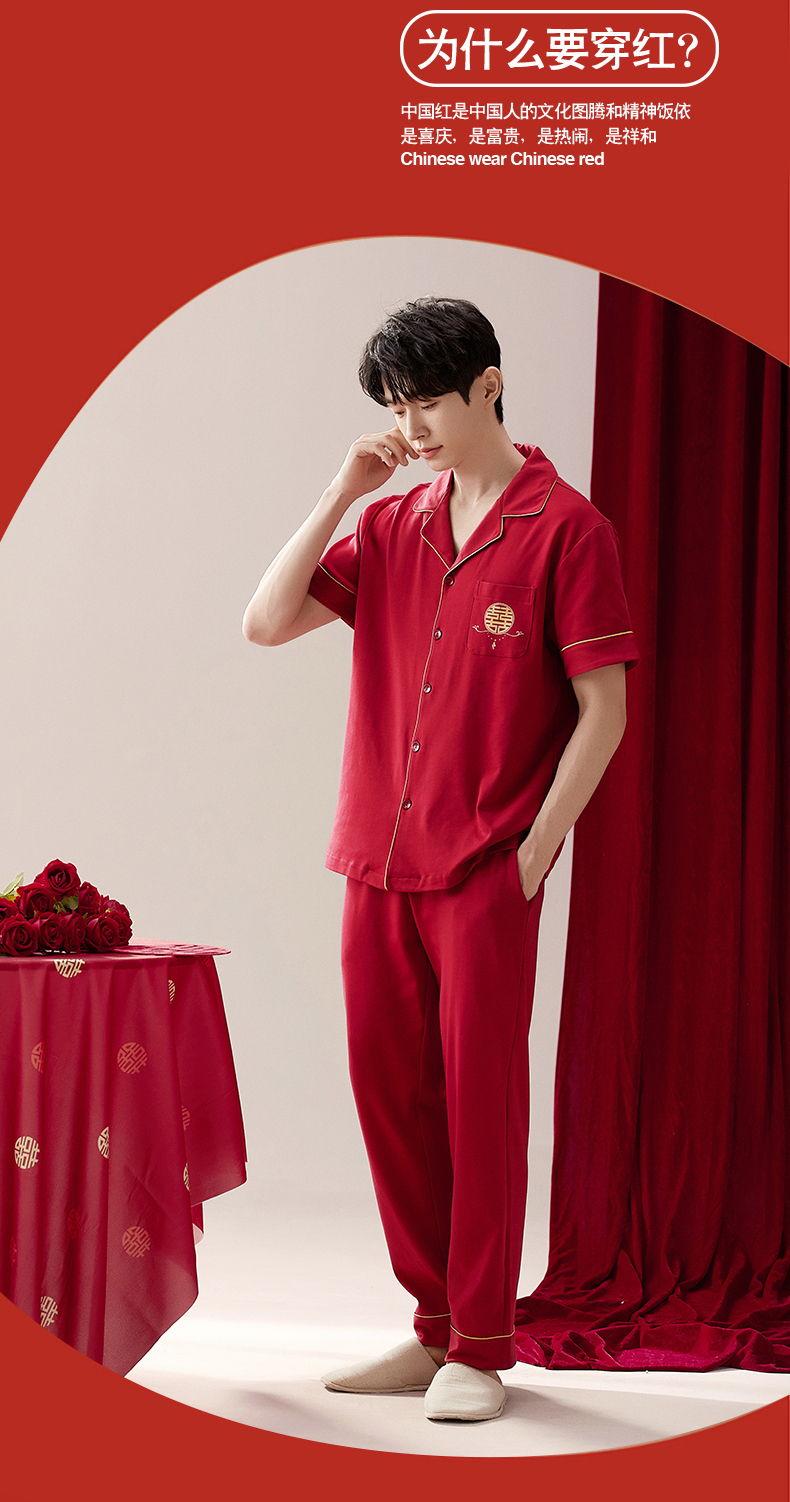 自然醒鸢鸾睡衣结婚新婚情侣套装夏季针织棉短袖长裤本命年红色男女士高级感家居服QH