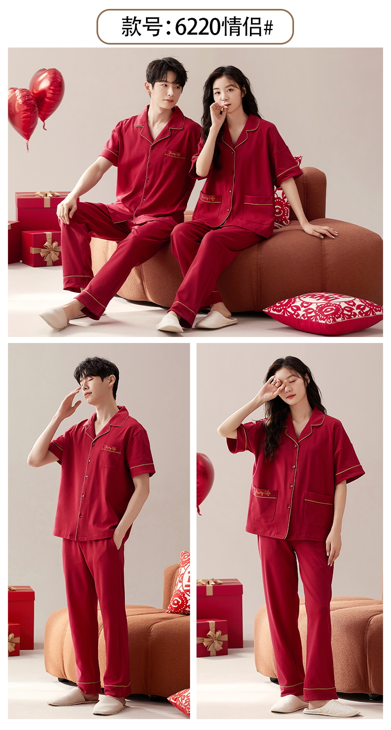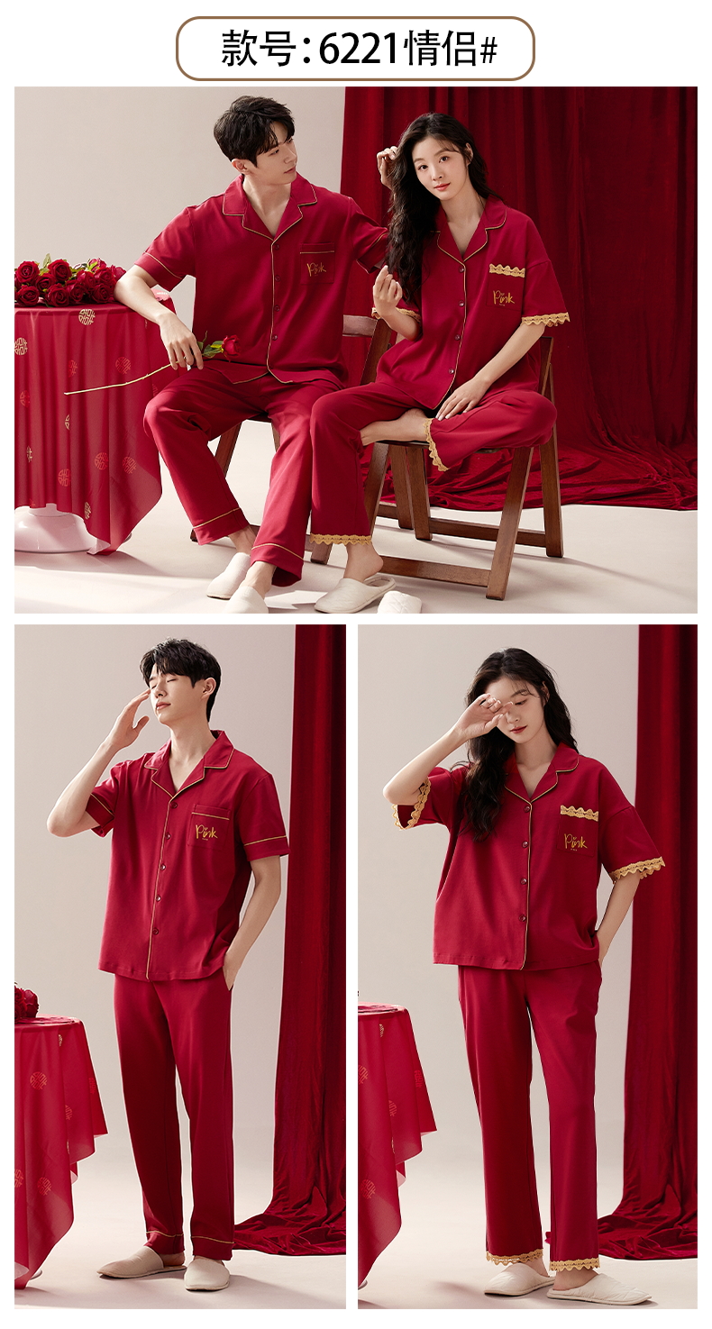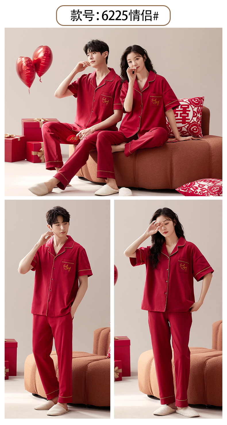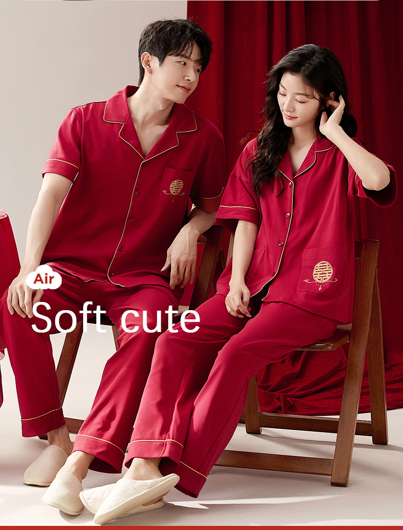 自然醒鸢鸾睡衣结婚新婚情侣套装夏季针织棉短袖长裤本命年红色男女士高级感家居服QH