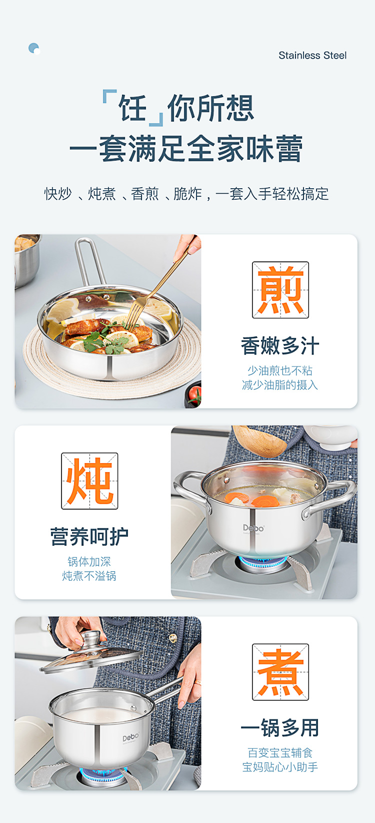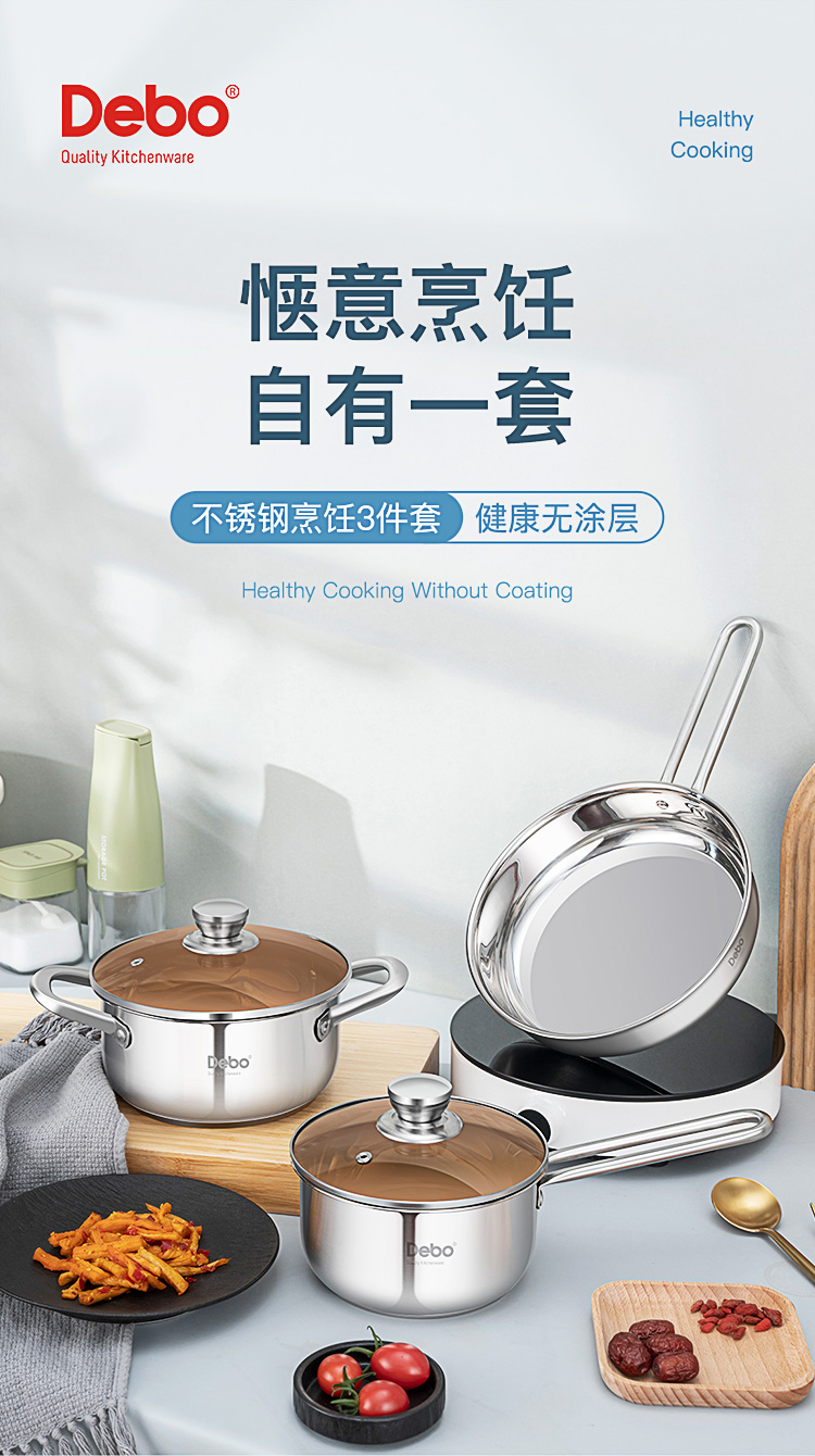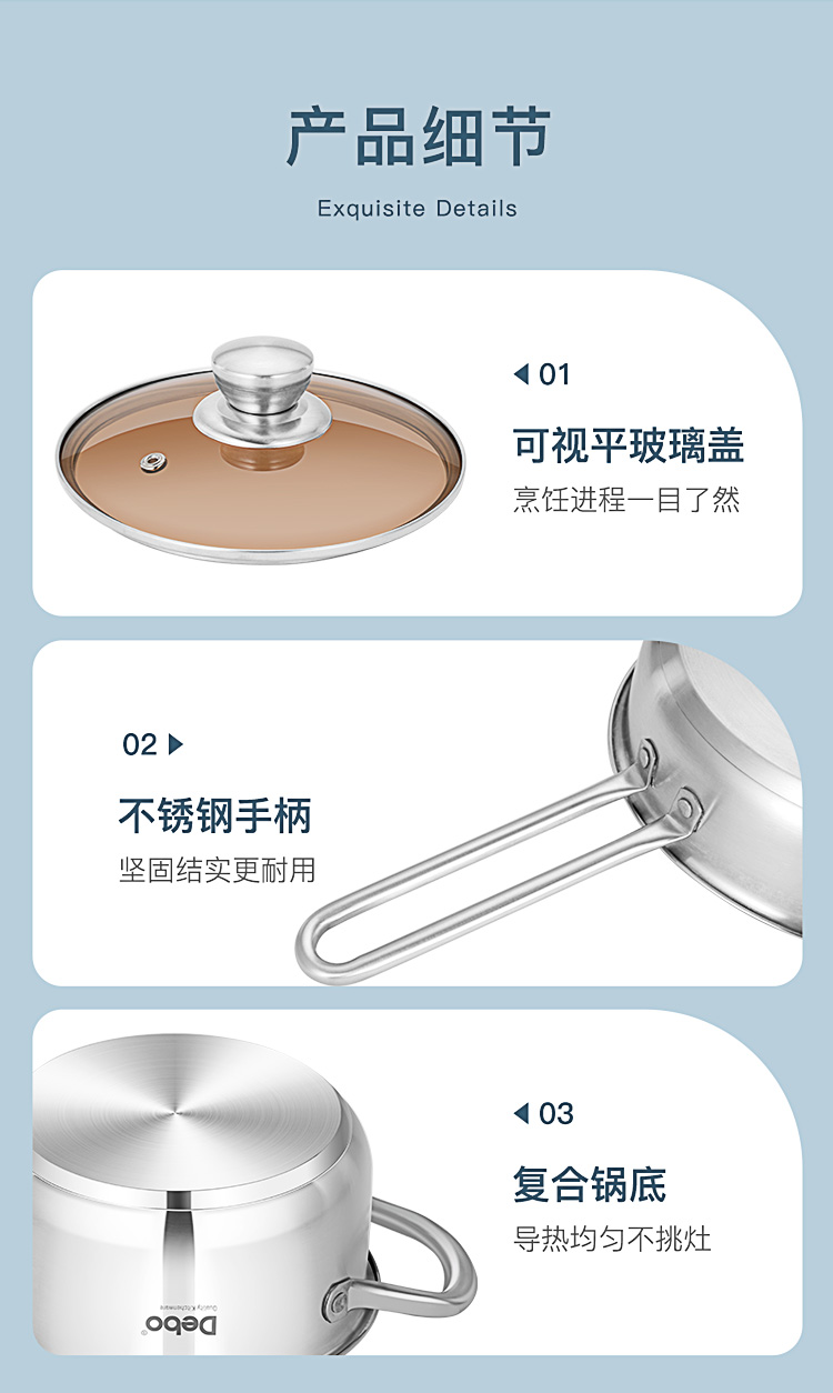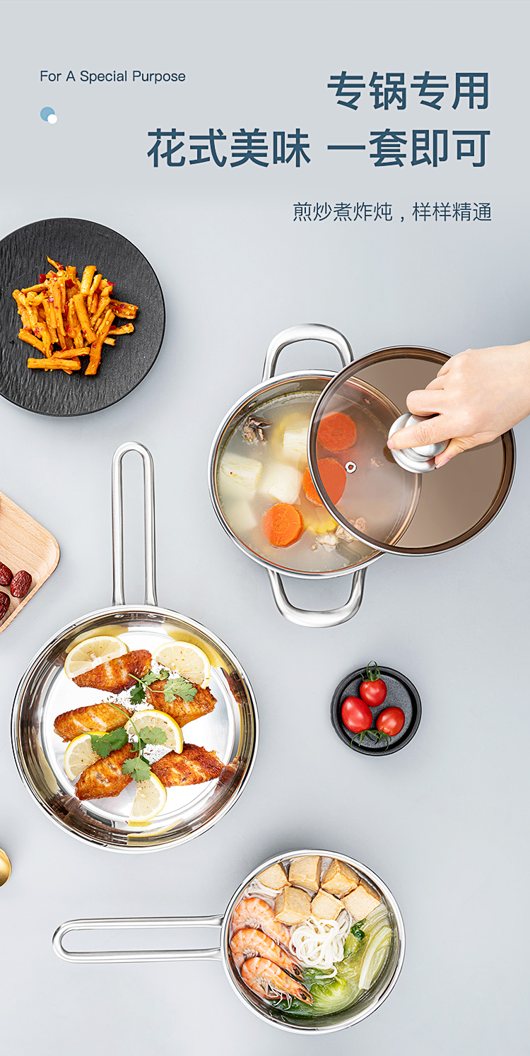 配置:汤锅身*1、奶锅身*1、煎锅身*1、玻璃盖*2