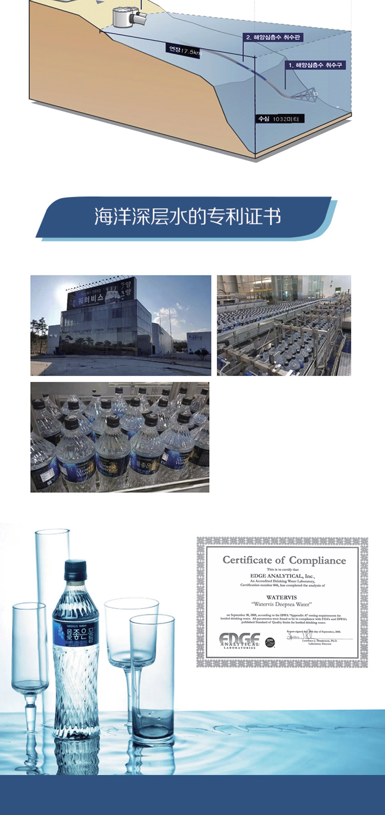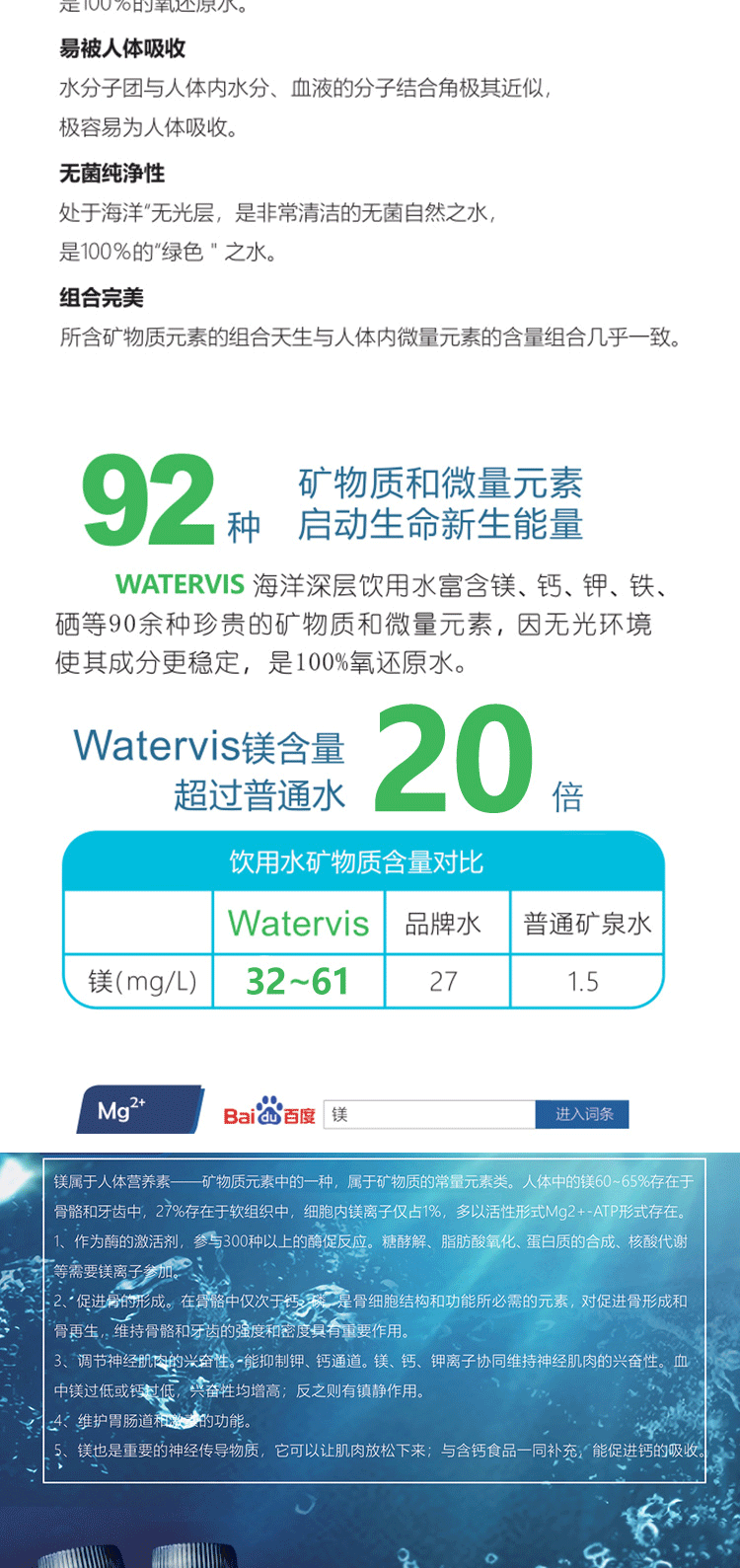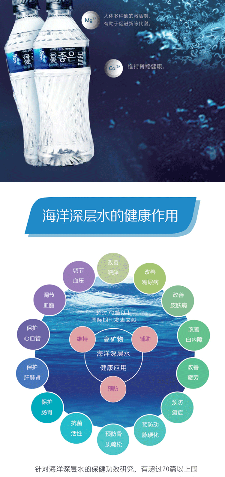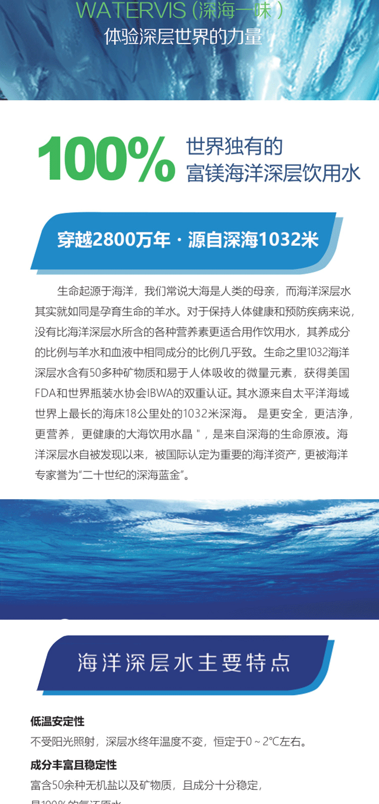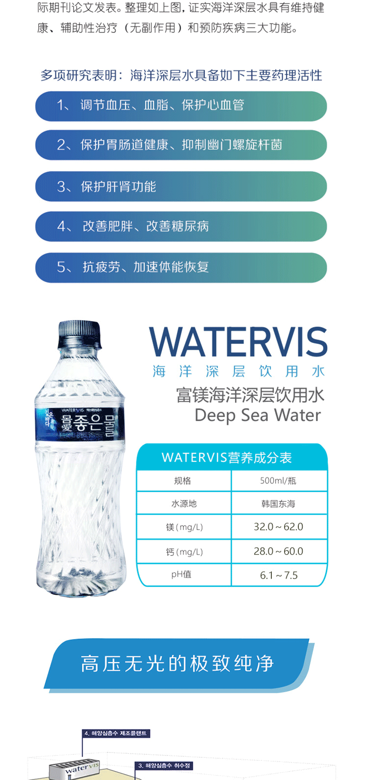 洁净的北极冰川融入海洋,经过数千年循环,形成了特殊的海洋深层水,watervis从韩国东部1032米深海汲取这一款世界上非常优秀的海洋深层水,矿物质含量比例镁3:钙:1钾:1与母体羊水及人体血液,被誉为21世纪的“深海蓝金”。