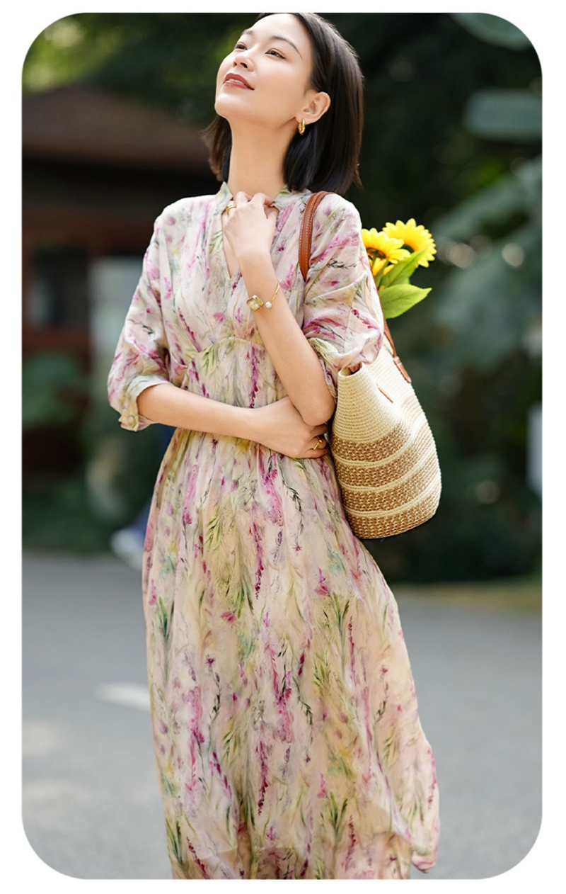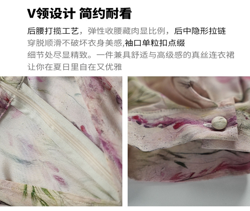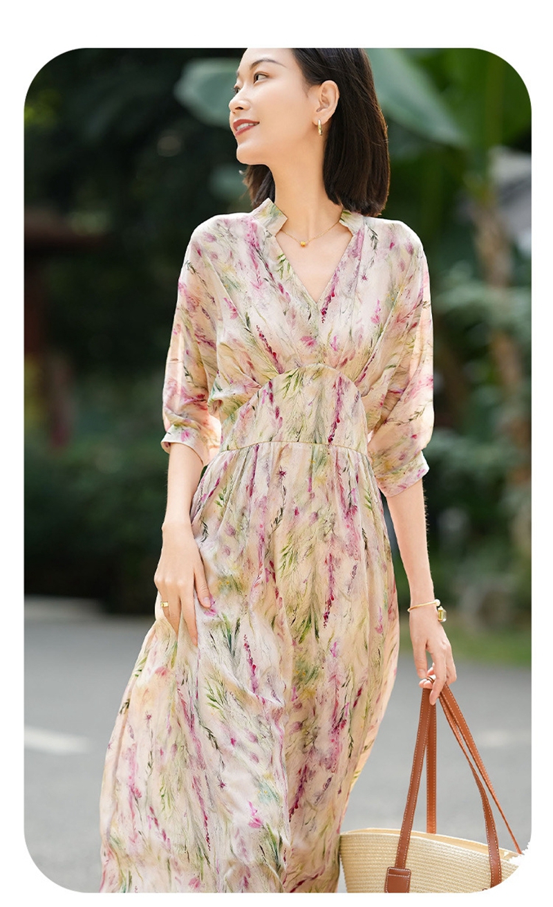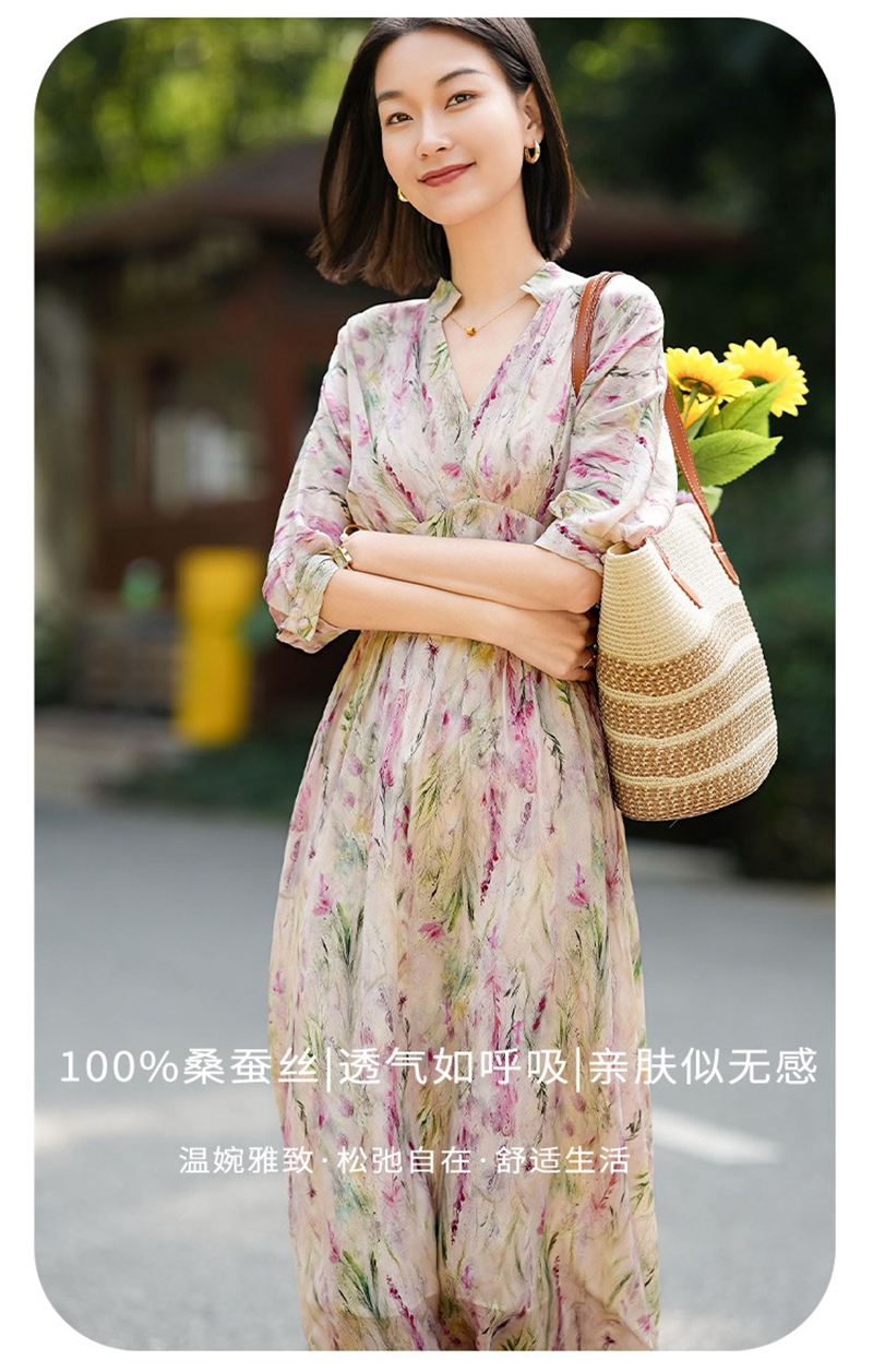 时尚法式V领七分袖收腰气质碎花连衣裙