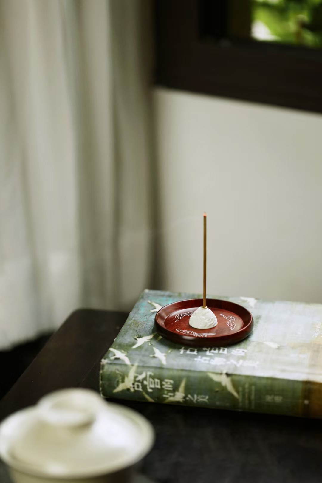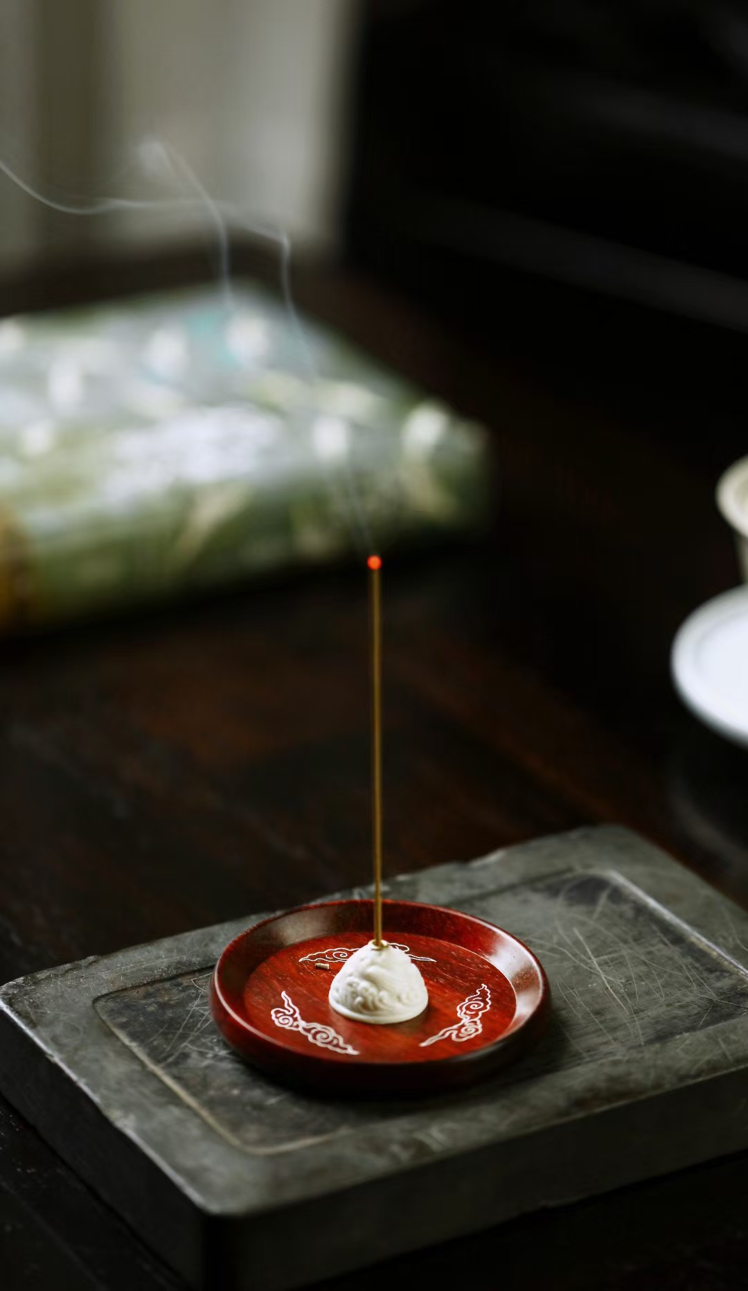 小叶紫檀一木挖制,手工嵌银丝作祥云,鹿角制海浪纹香插,磁石吸附,巧妙设计,方便清理香头,更称心。