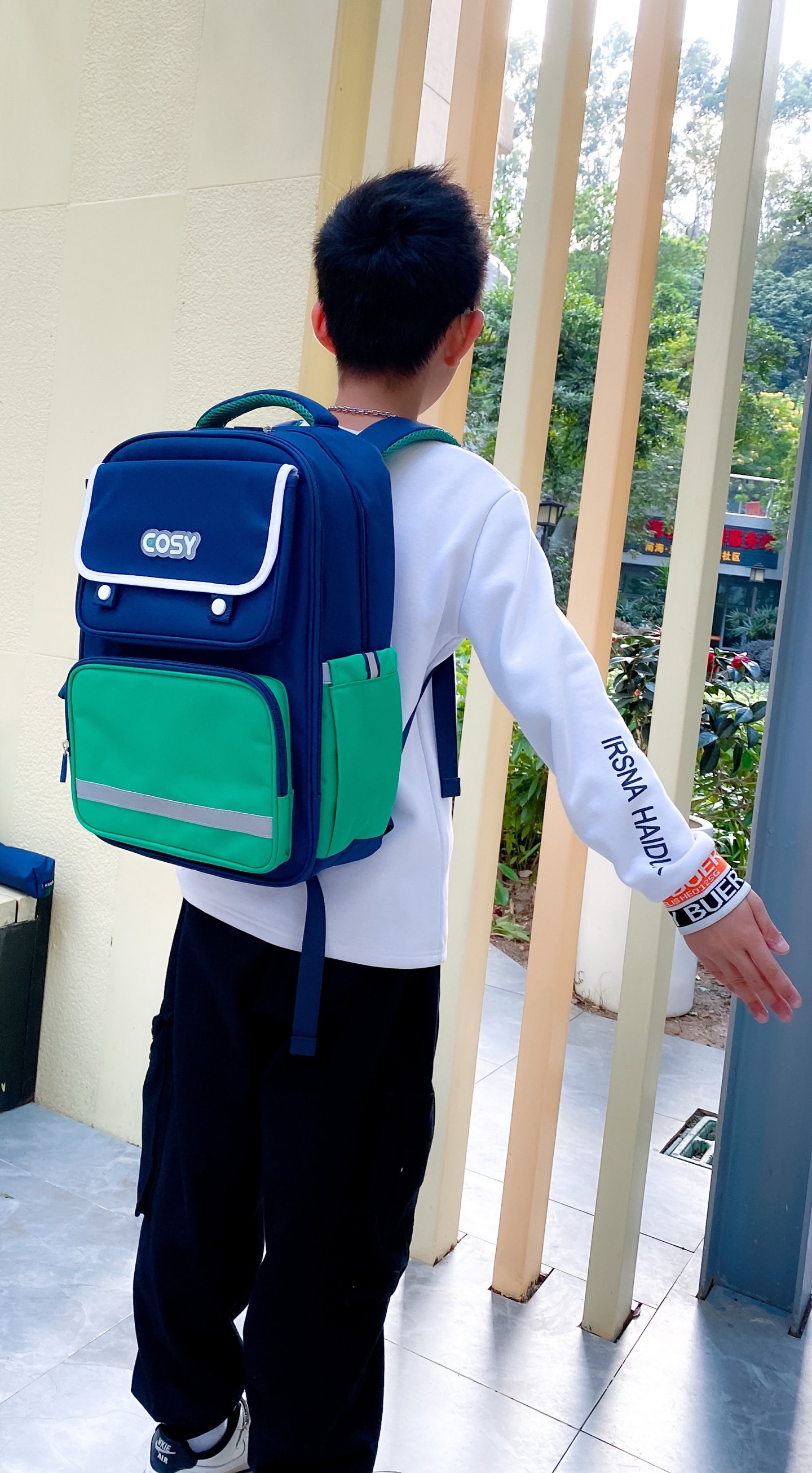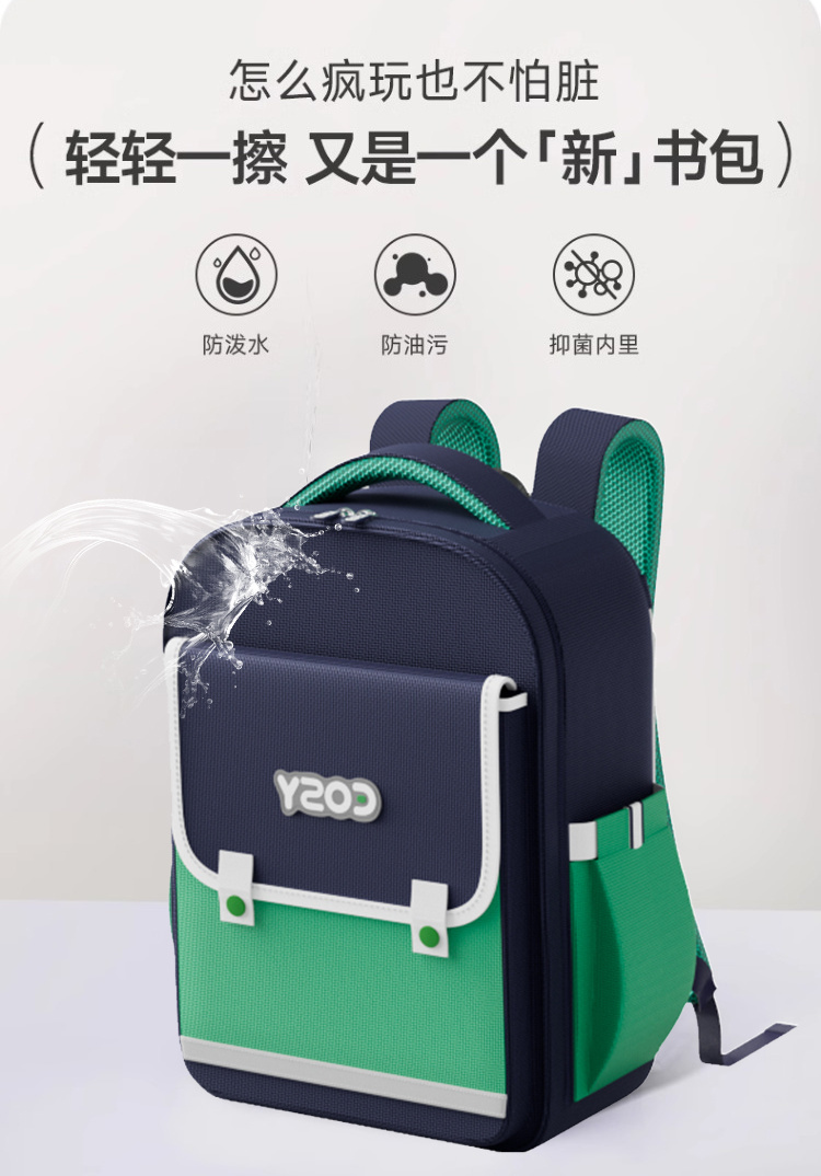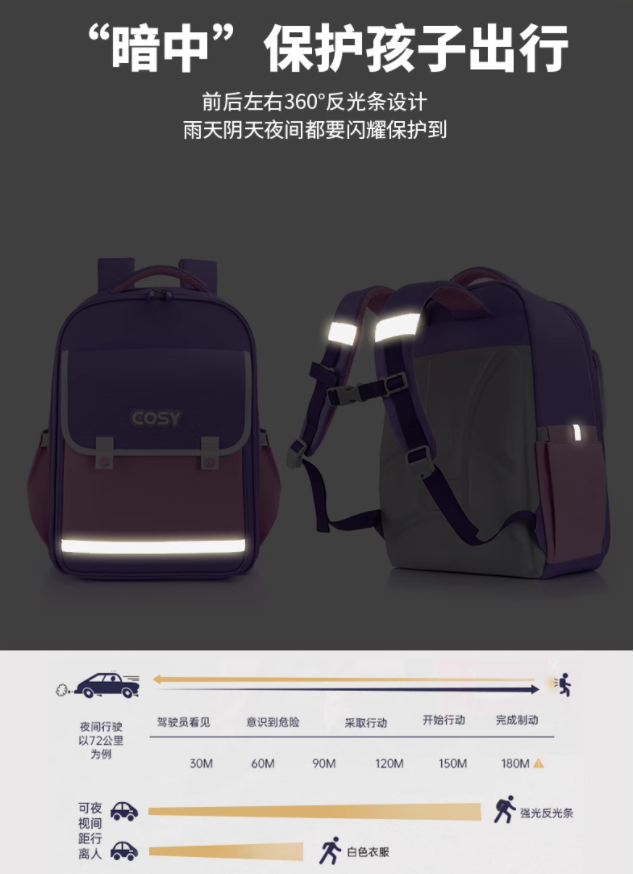 加宽加厚背带、加厚靠背、分隔层、反光条、EVA3D压膜护脊背幅等细节,每一个都在呵护孩子的成长!