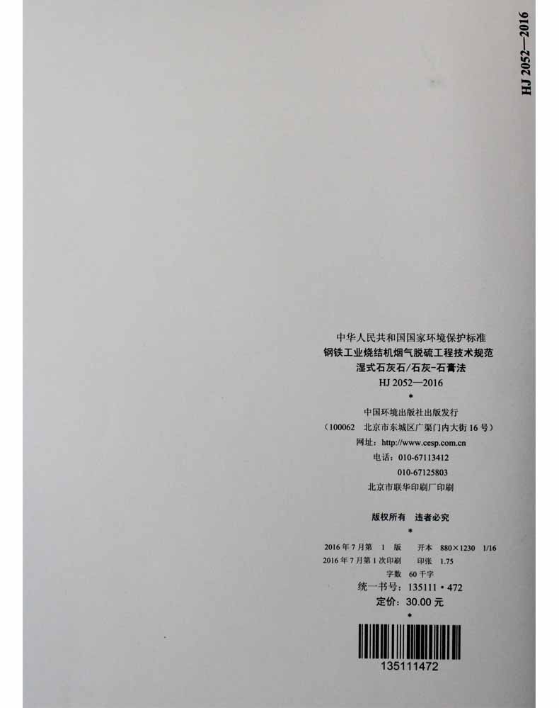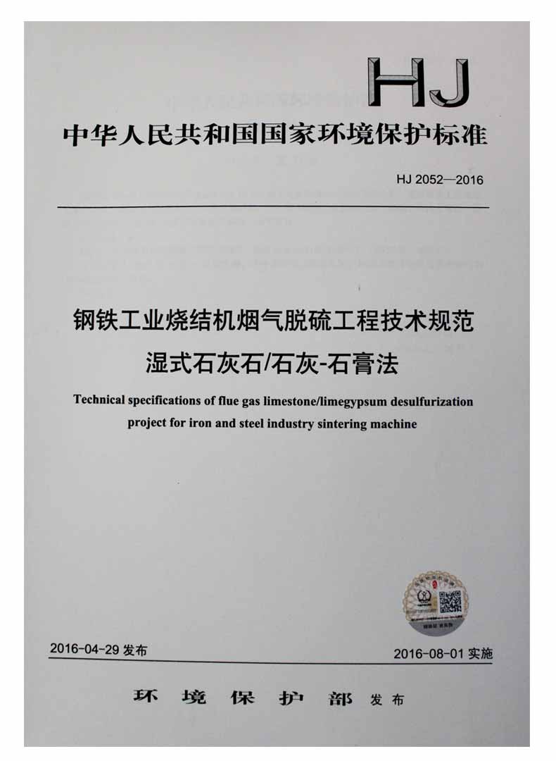 HJ 2052-2016 钢铁工业烧结机烟气脱硫工程技术规范 湿式石灰石/石灰-石膏法 国家标准 GB 环境保护135111472