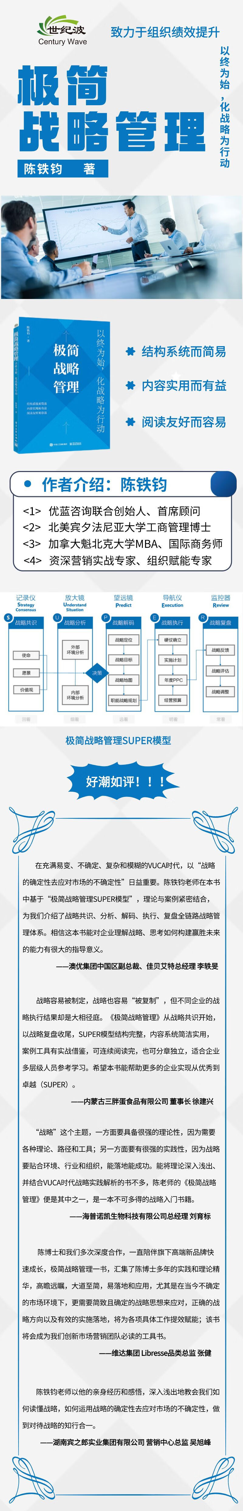 本着“结构系统而简易、内容实用而有益、阅读友好而容易”的宗旨,本书深入浅出且不乏专业性地,将战略管理中*重要的三个基本问题(我们在哪儿、我们要去哪儿、我们怎么去),以及一个实施问题(具体怎么办)剖析清楚,并遵循“战略共识—战略分析—战略解码—战略执行—战略复盘”这样的逻辑设计,来实现战略的“知行合一”。本书内容源于企业培训和咨询,不仅有完整的理论体系、相应的工具模型,而且有大量落地的实战案例,可供企业高层、中层、基层,以及希望了解和学习战略管理的爱好者借鉴参考。