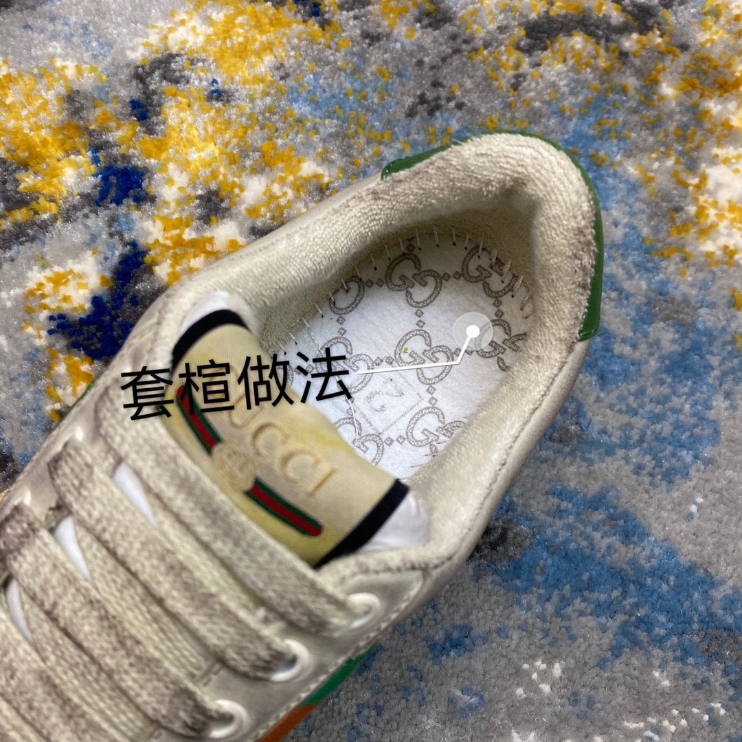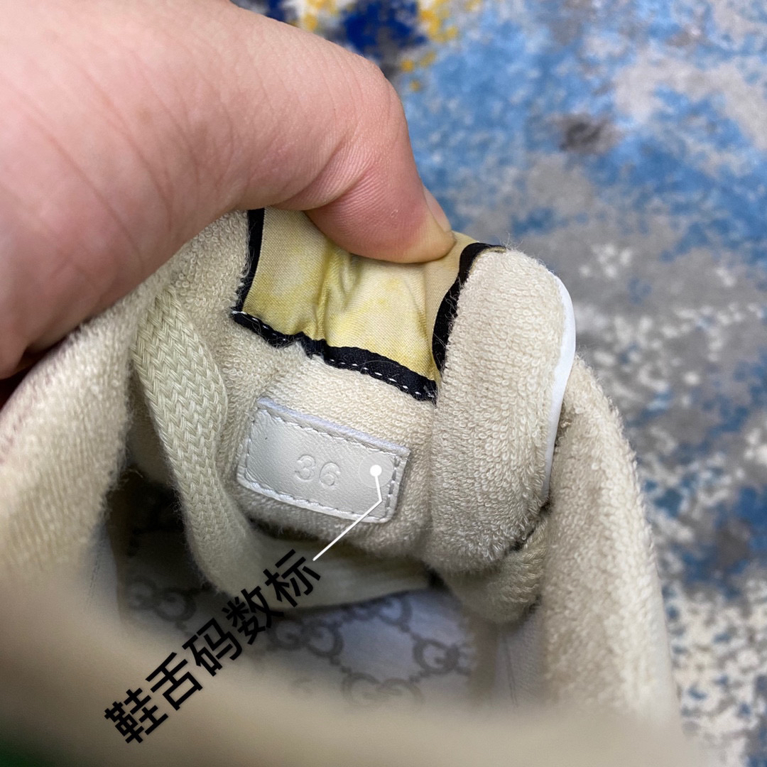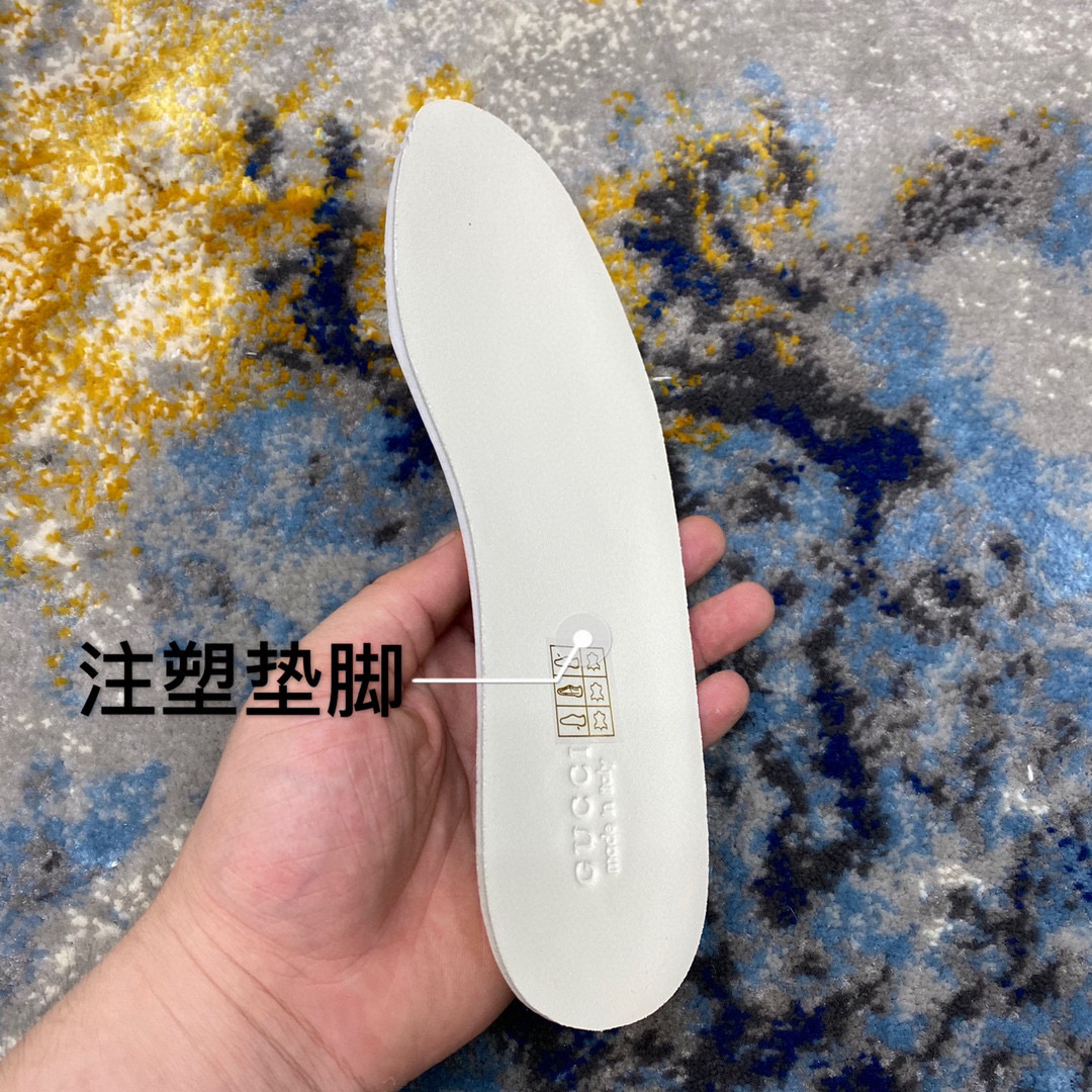 鞋面擦色牛皮拼接经典双G布面料,皮面切口全油边封口工艺,原版毛巾布里细腻柔软更舒适透气,垫脚乳胶注塑一体,私模钢印双色原版TPU大底(下层宽,上层窄)