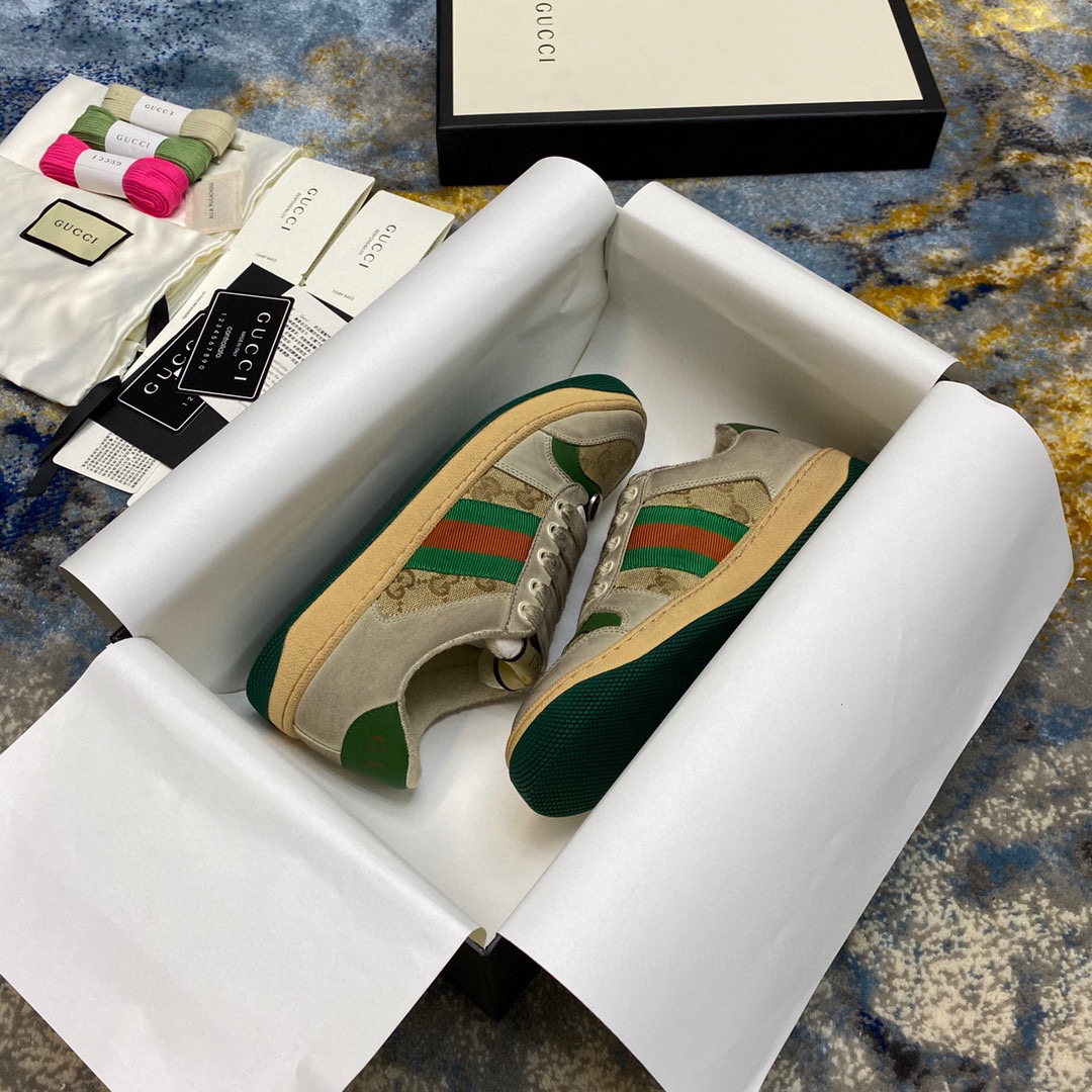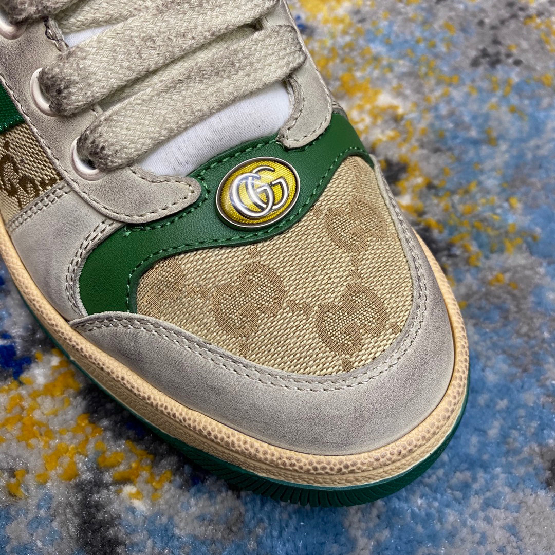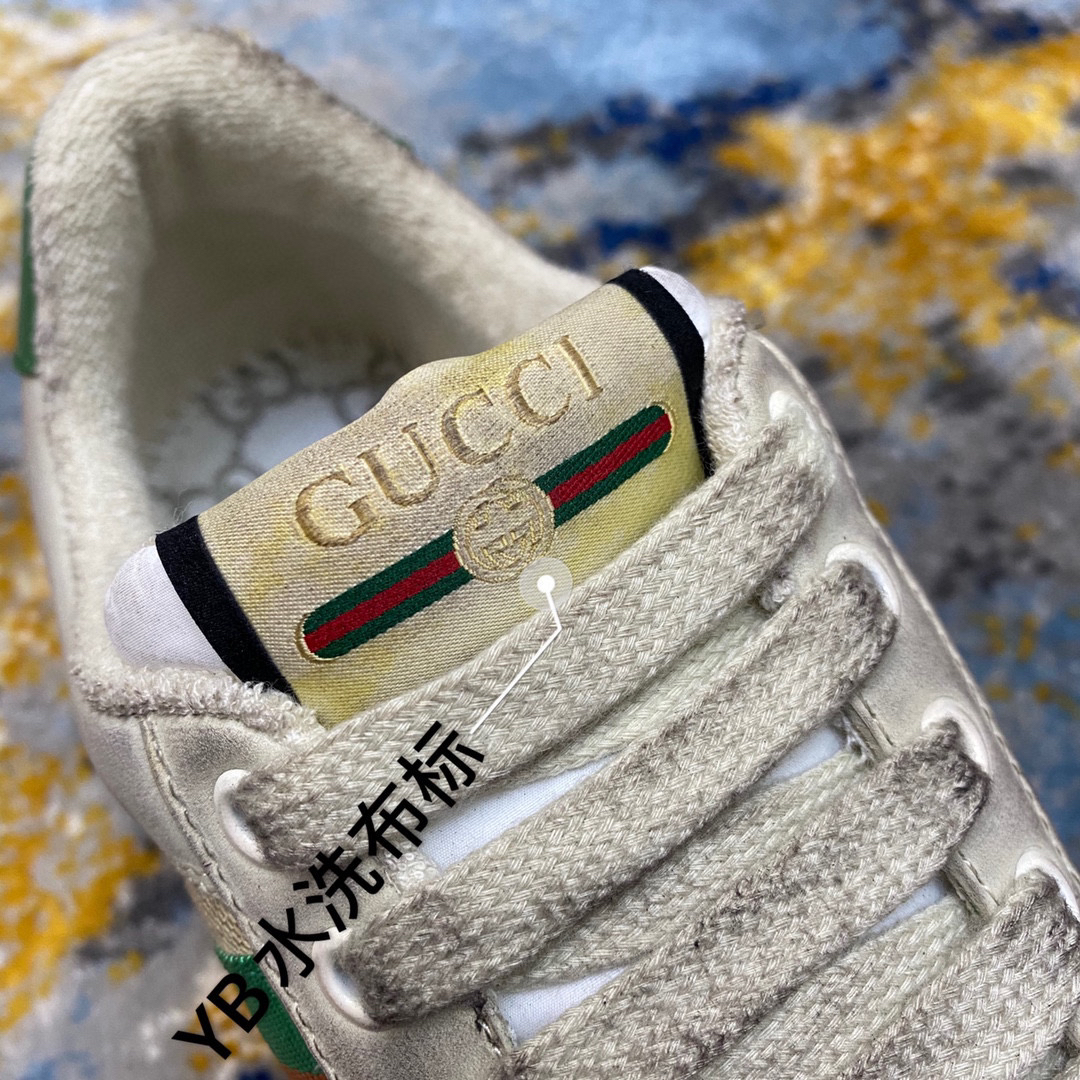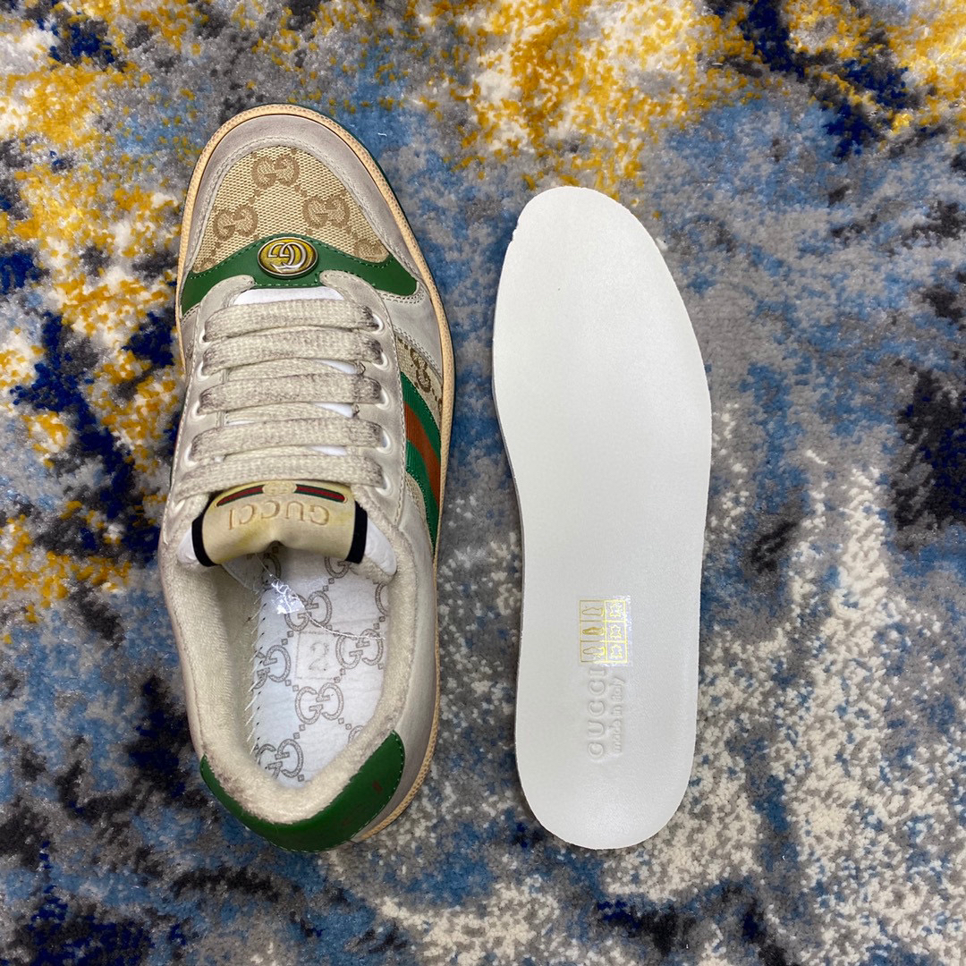 鞋面擦色牛皮拼接经典双G布面料,皮面切口全油边封口工艺,原版毛巾布里细腻柔软更舒适透气,垫脚乳胶注塑一体,私模钢印双色原版TPU大底(下层宽,上层窄)