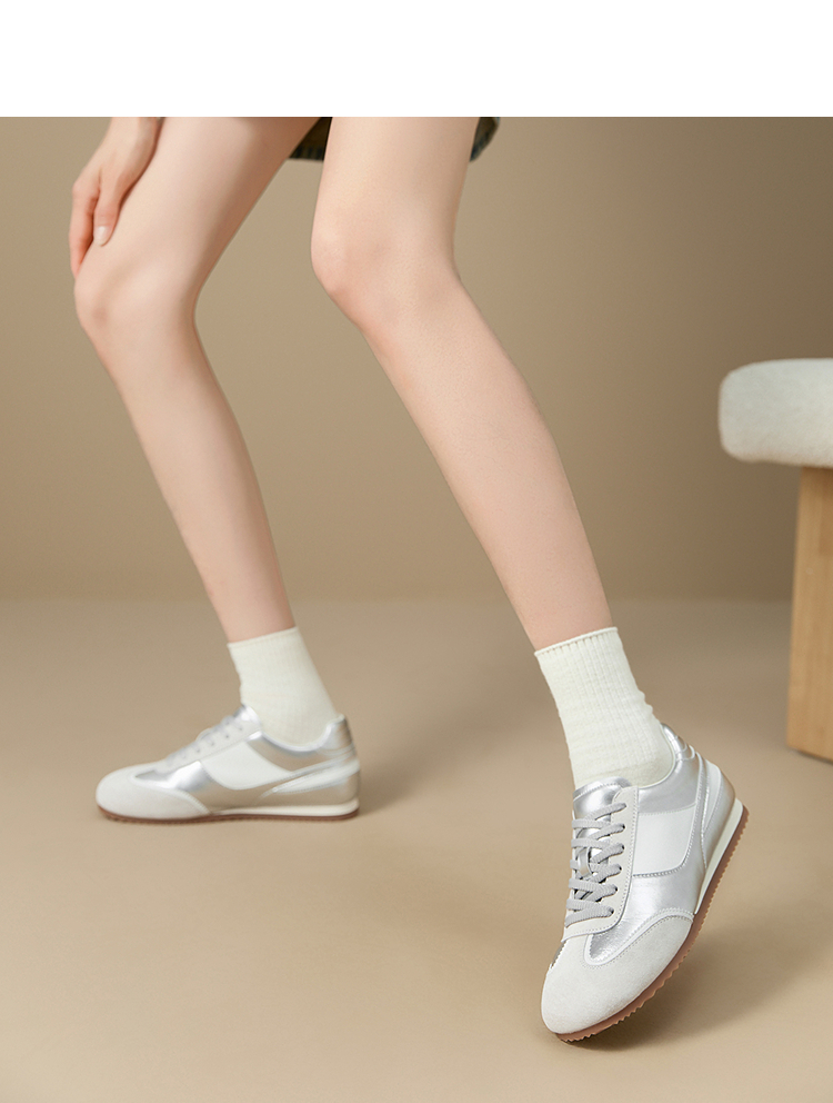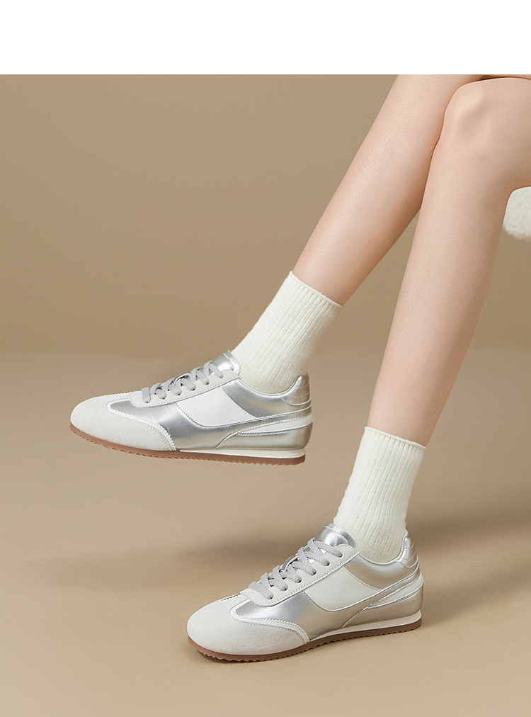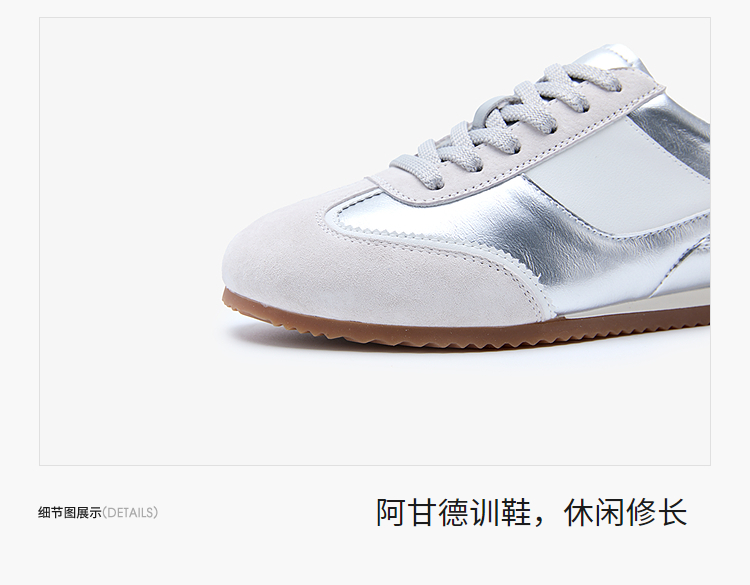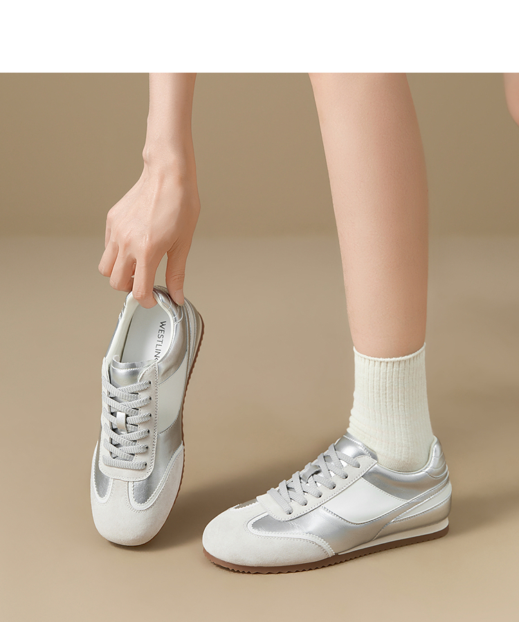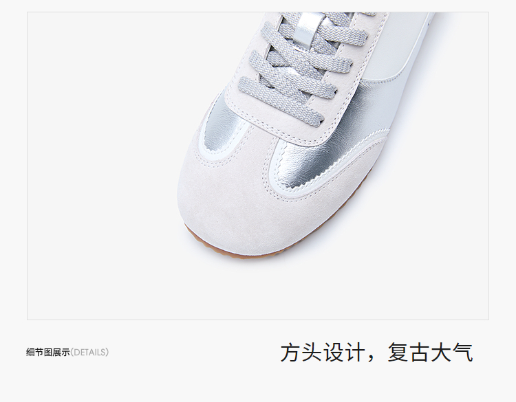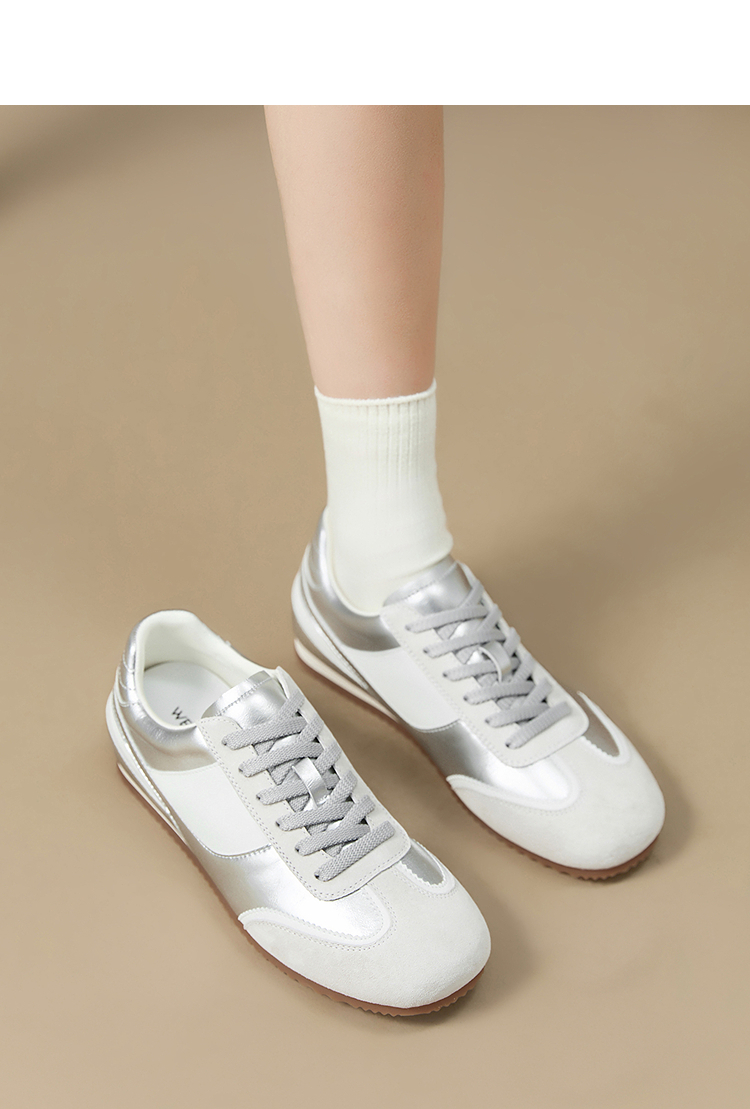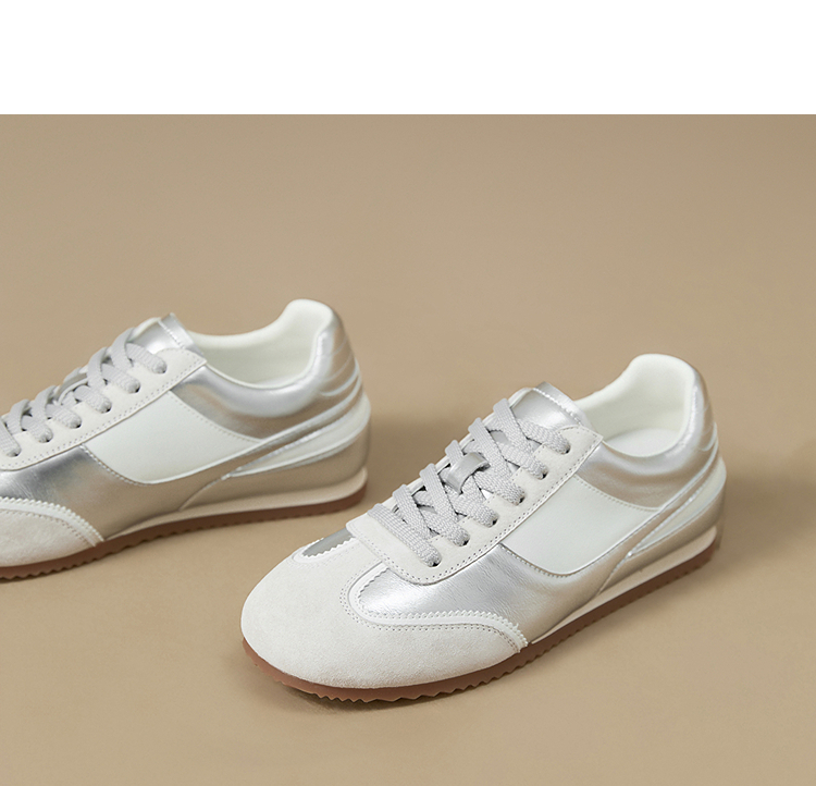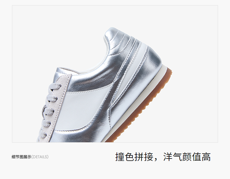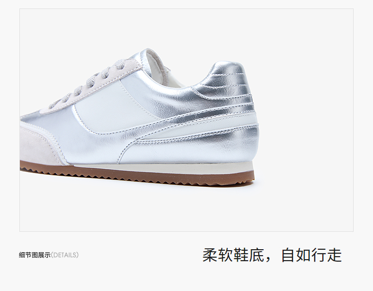西遇平底德训鞋女新款秋季复古小白鞋轻便薄底银色休闲运动鞋V1656961