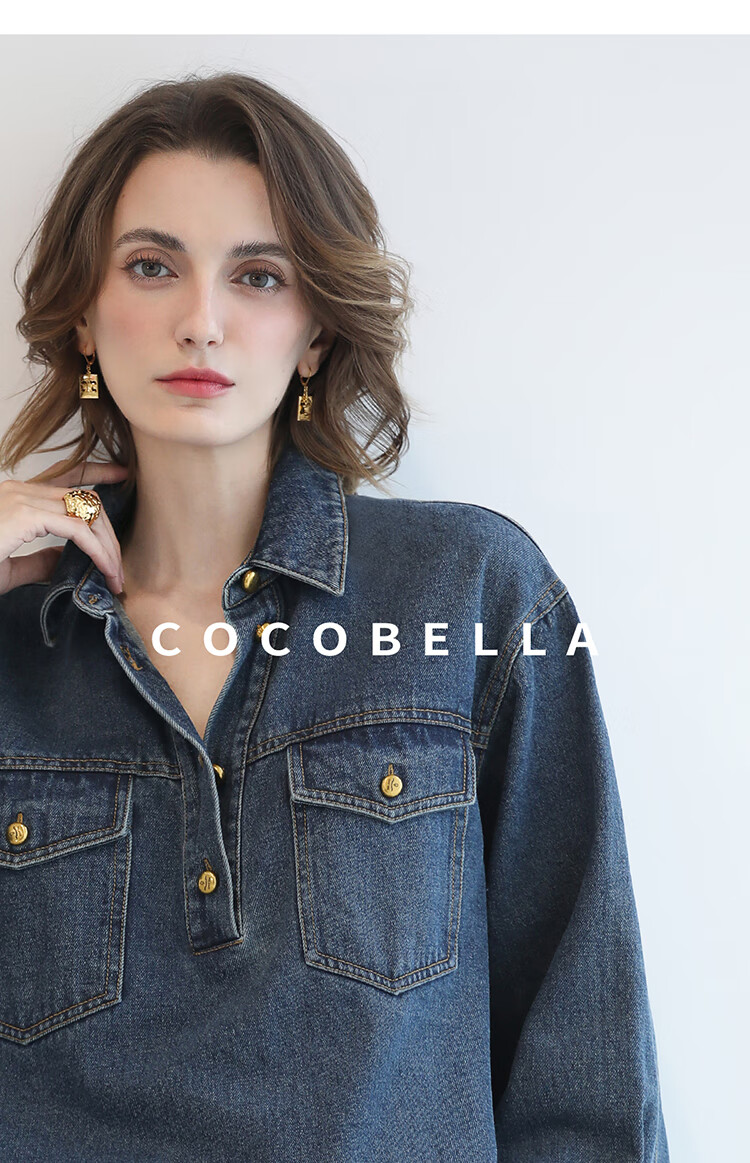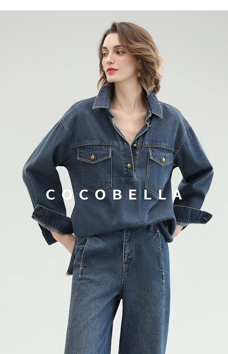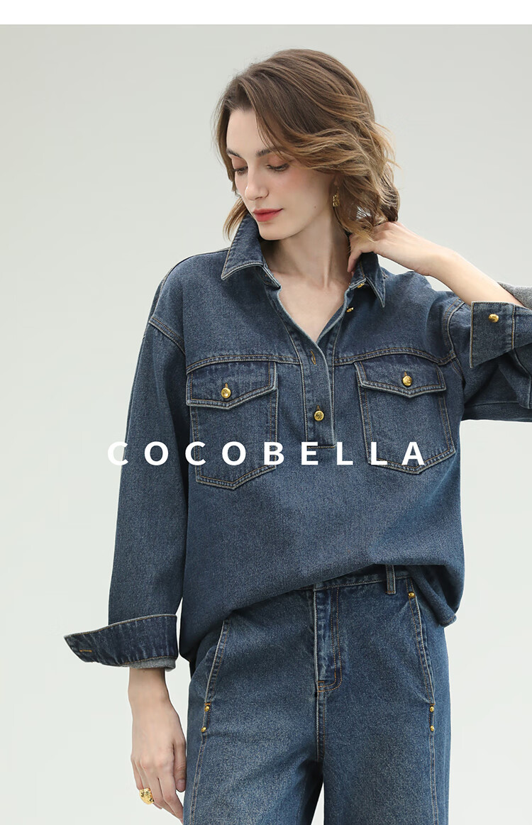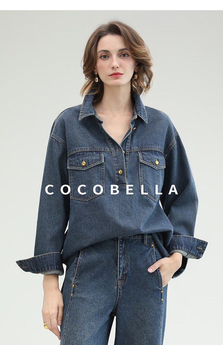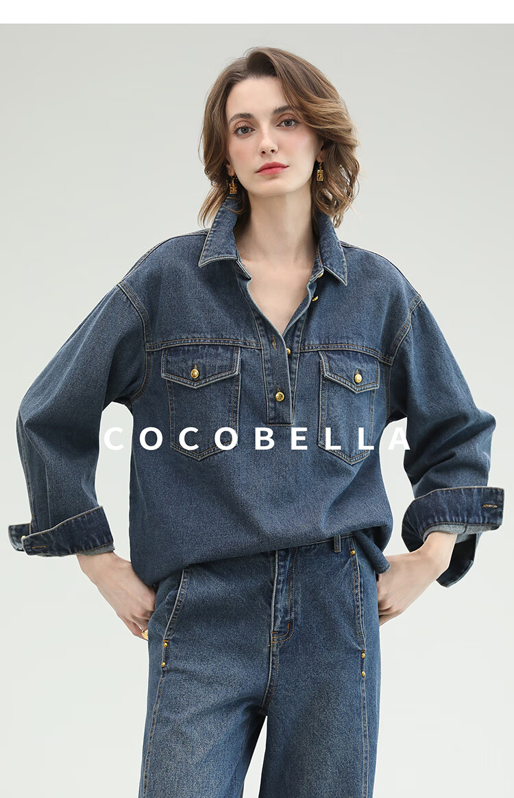 【限时秒杀】COCOBELLA环保水洗手工毛边原色牛仔衬衫金扣内搭衬衣DN3005
