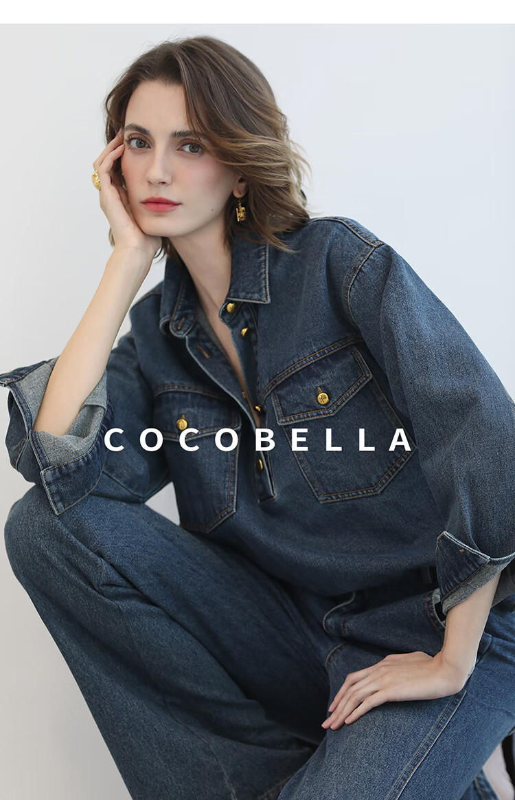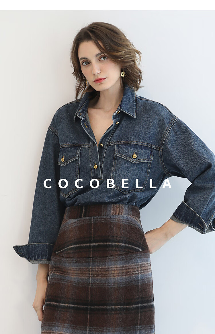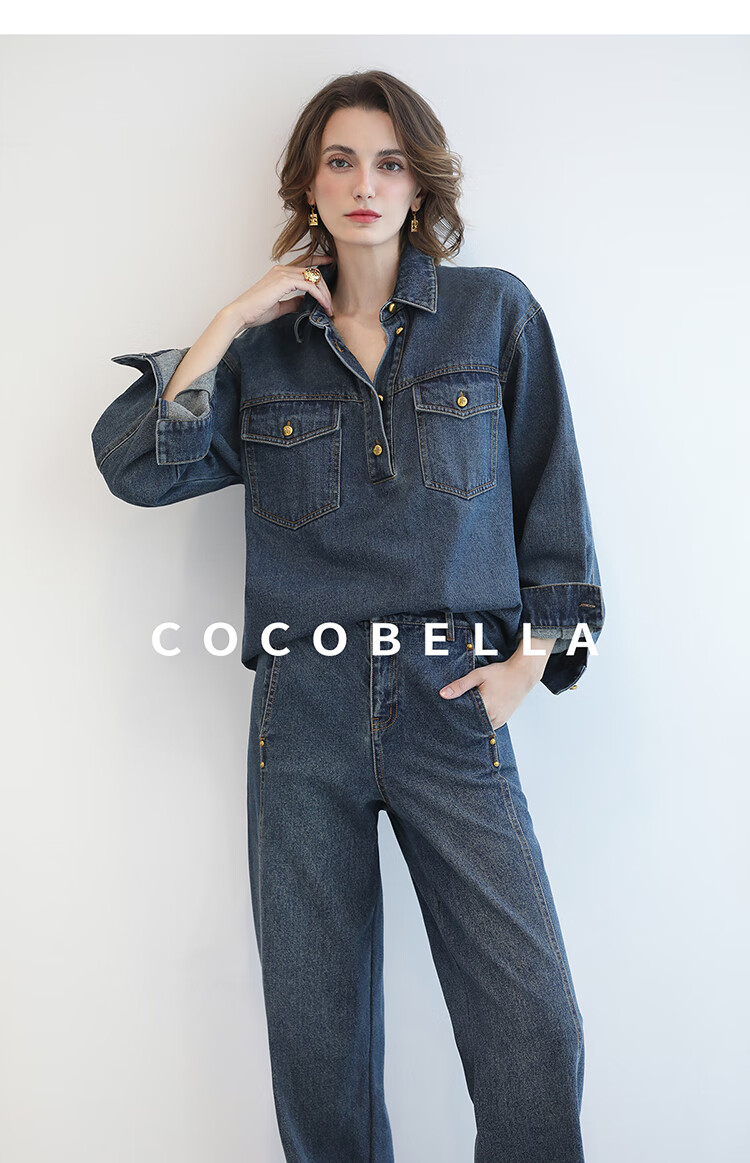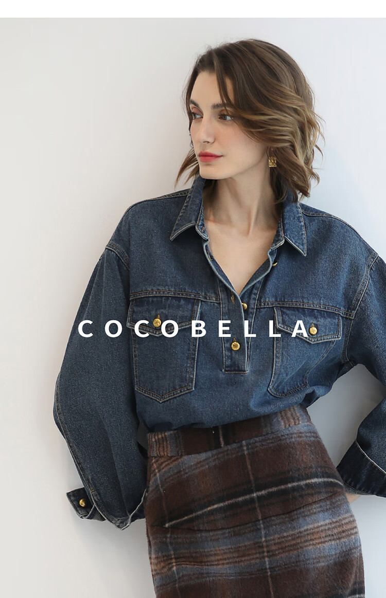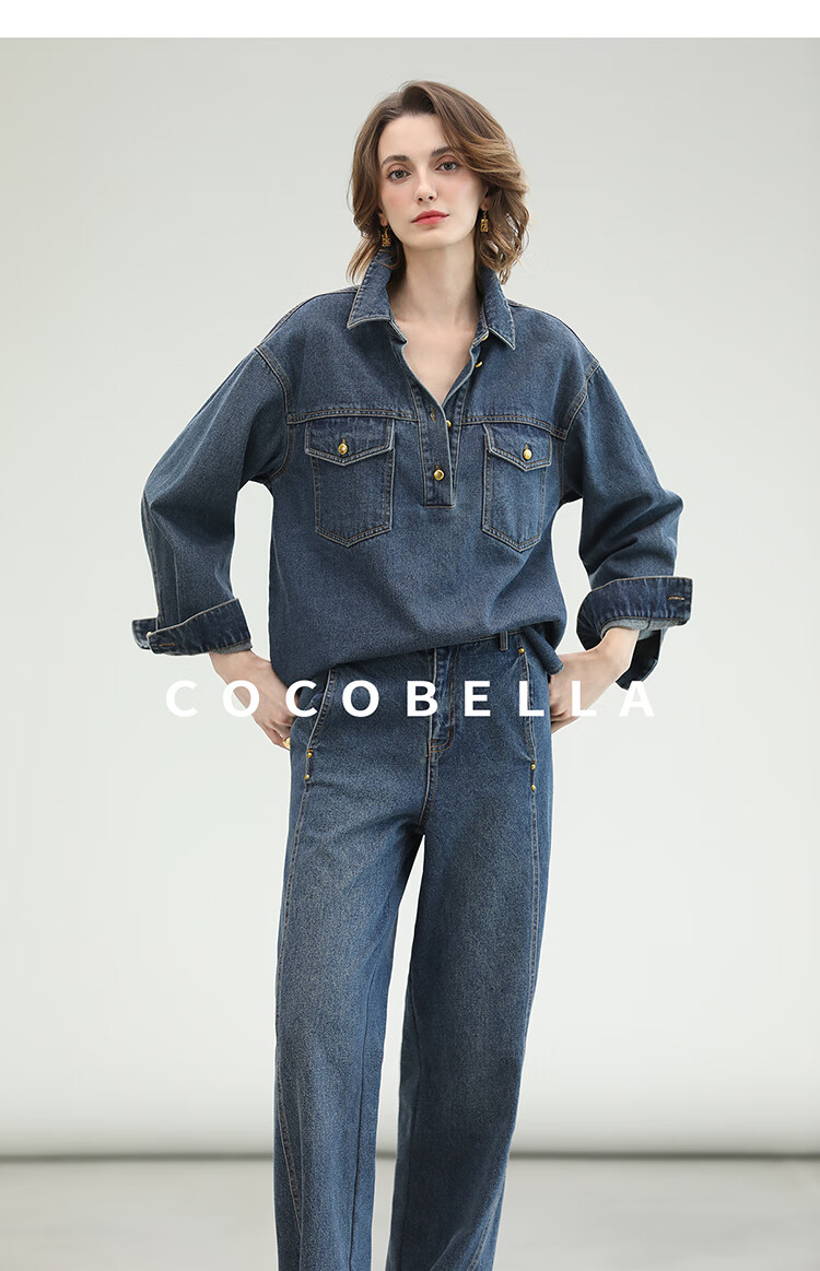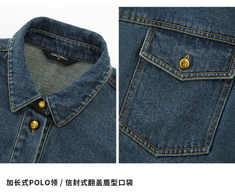 【限时秒杀】COCOBELLA环保水洗手工毛边原色牛仔衬衫金扣内搭衬衣DN3005