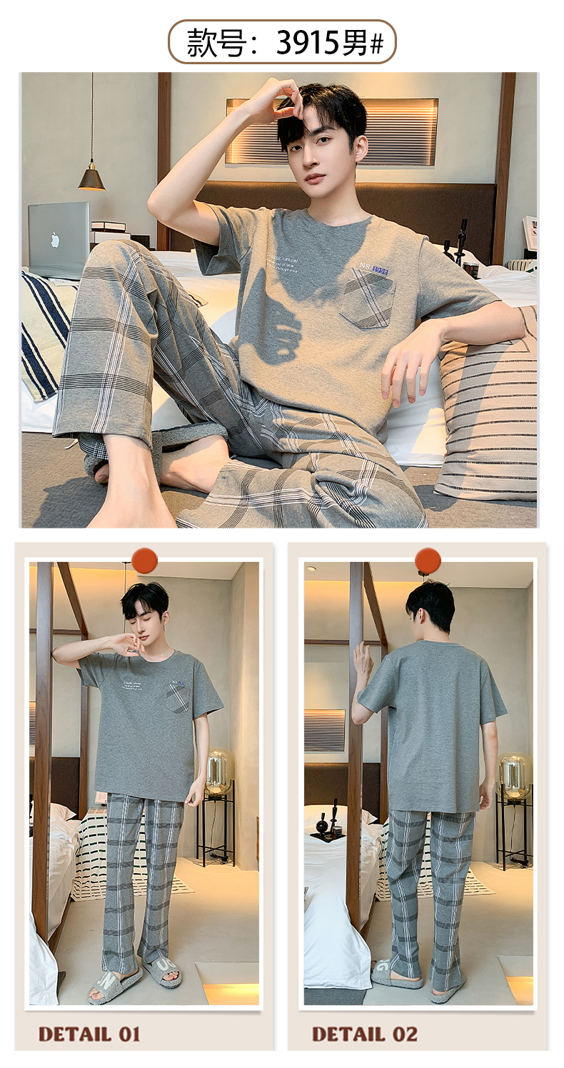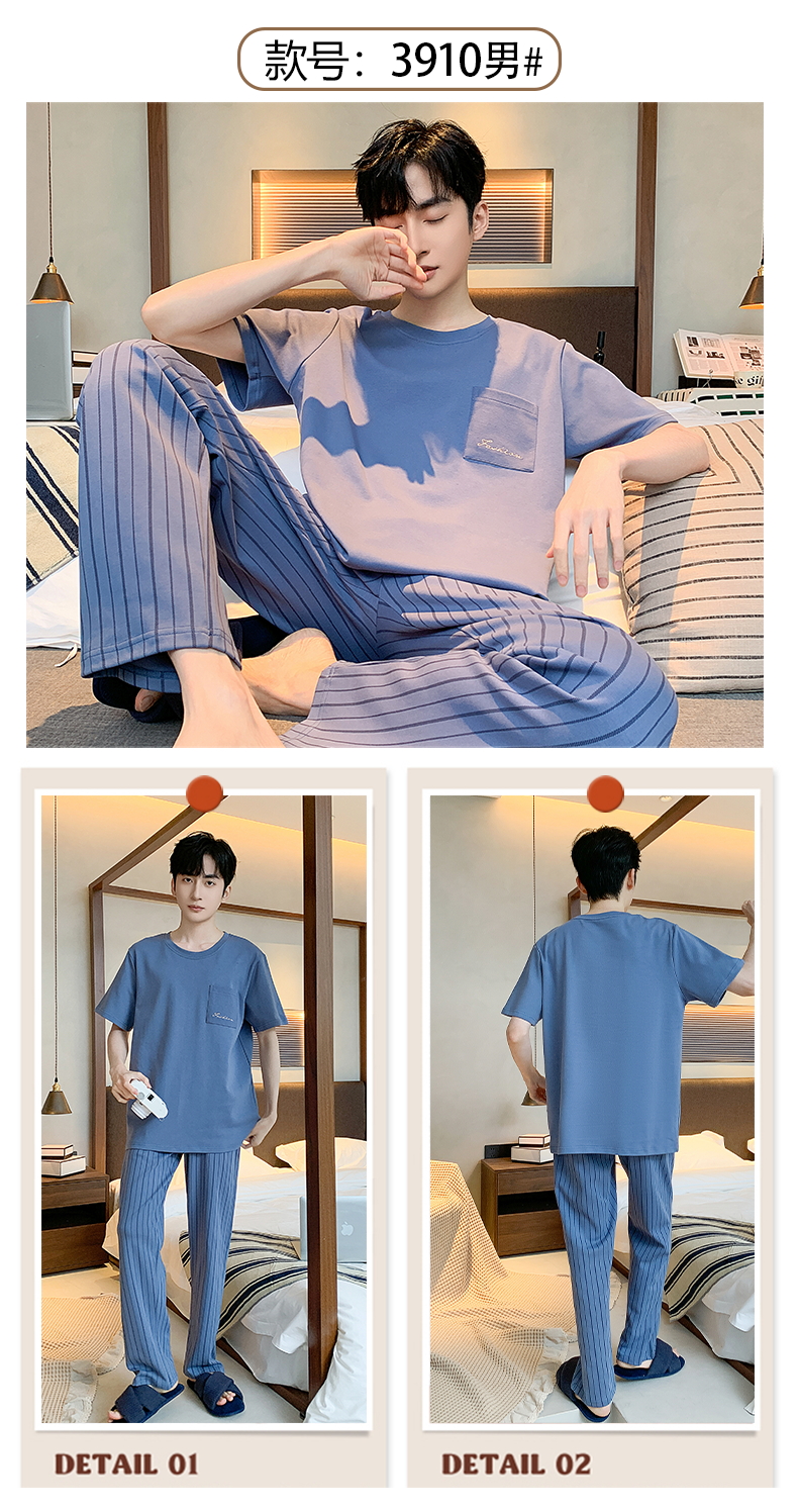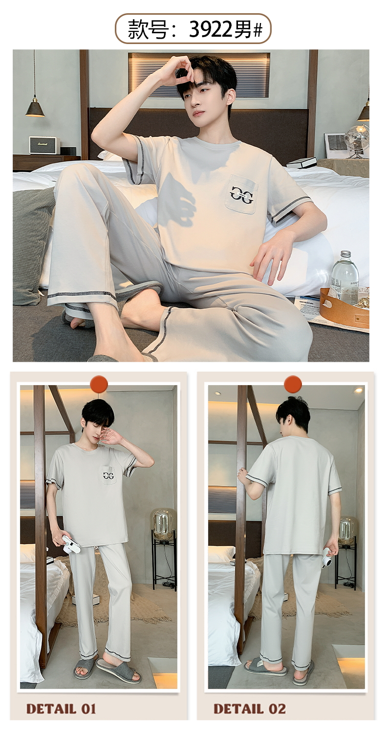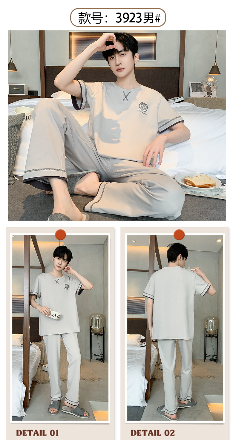 自然醒流素睡衣男士夏季薄款针织棉短袖长裤家居服春秋天青年大码套装QH