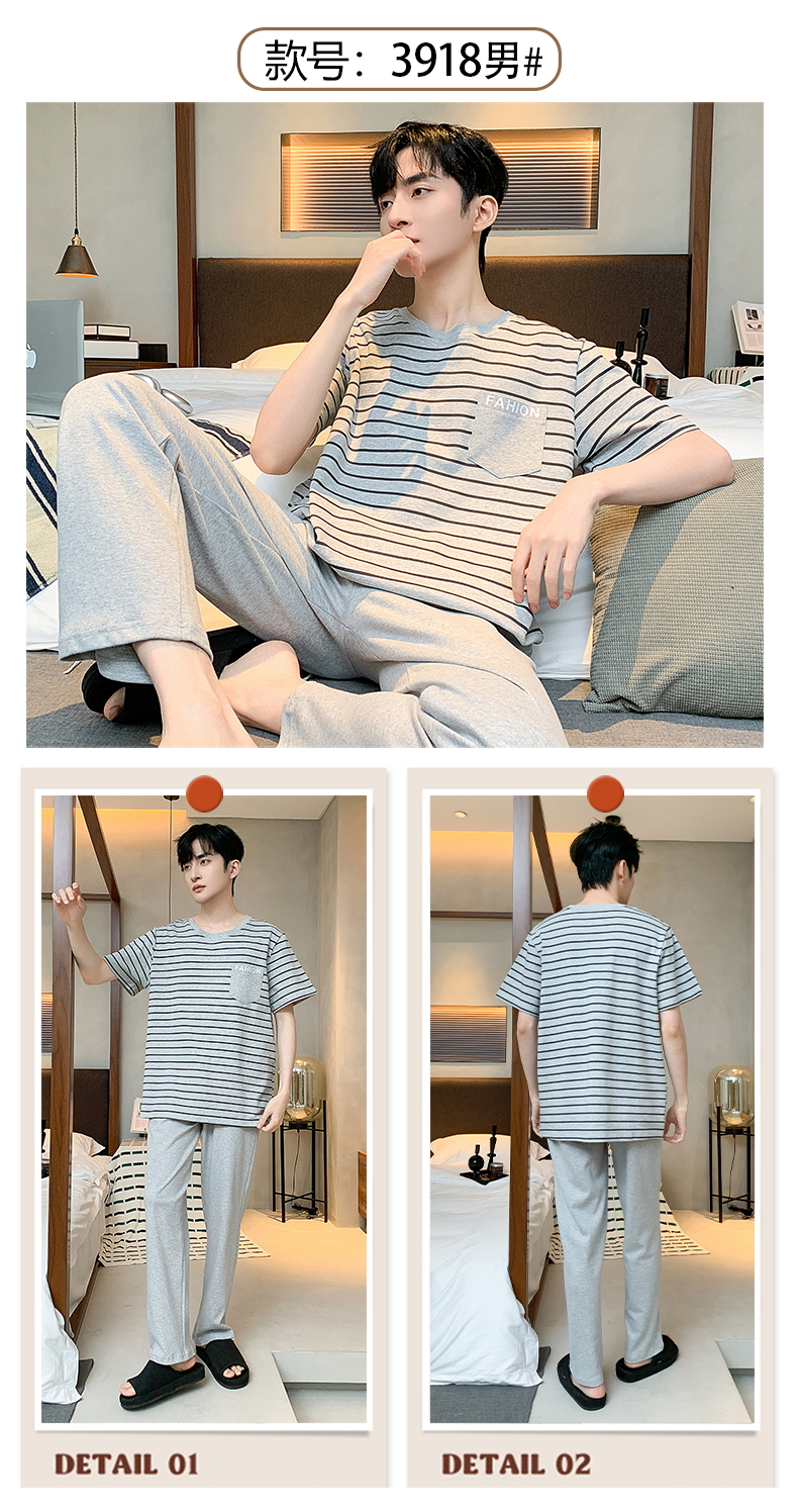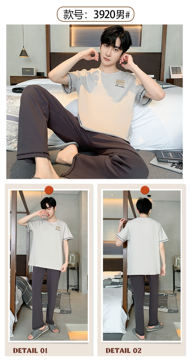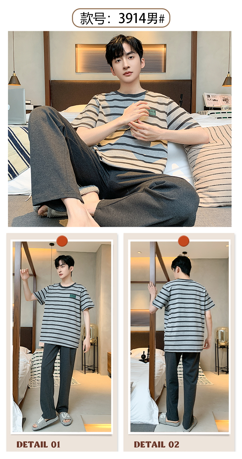 自然醒流素睡衣男士夏季薄款针织棉短袖长裤家居服春秋天青年大码套装QH