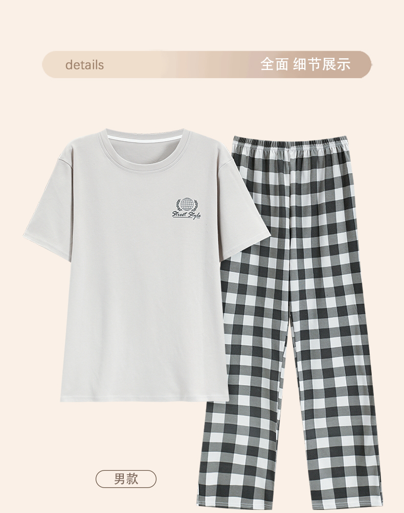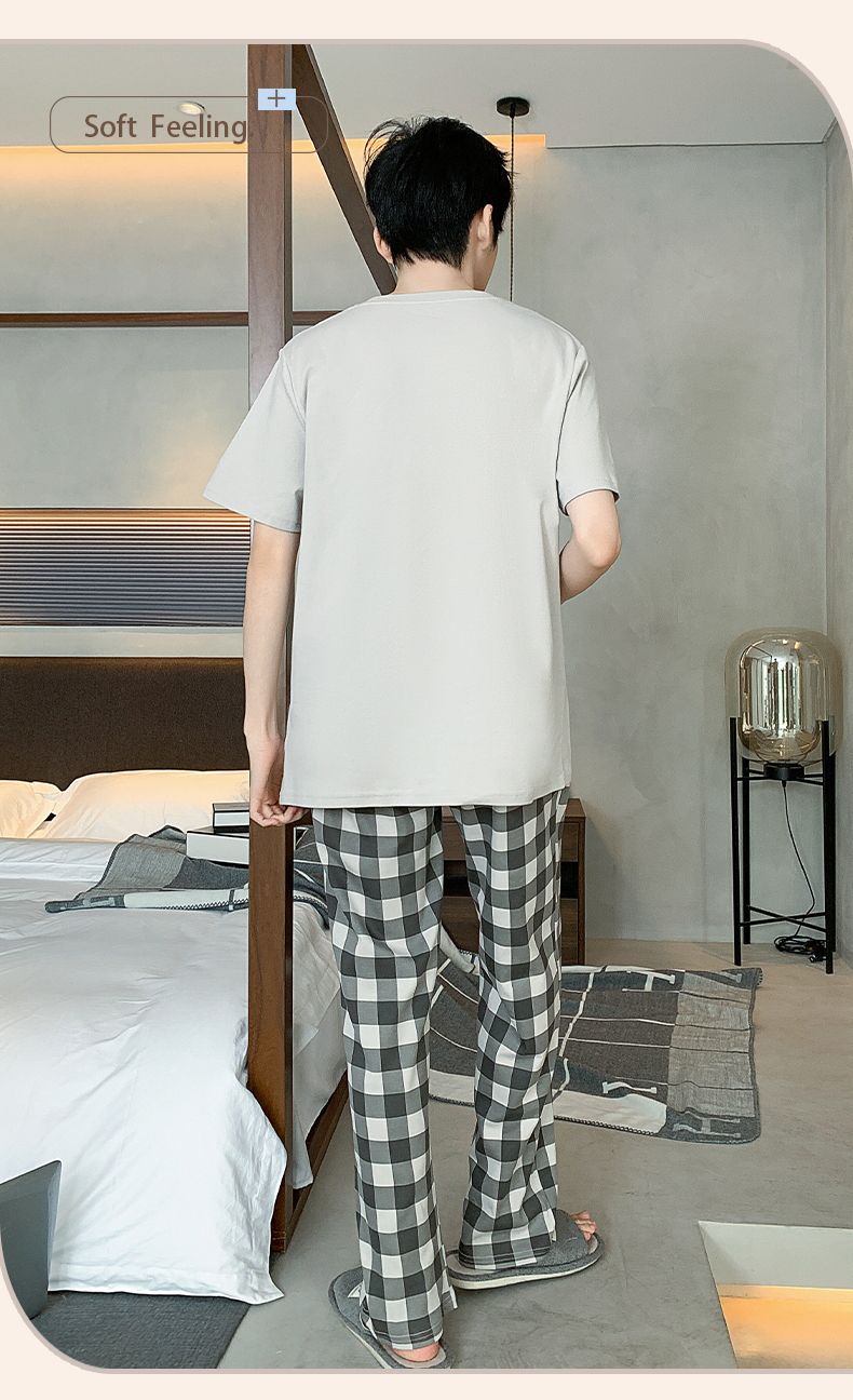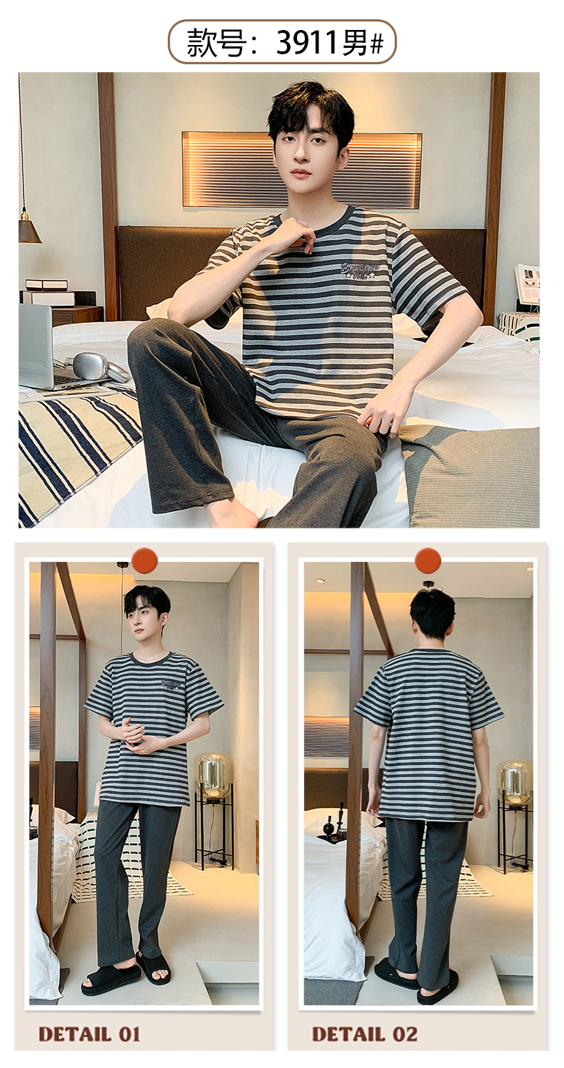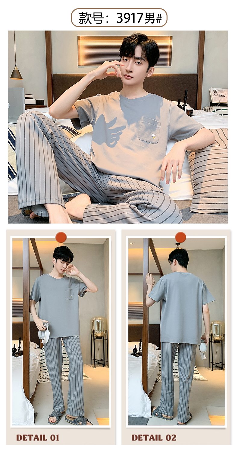 自然醒流素睡衣男士夏季薄款针织棉短袖长裤家居服春秋天青年大码套装QH