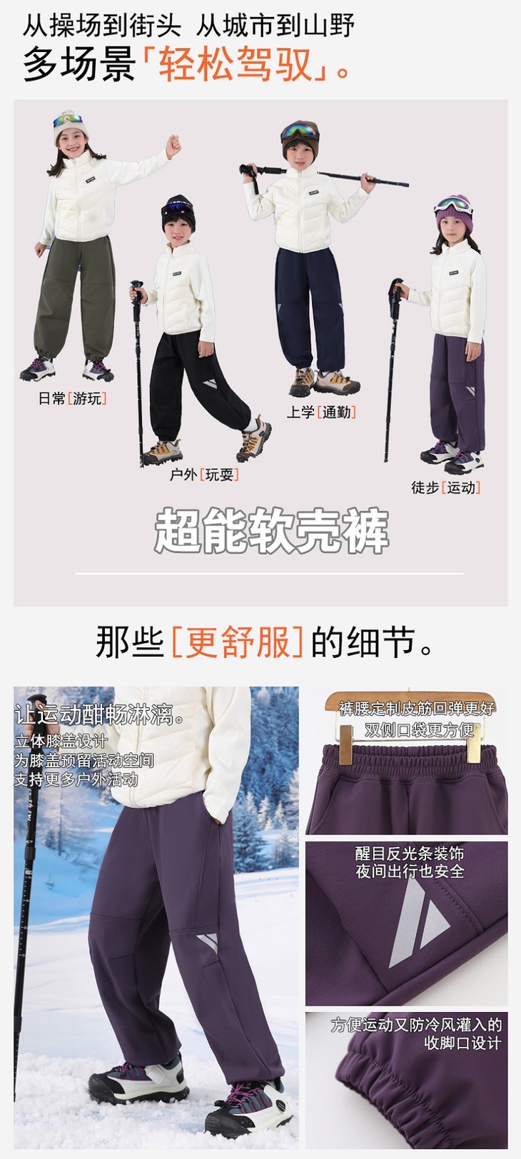 【保暖服饰 |儿童加绒软壳防风裤 】可穿至170码,整体面料柔软亲肤,速干防风厚实锁暖,耐磨抗造但不闷,三角标反光条,提升安全性更亮眼,立体膝盖设计活动自由,简约百搭,多场景都适合