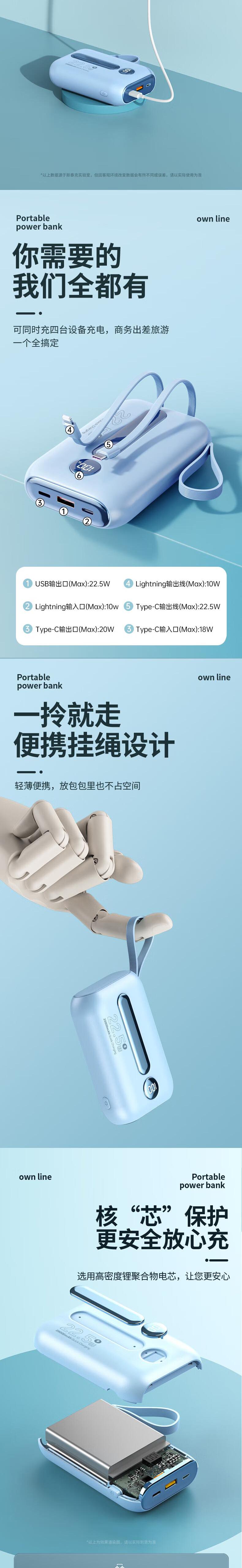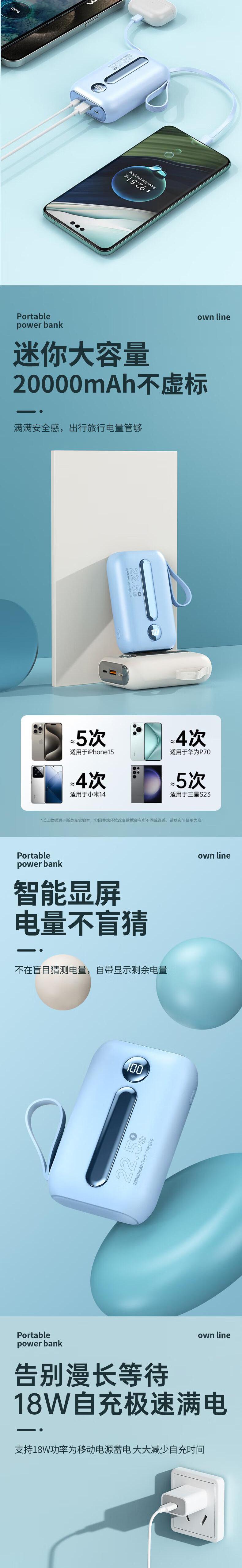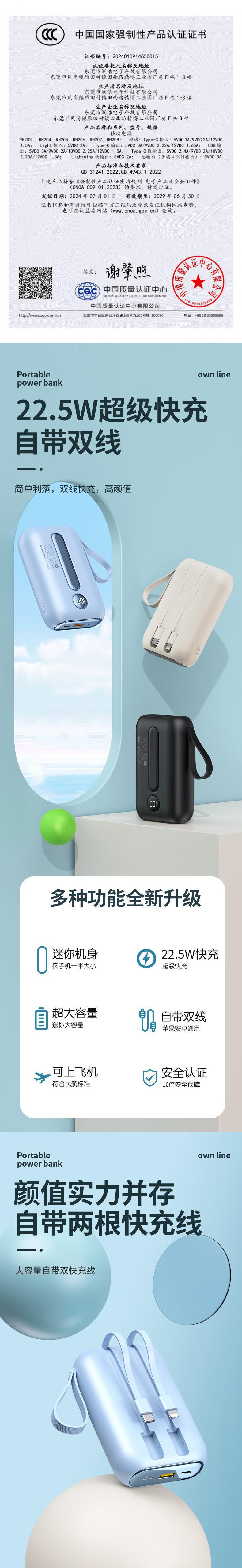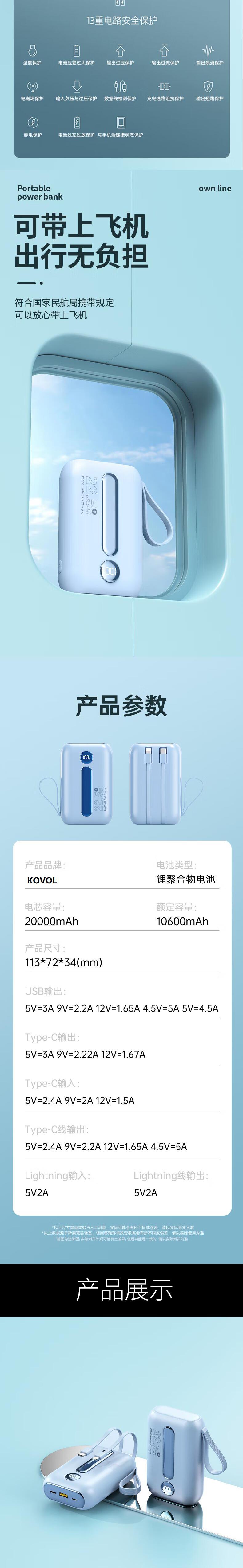 科沃RH203移动电源充电宝自带2线2万毫安3C认证快充可上飞机大容量