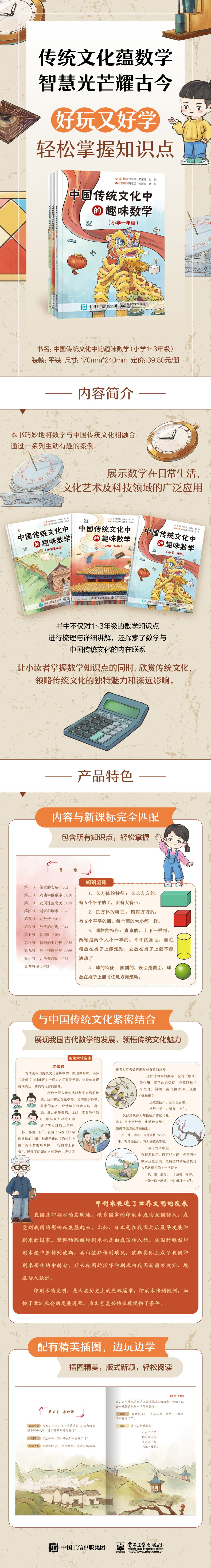 本书将小学一到三年级2022版数学课程标准要求的学科知识与中国传统文化相结合,让小学生在阅读过程中发现传统文化中的趣味数学,既让小学生了解传统文化,巩固课标中的数学知识,又增强学生的爱国情怀和民族自豪感,培养数学思维与素养,增强学习数学的兴趣。针对二年级的阅读读物主要内容如下:九章算术中了解长度单位的产生与发展,通过九九歌中进一步认识乘法,从日晷中发现的时间奥秘,从中国传统服饰中发现搭配的美,从算盘中认识计数工具,通过盲人摸象思考观察的角度,认识生活中的角,从剪纸、脸谱、铜镜、纹锦、瓷器花纹、年画等传统工艺中发现对称美,从中国古代记账方法中发现统计的意义,认识质量单位的产生与发现,通过幻方与古代“名侦探”认识有趣的推理。