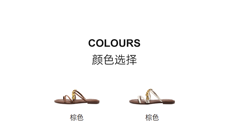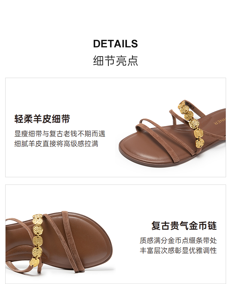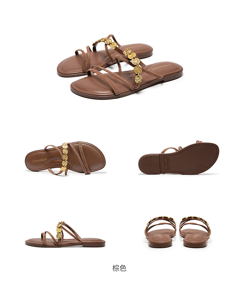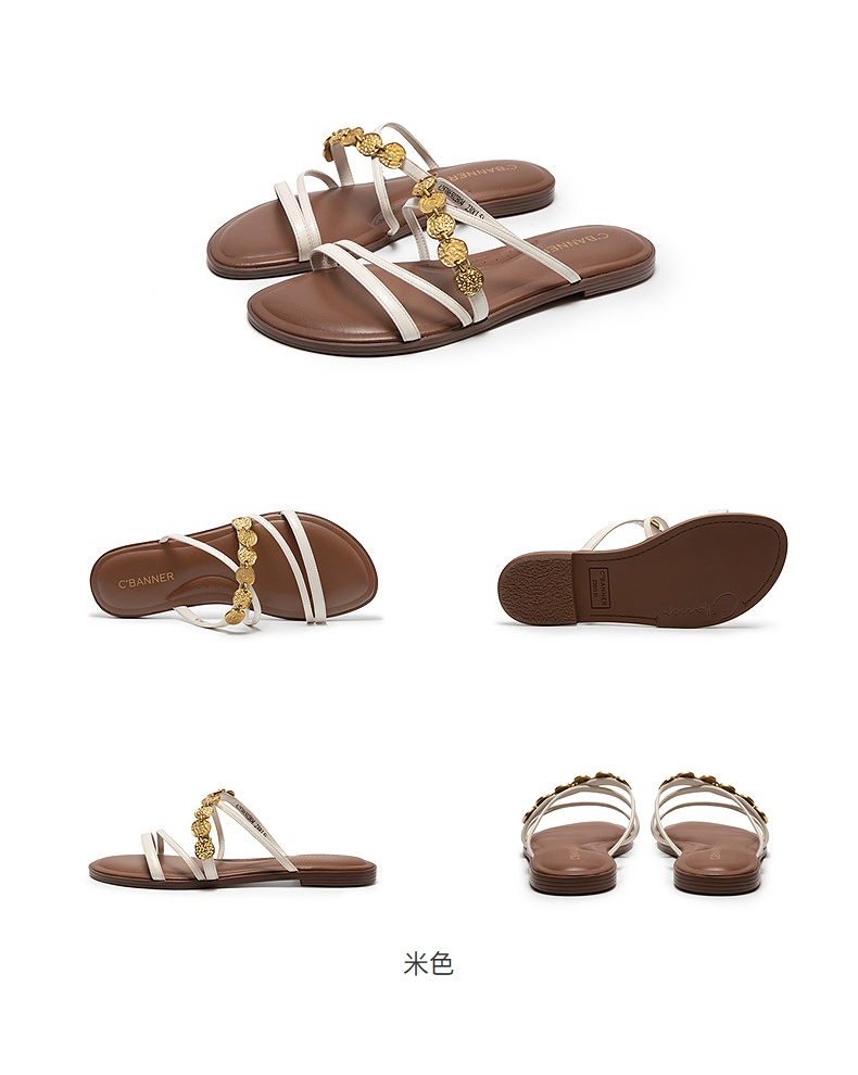 千百度复古金币链平底一字拖女羊皮外穿露趾凉拖鞋A25386502