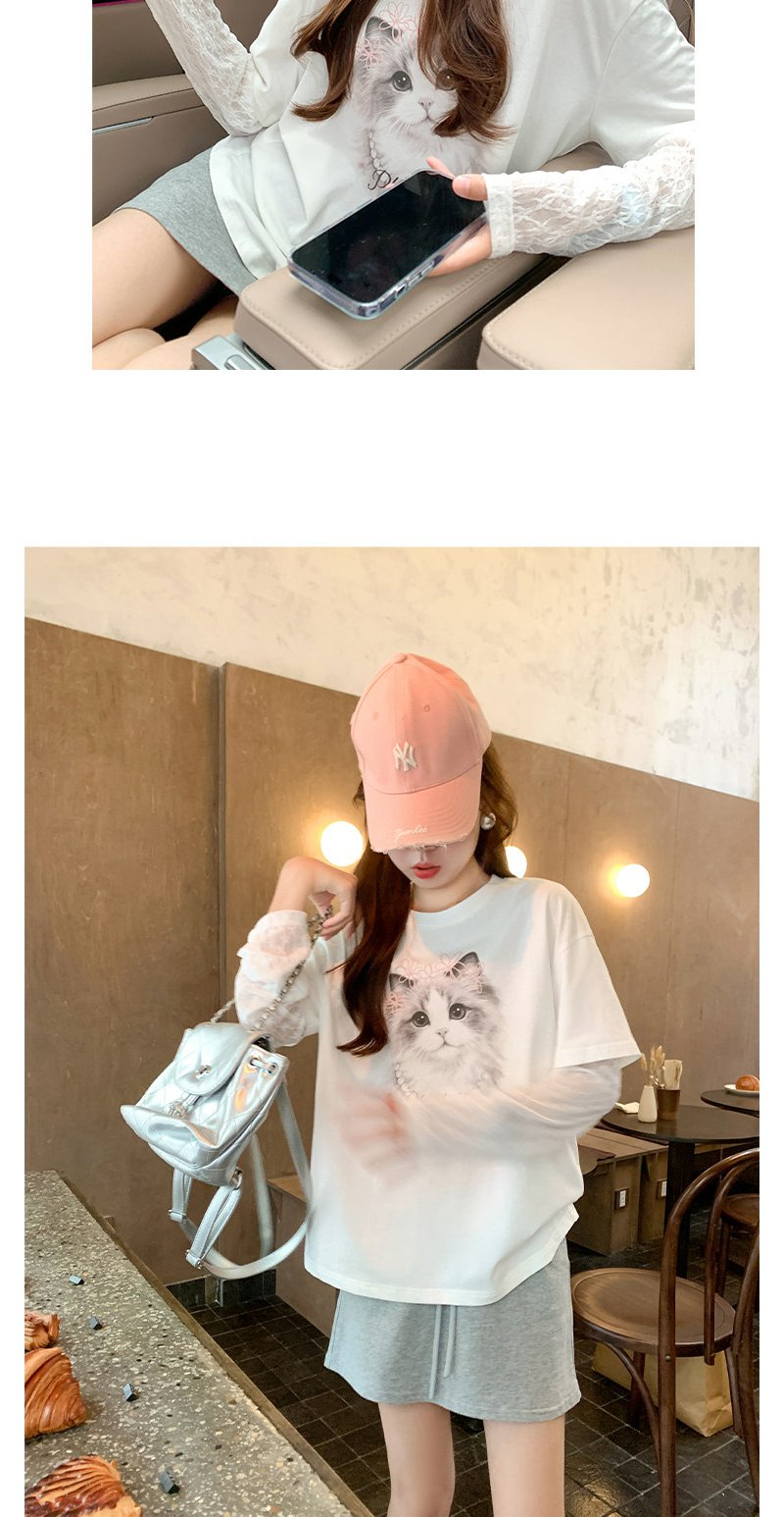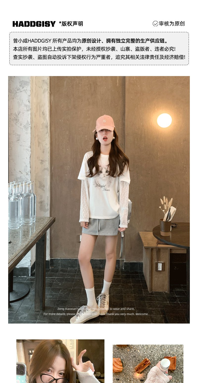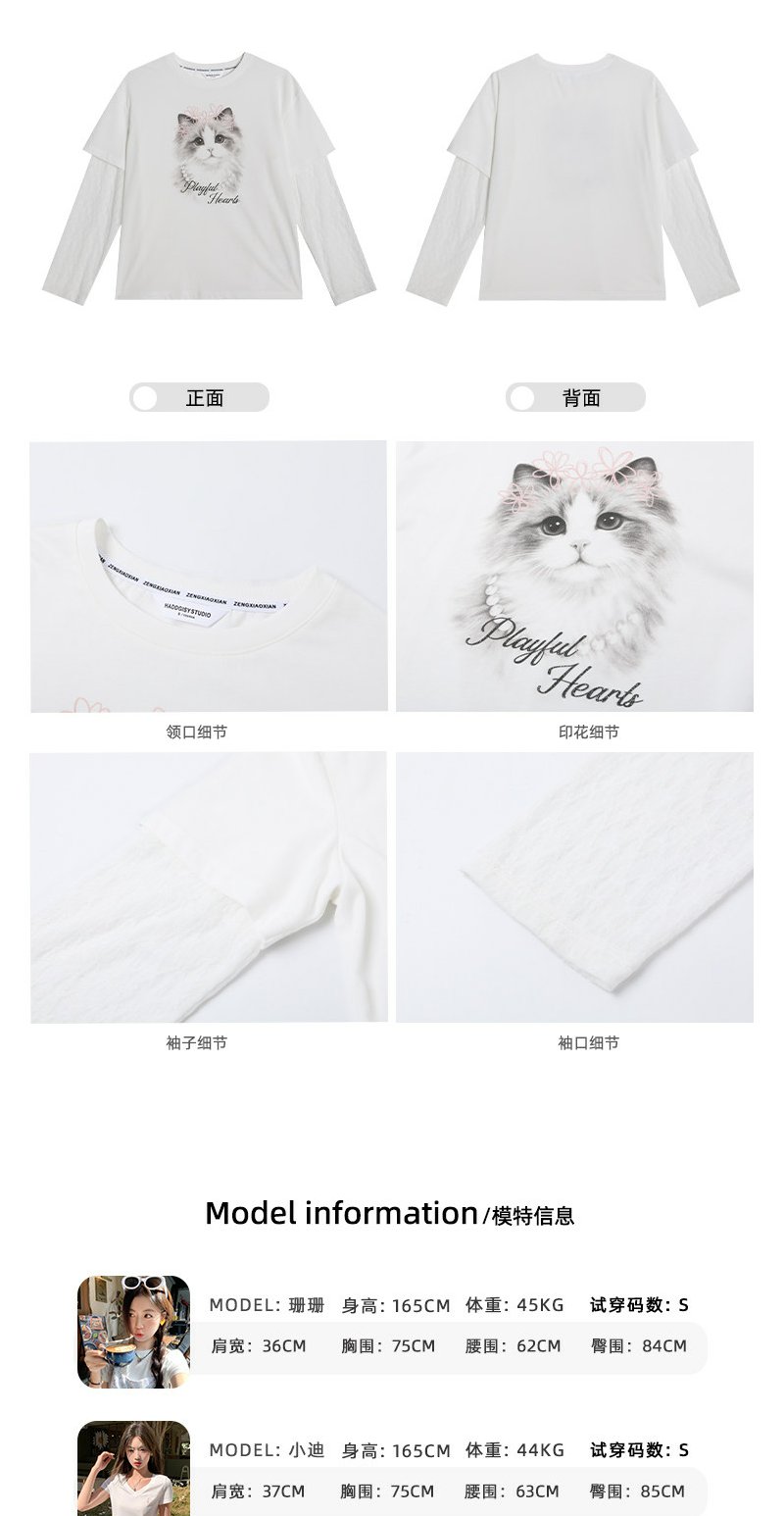 <曾小咸推荐>韩系假两件猫咪印花长袖t恤女