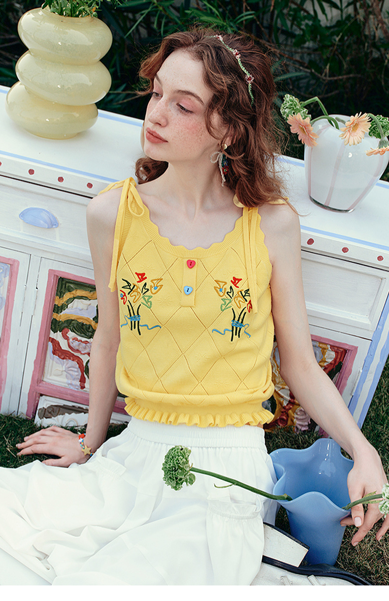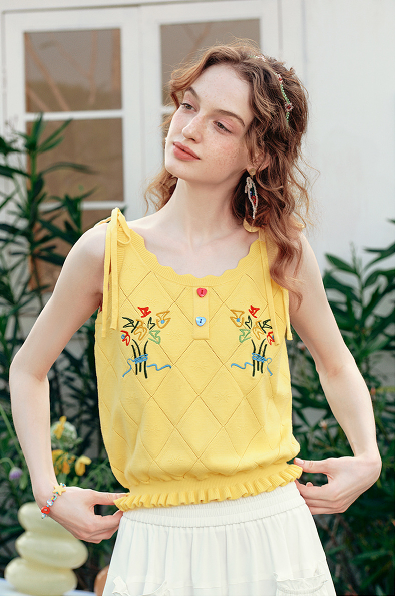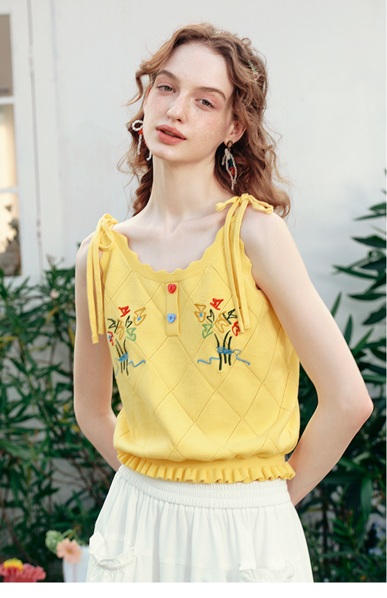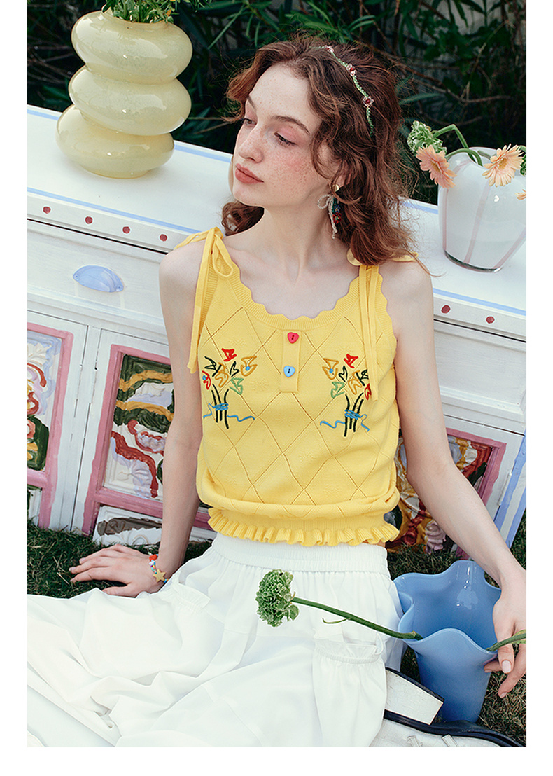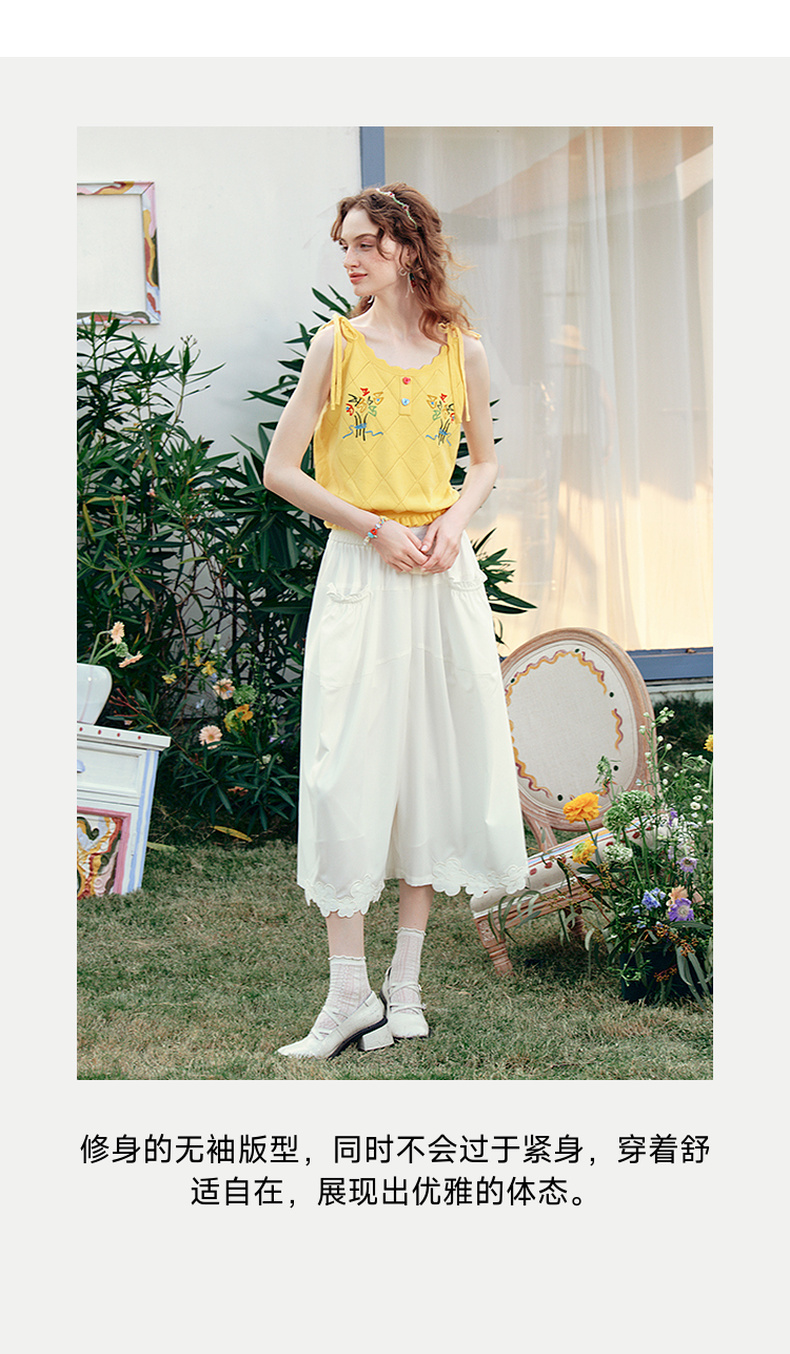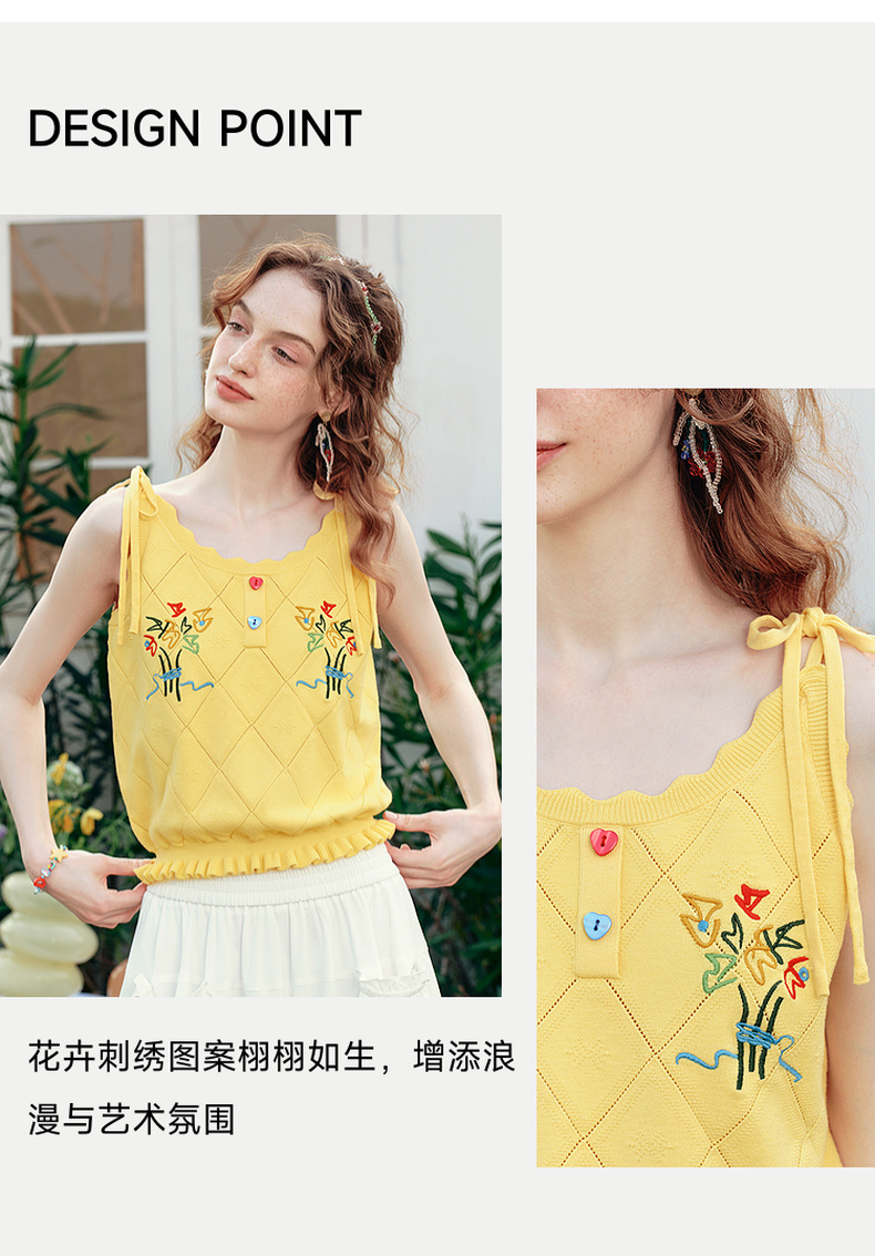 两三事 童谣乐园 2025夏季新款小清新木耳边下摆刺绣吊带针织衫女